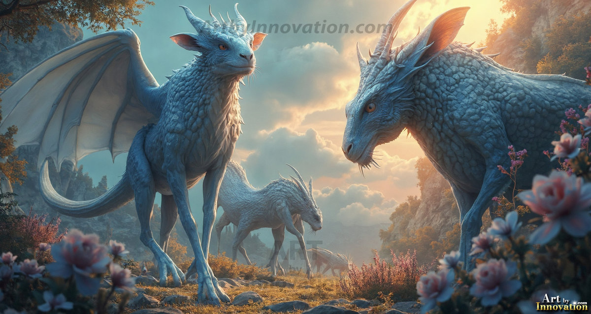 The Fantasy Artwork Collection, vibrant and detailed fantasy photographs of an alien planets, where every element appears meticulously crafted from iridescent stained glass. Magical enchanted forests with adorable little creatures. The Dragon God Bahamut Dominates the Sky, passing Devine Judgment. Amazing fantasy photographs of a unicorns, capturing the essence of the unicorn as runs through a mountainside meadows.