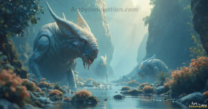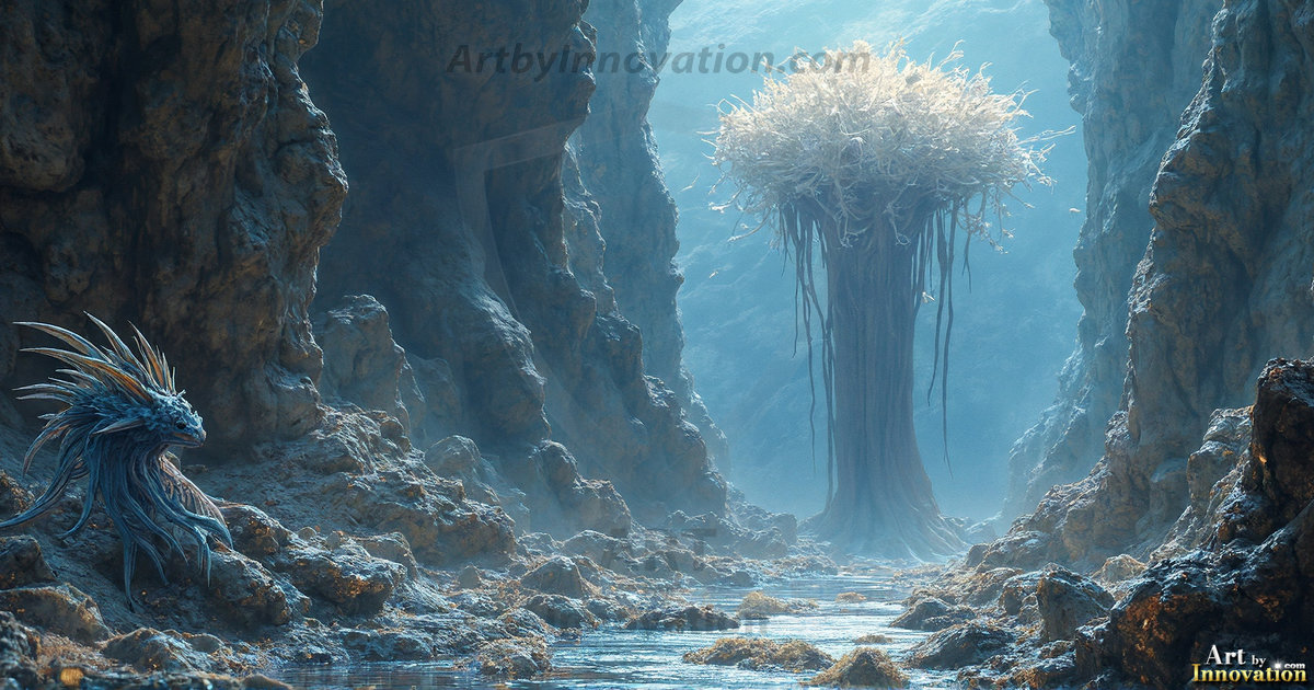 AI-generated alien planet art featuring exotic creatures, bizarre flora, and breathtaking extraterrestrial landscapes.