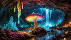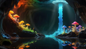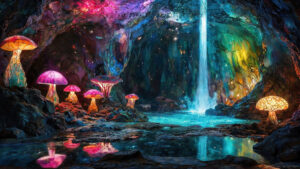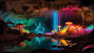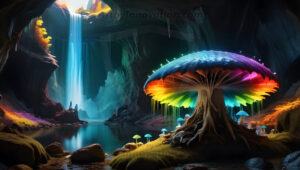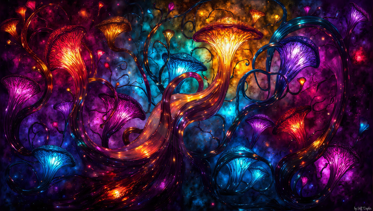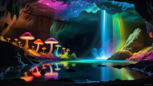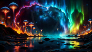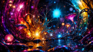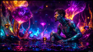 AI-generated abstract art — beautiful handsome men enveloped by swirling vibrant rainbow color clouds and mists.