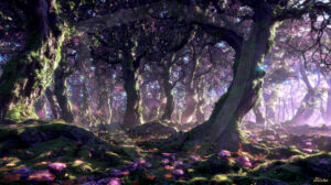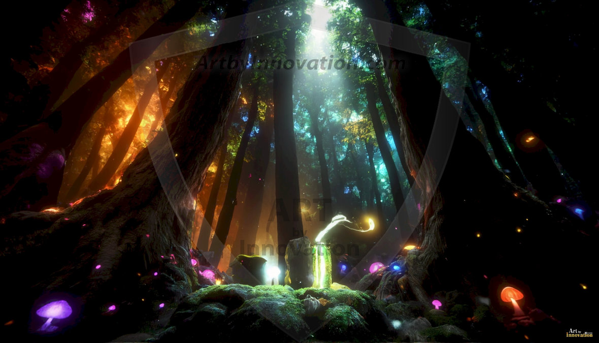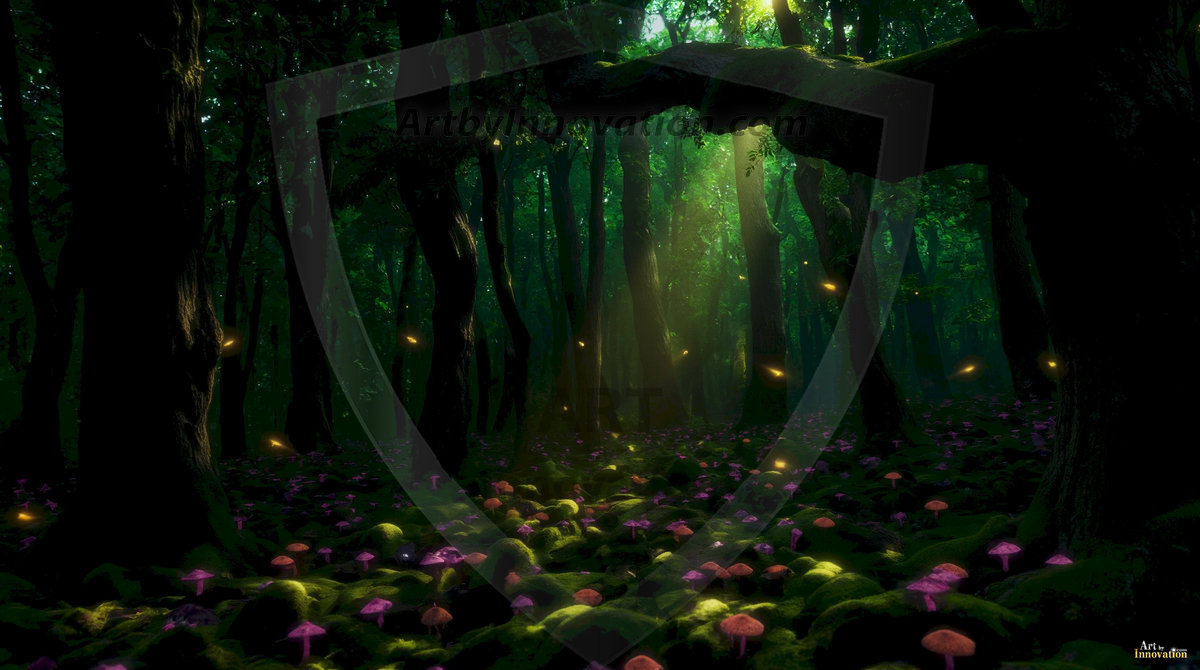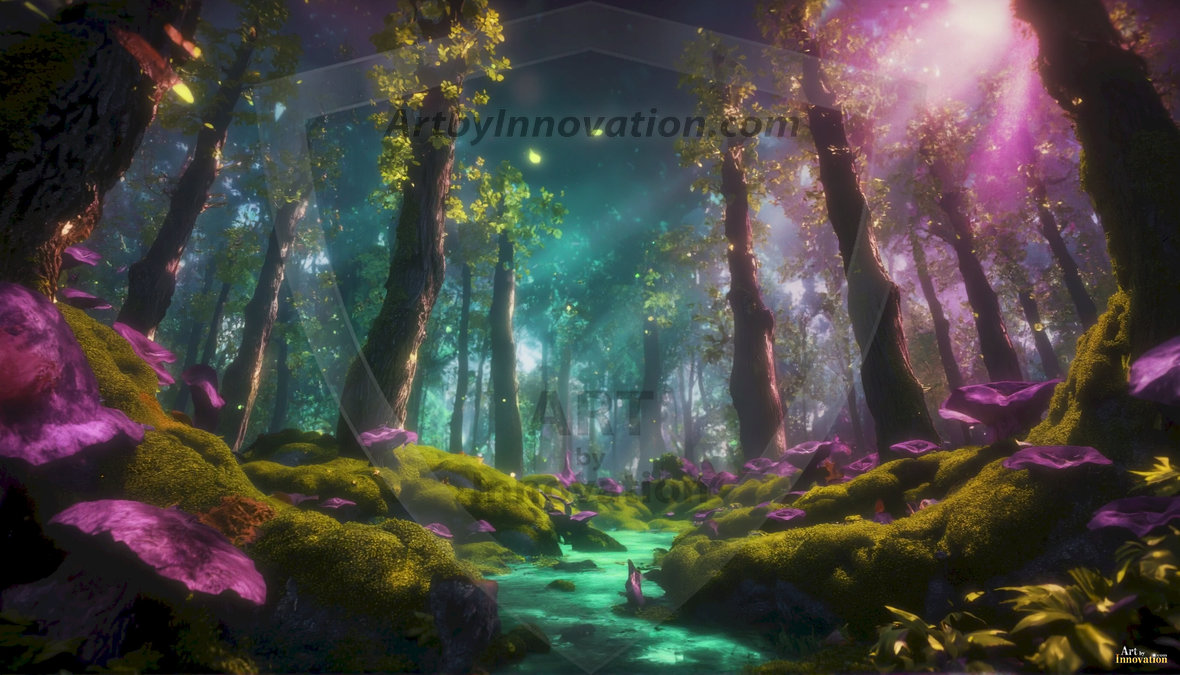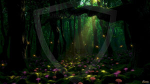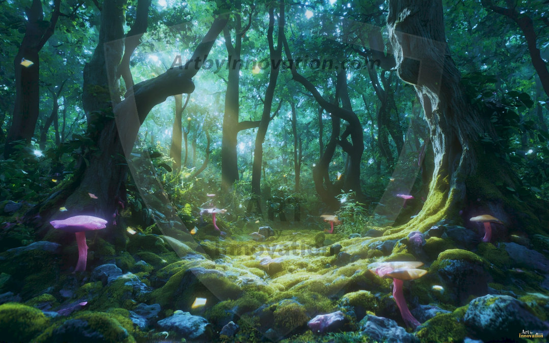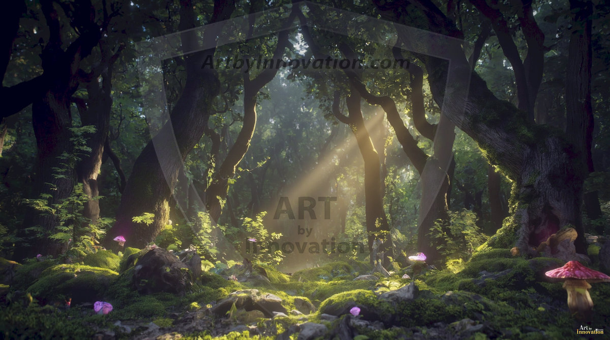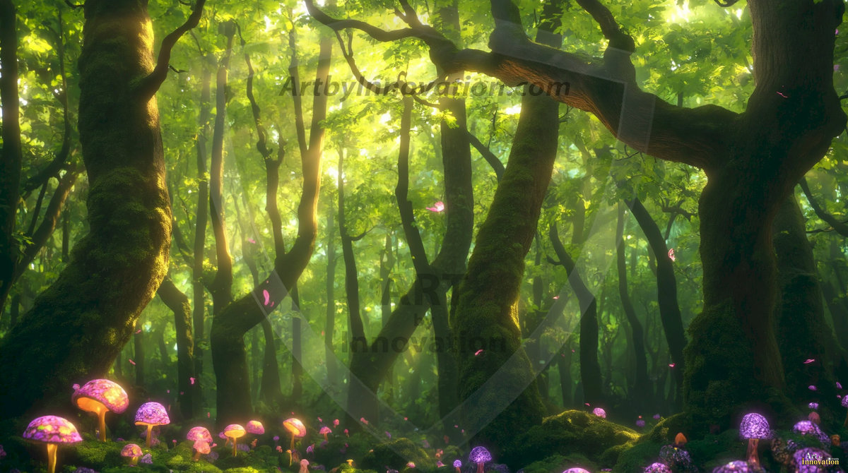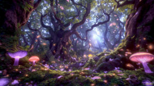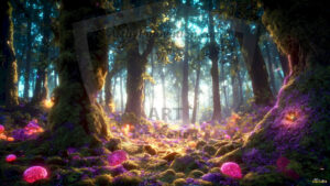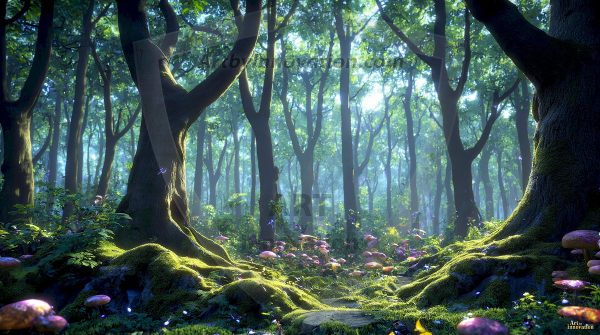 AI-generated mystical woodland art — enchanted forests with glowing mushrooms, ancient trees, and magical folklore atmosphere.