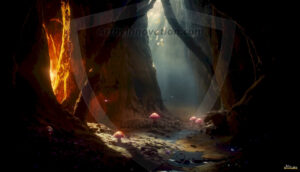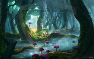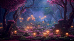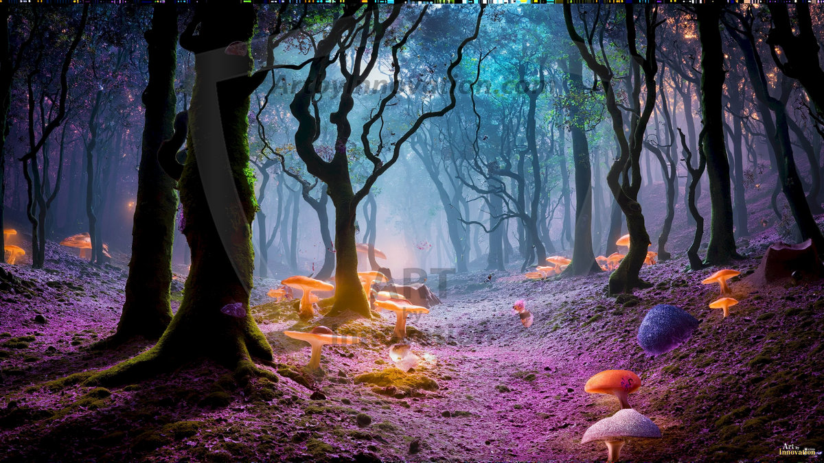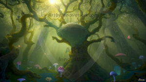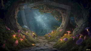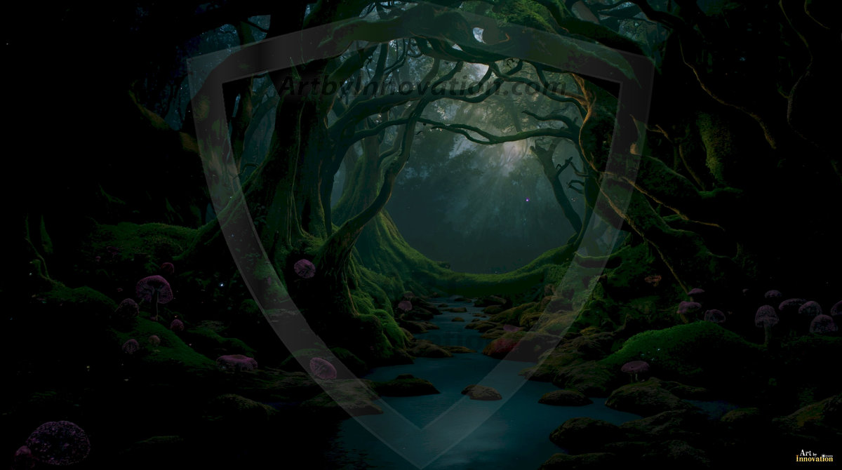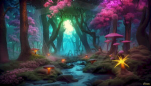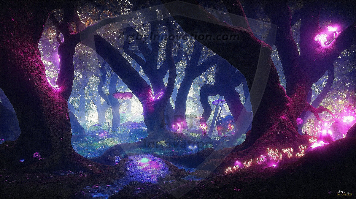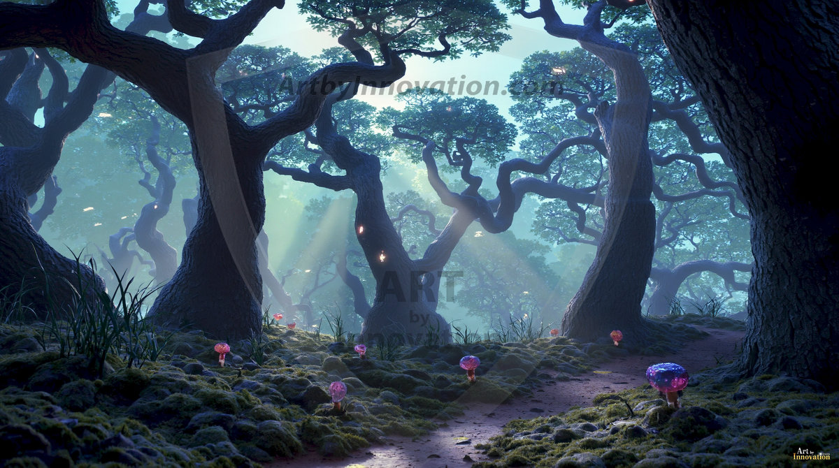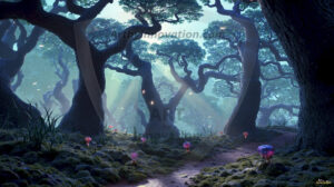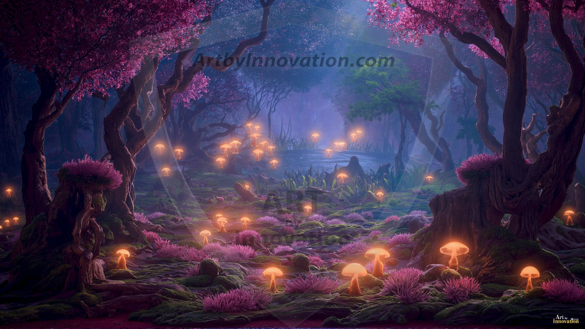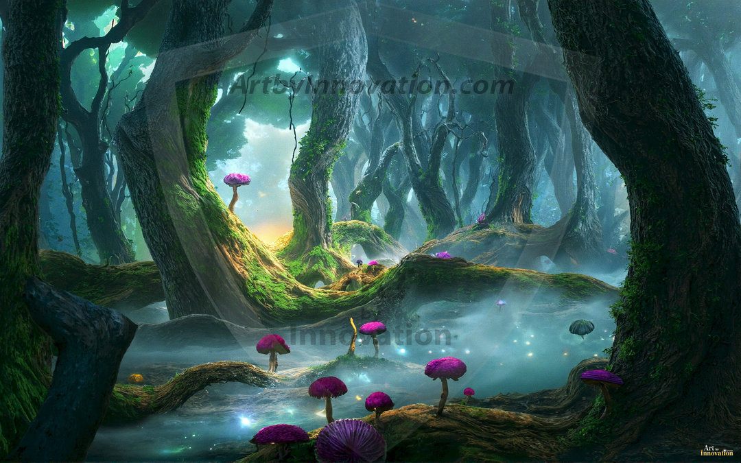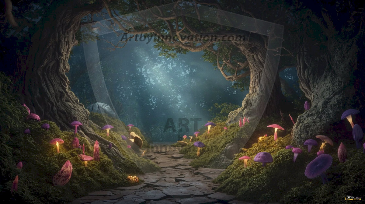AI-generated mystical woodland art — enchanted forests with glowing mushrooms, ancient trees, and magical folklore atmosphere.