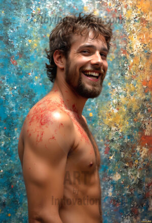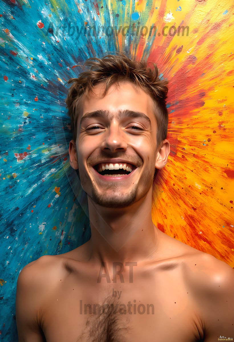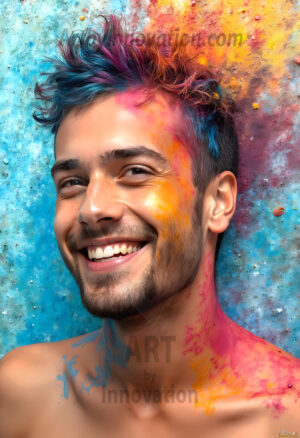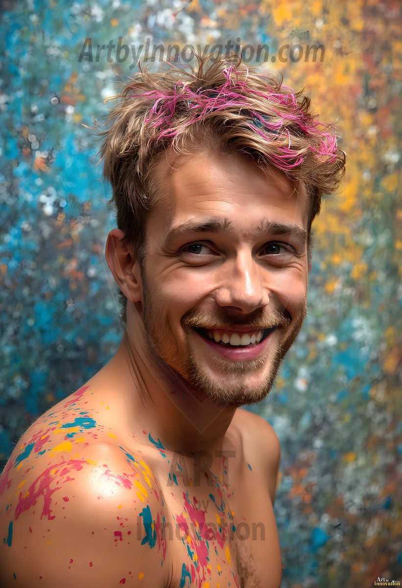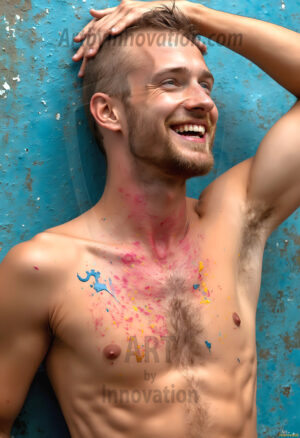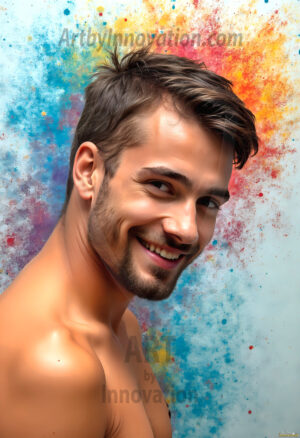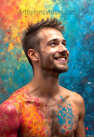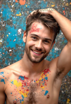AI-generated abstract art — hot handsome men covered in colorful body paint explosions, full of joy and rainbow color.
