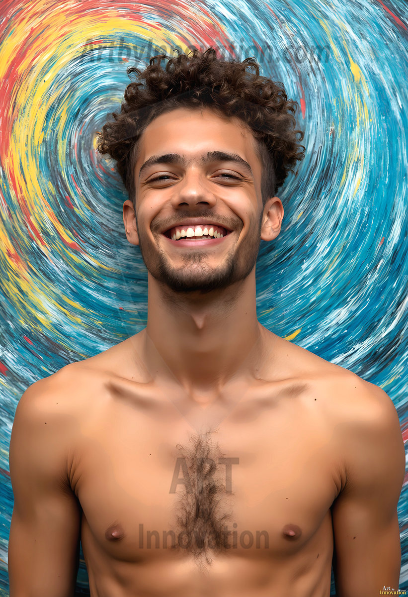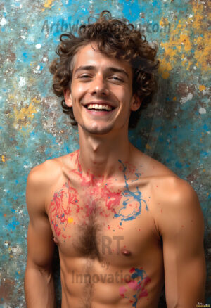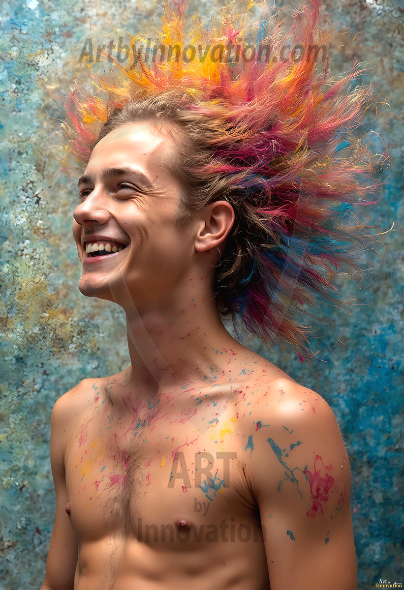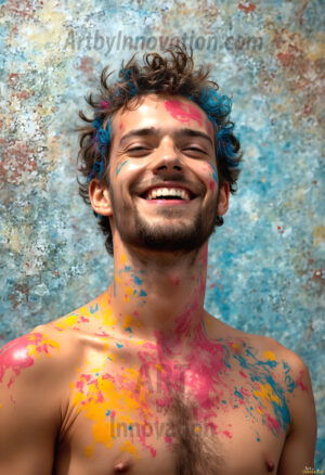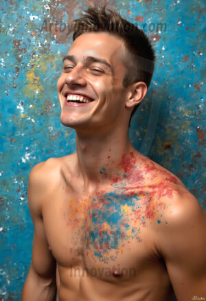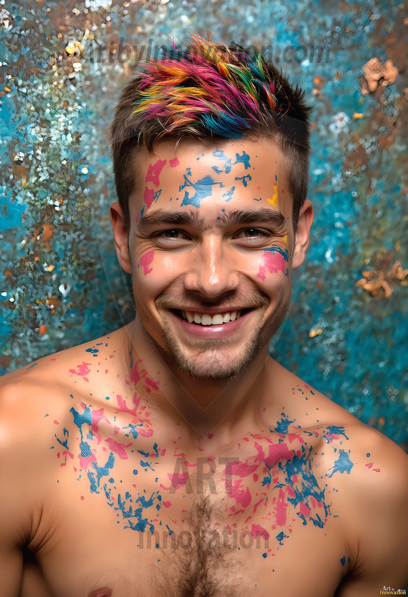 AI-generated abstract art — hot handsome men covered in colorful body paint explosions, full of joy and rainbow color.