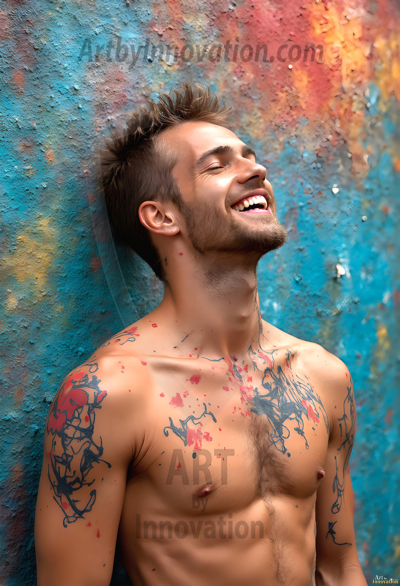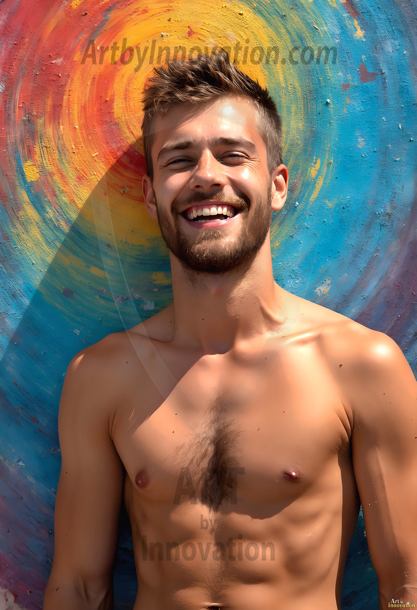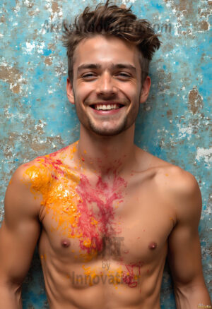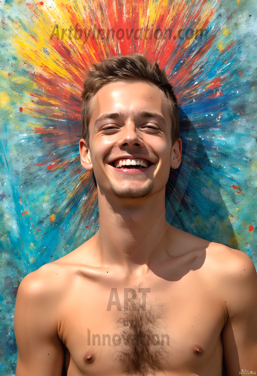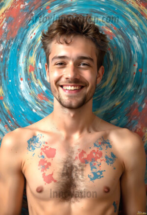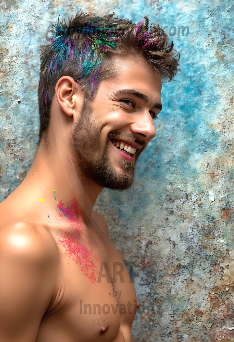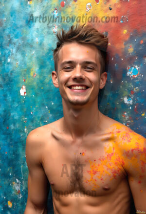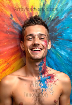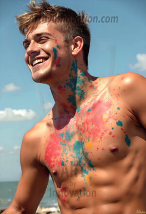 AI-generated abstract art — hot handsome men covered in colorful body paint explosions, full of joy and rainbow color.