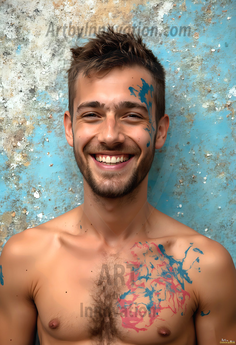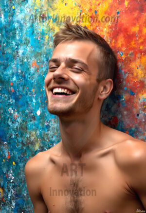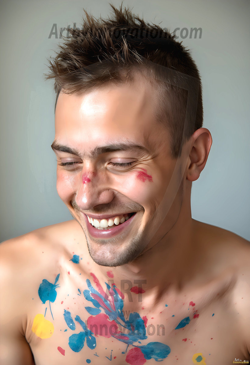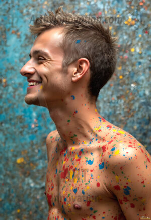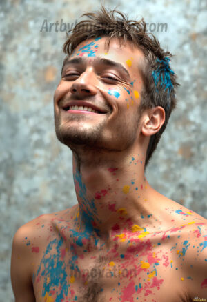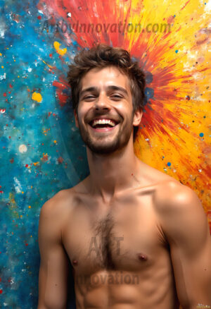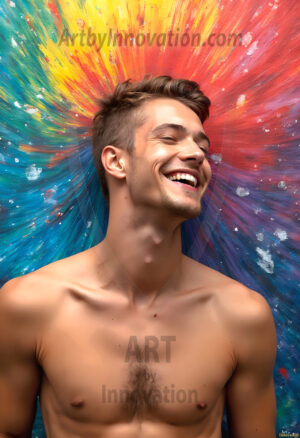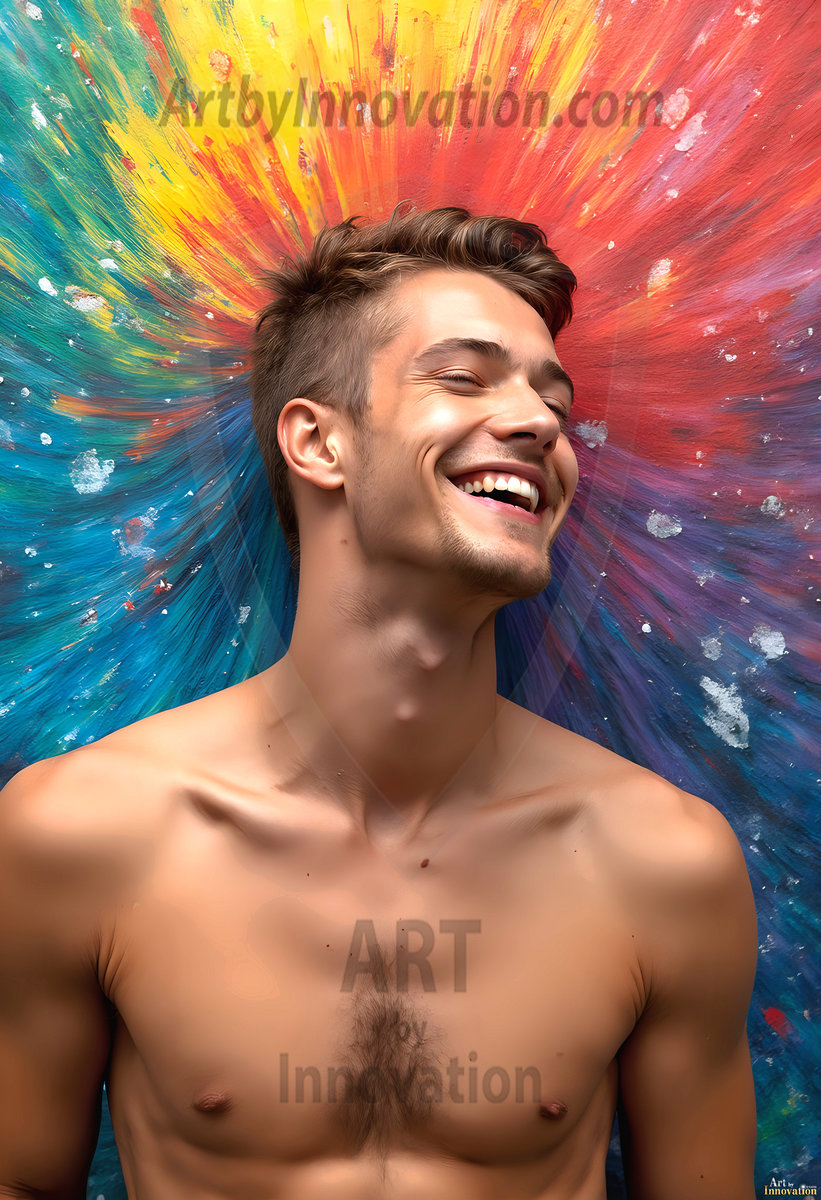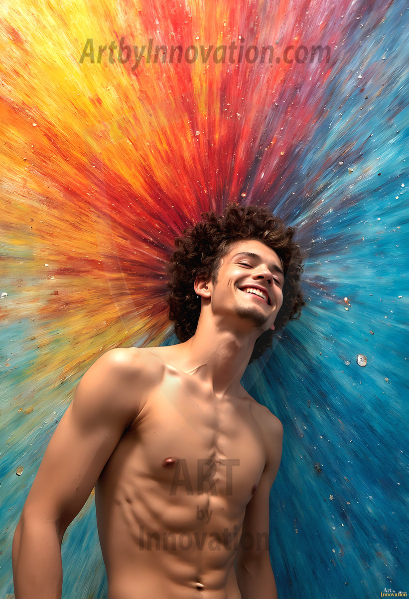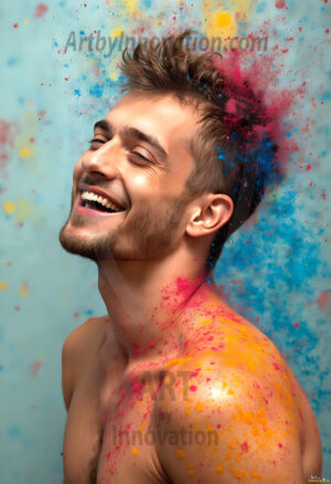AI-generated abstract art — hot handsome men covered in colorful body paint explosions, full of joy and rainbow color.