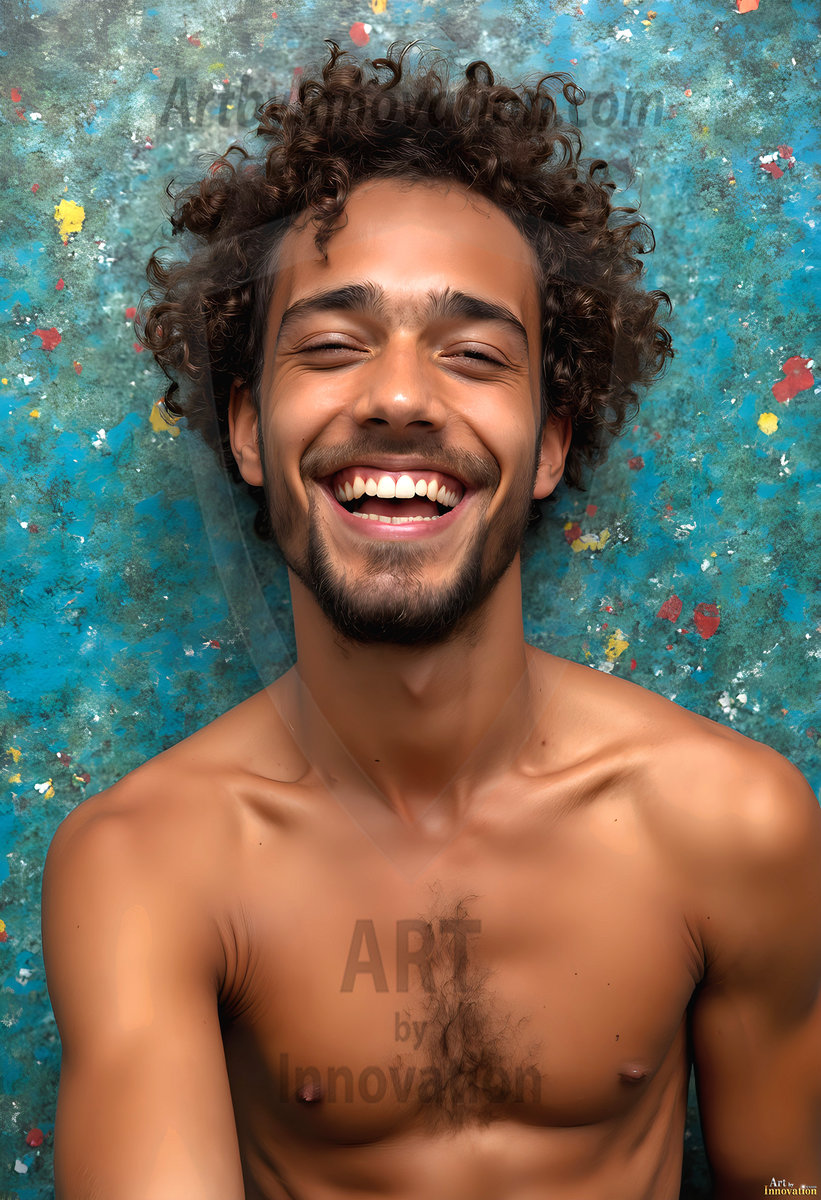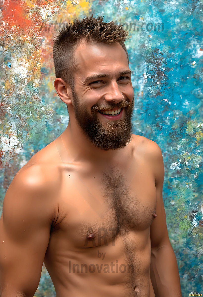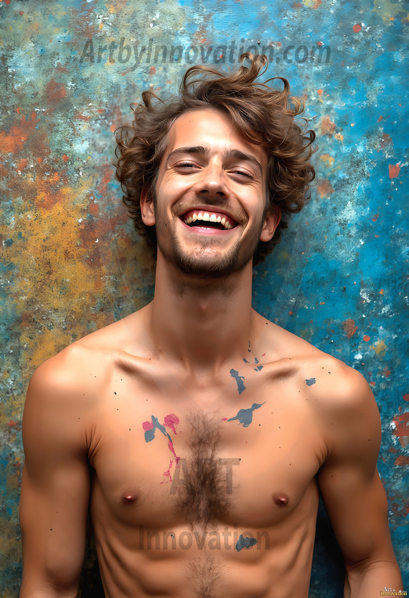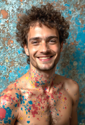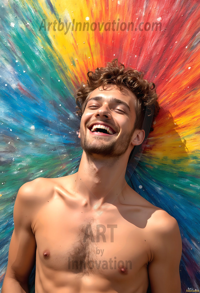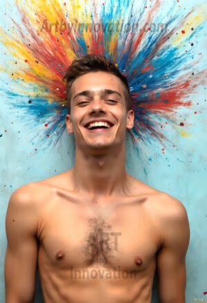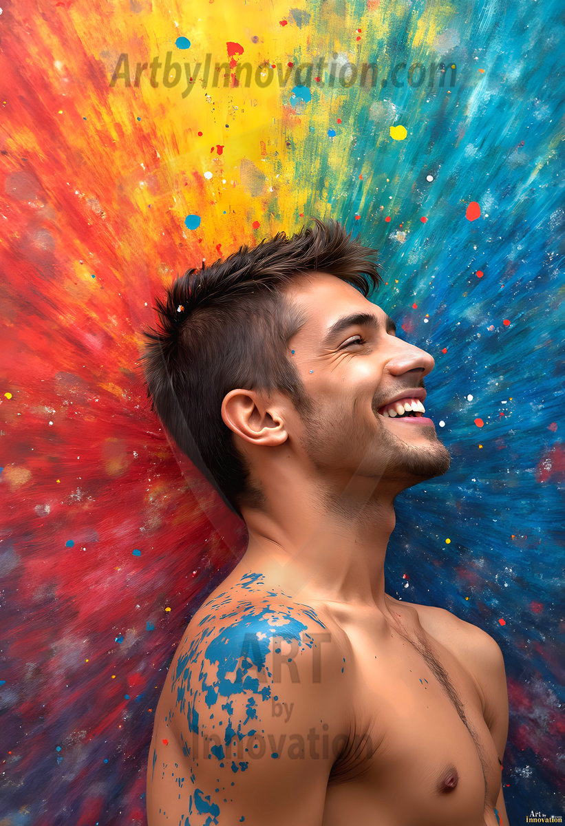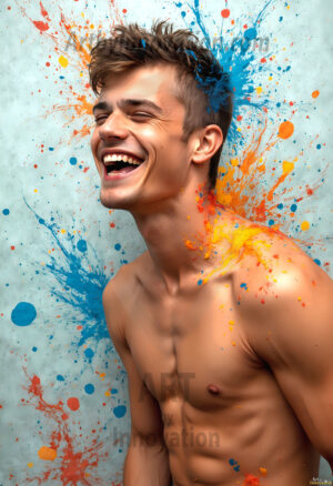 AI-generated abstract art — hot handsome men covered in colorful body paint explosions, full of joy and rainbow color.