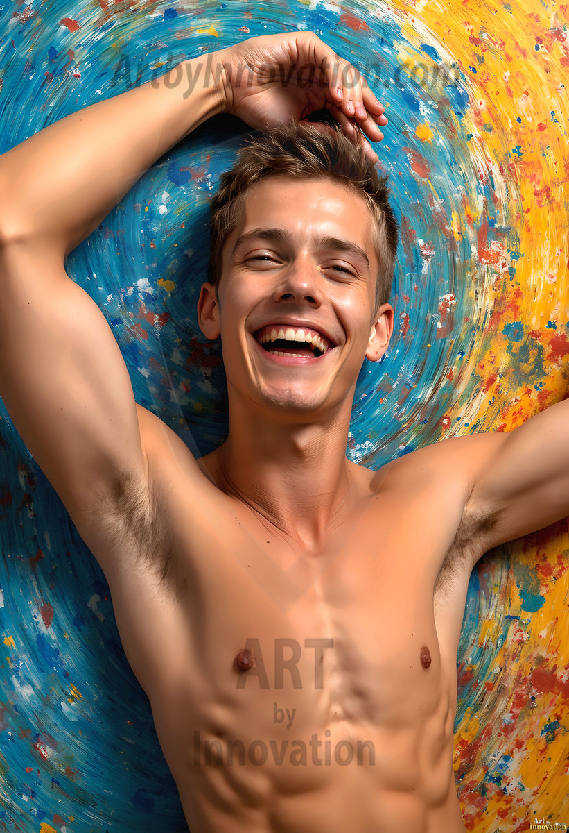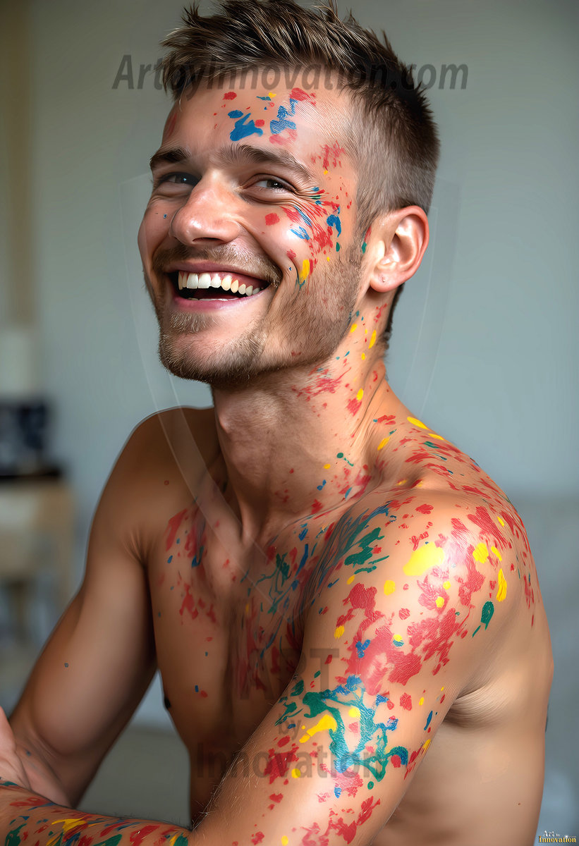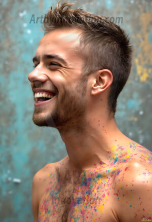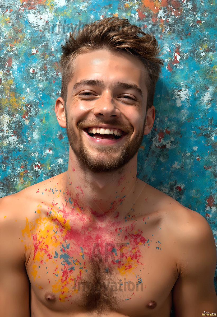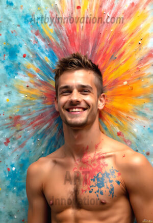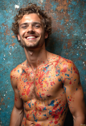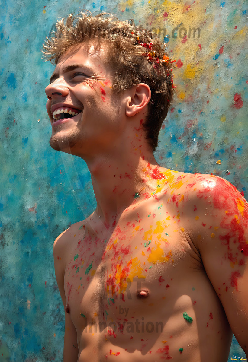 AI-generated abstract art — hot handsome men covered in colorful body paint explosions, full of joy and rainbow color.