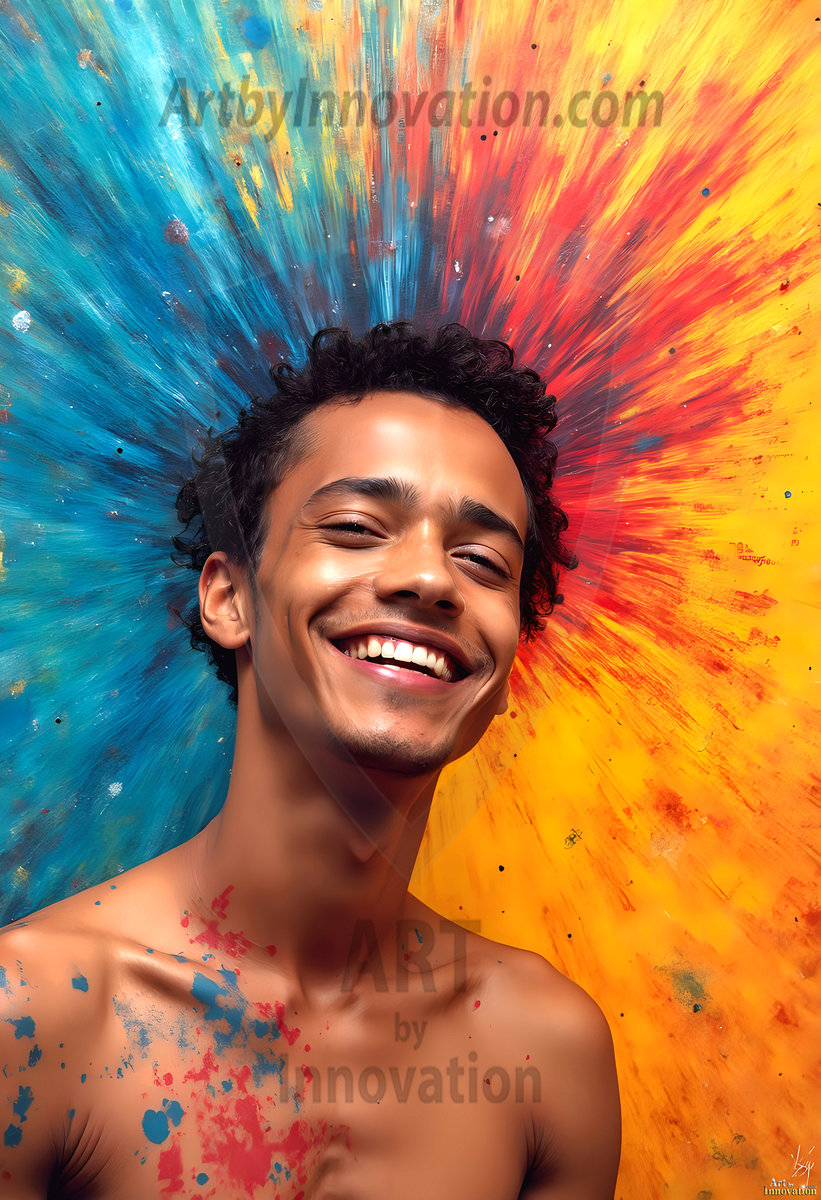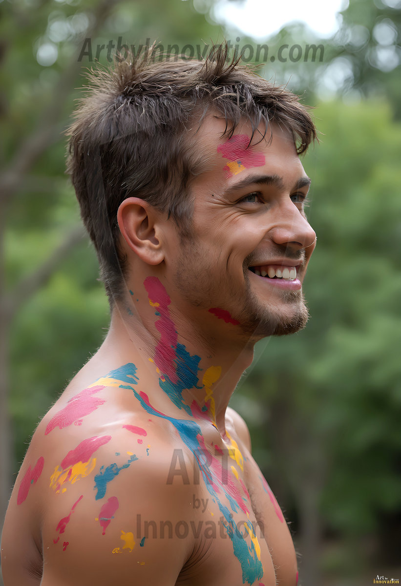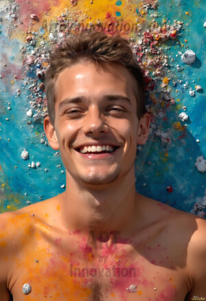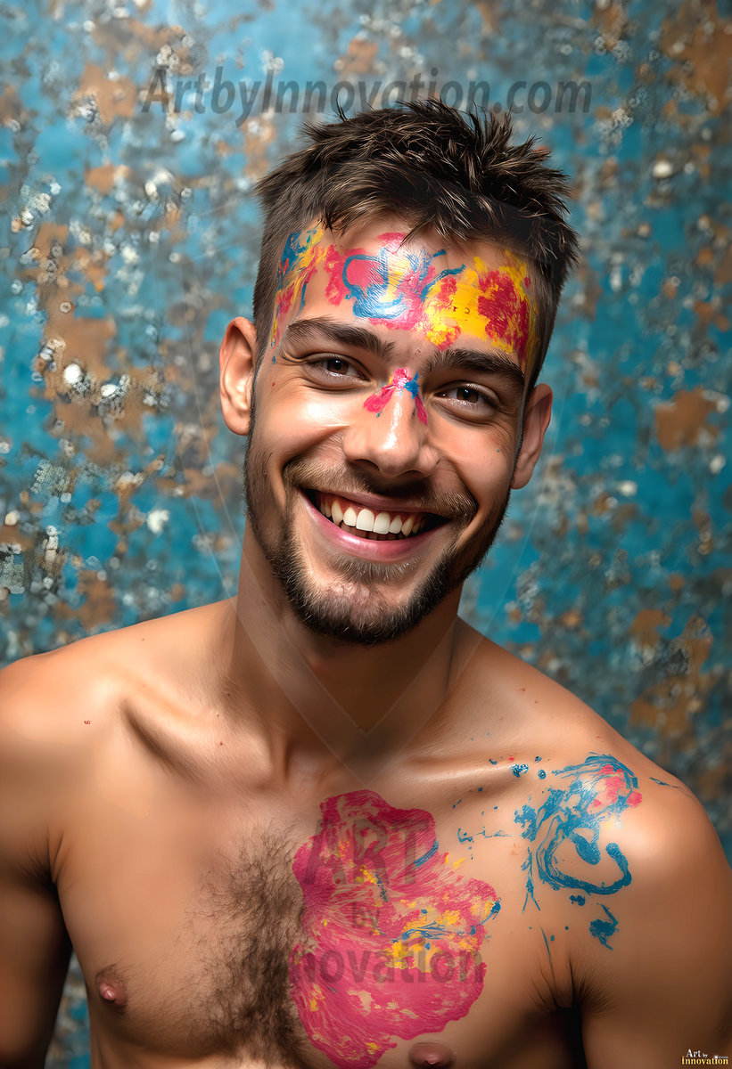 AI-generated abstract art — hot handsome men covered in colorful body paint explosions, full of joy and rainbow color.