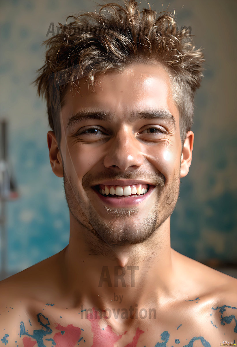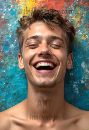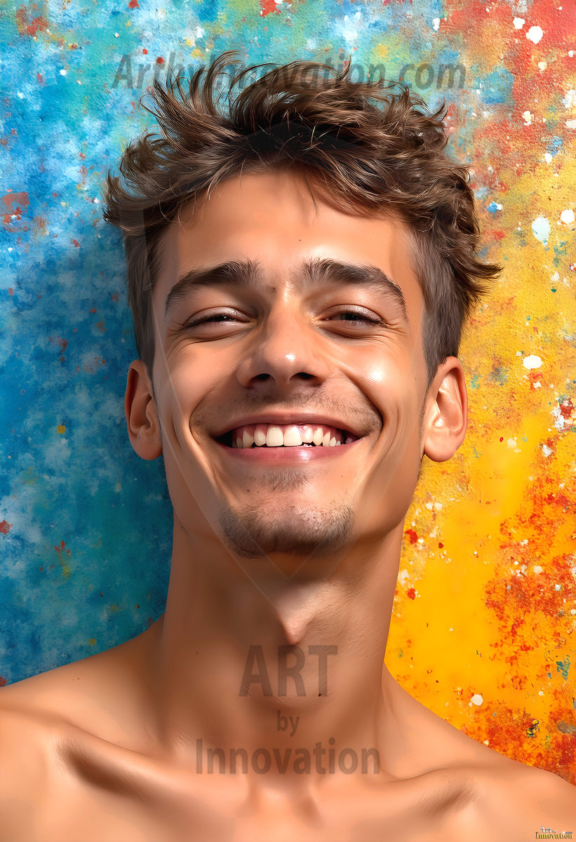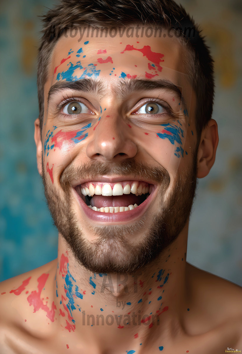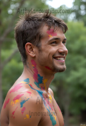 AI-generated abstract art — hot handsome men covered in colorful body paint explosions, full of joy and rainbow color.