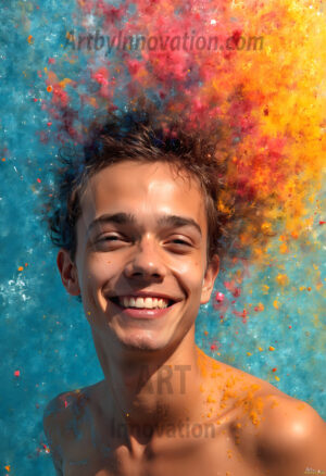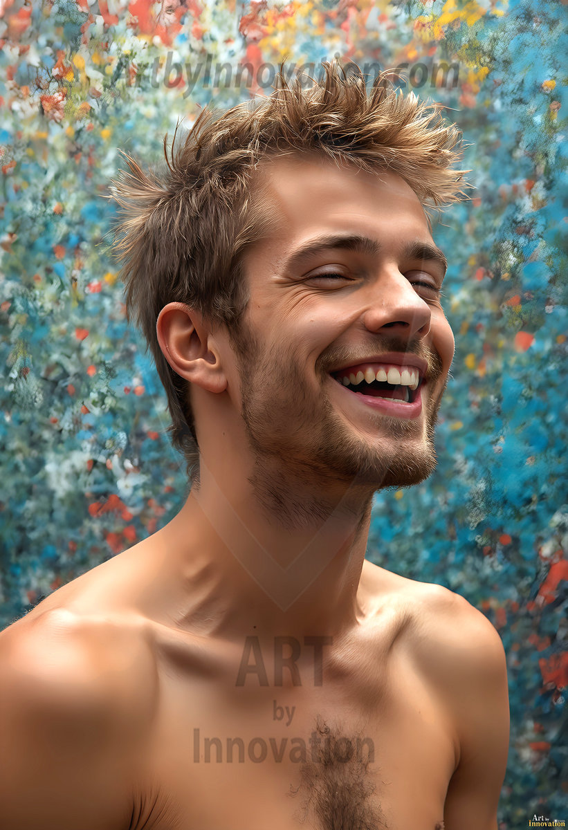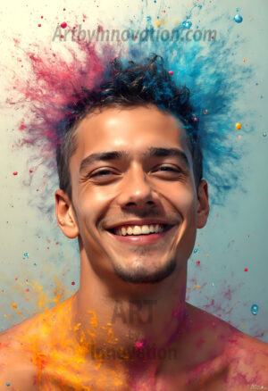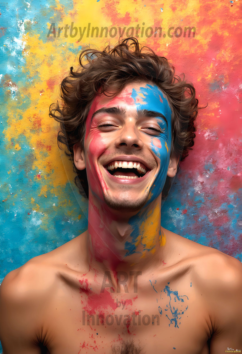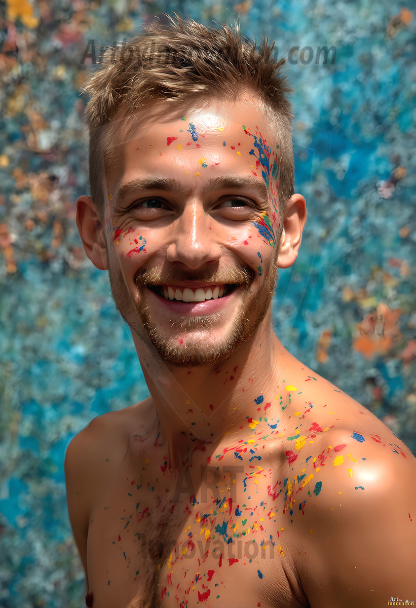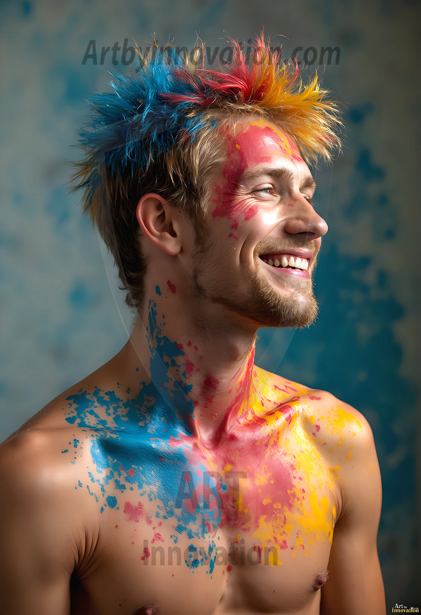 AI-generated abstract art — hot handsome men covered in colorful body paint explosions, full of joy and rainbow color.