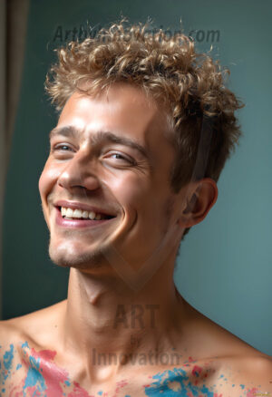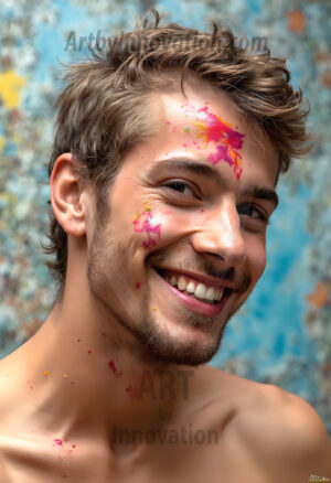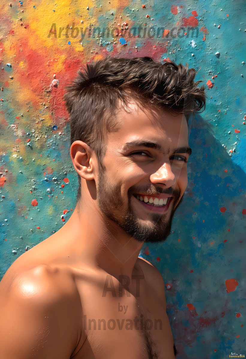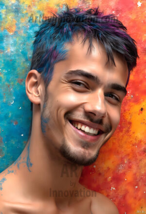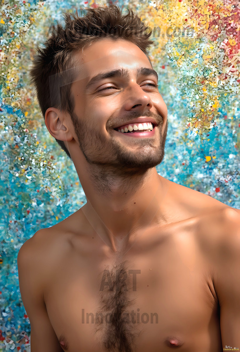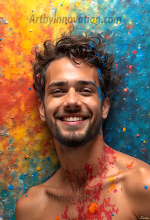 AI-generated abstract art — hot handsome men covered in colorful body paint explosions, full of joy and rainbow color.