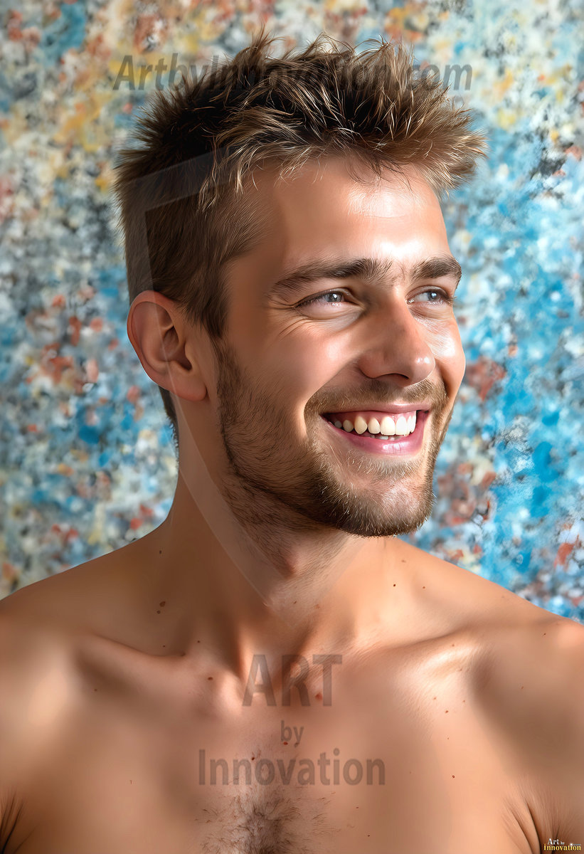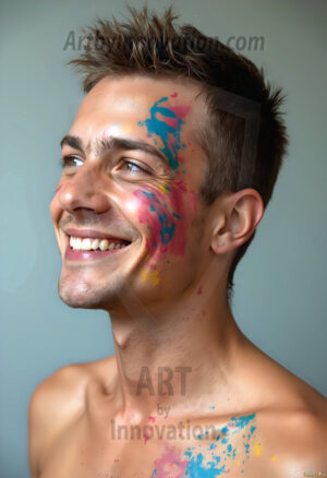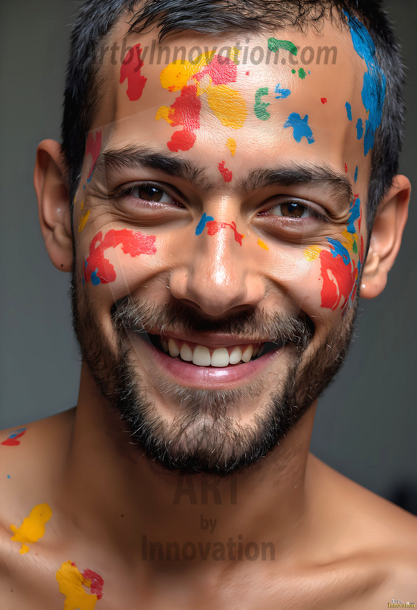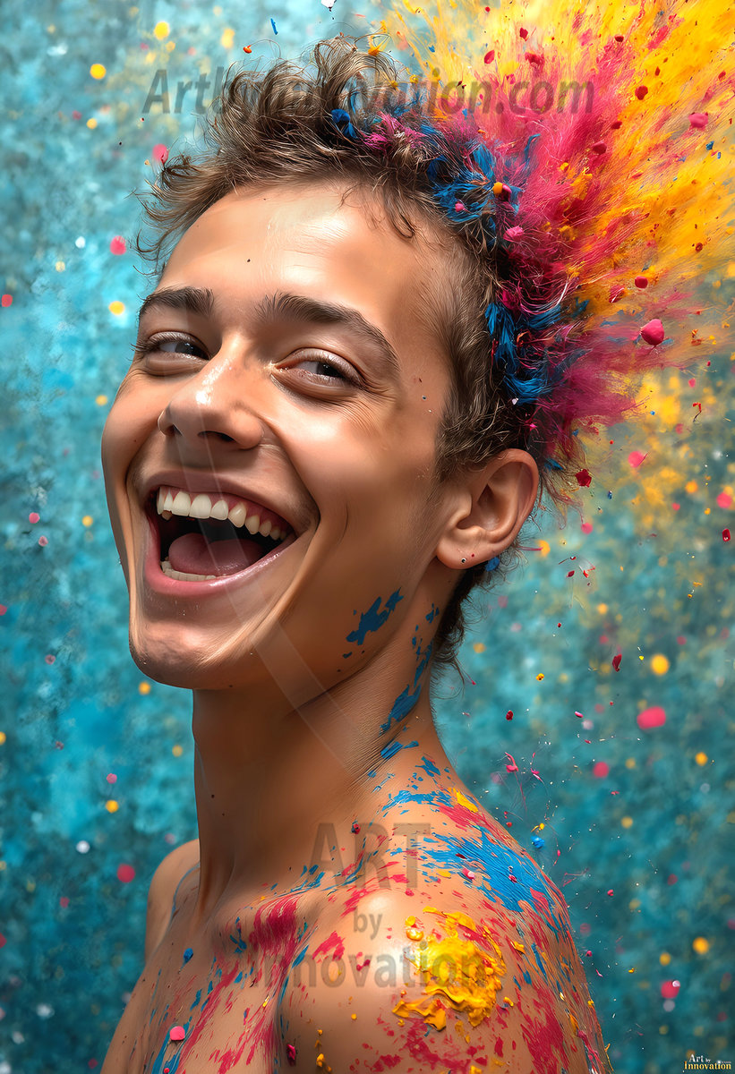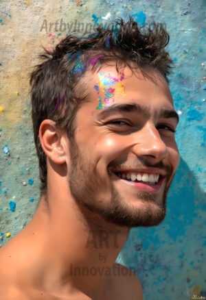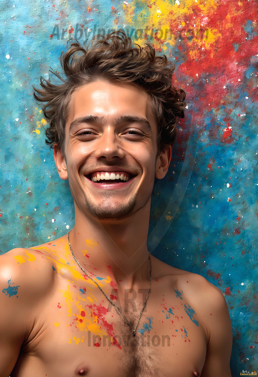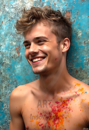 AI-generated abstract art — hot handsome men covered in colorful body paint explosions, full of joy and rainbow color.