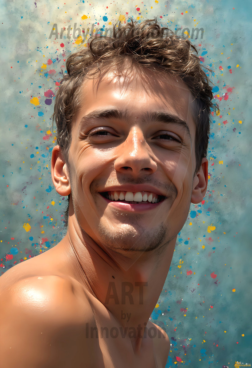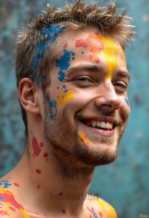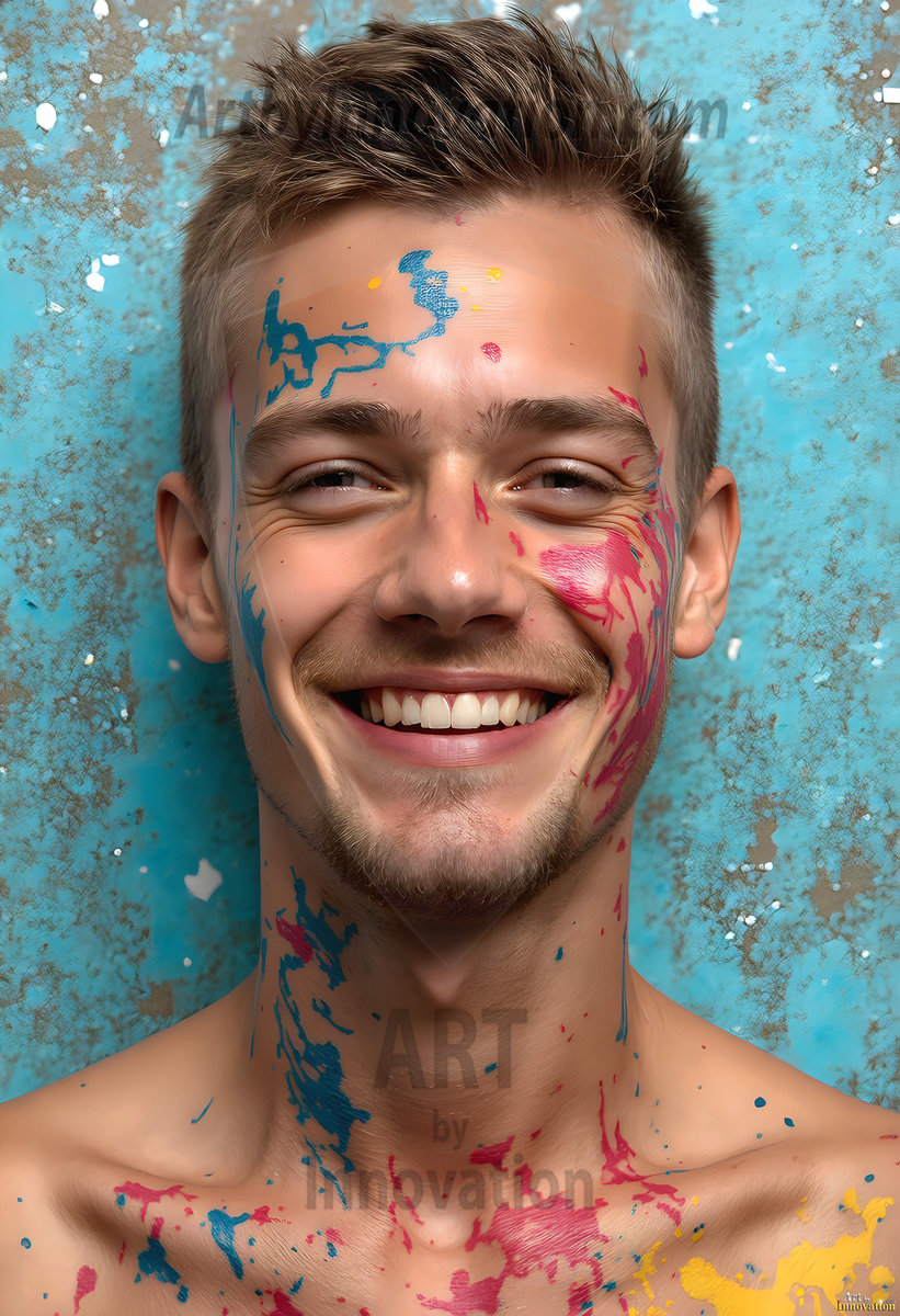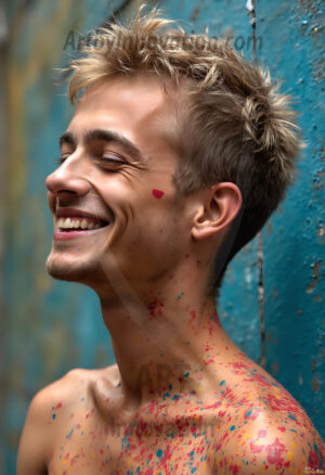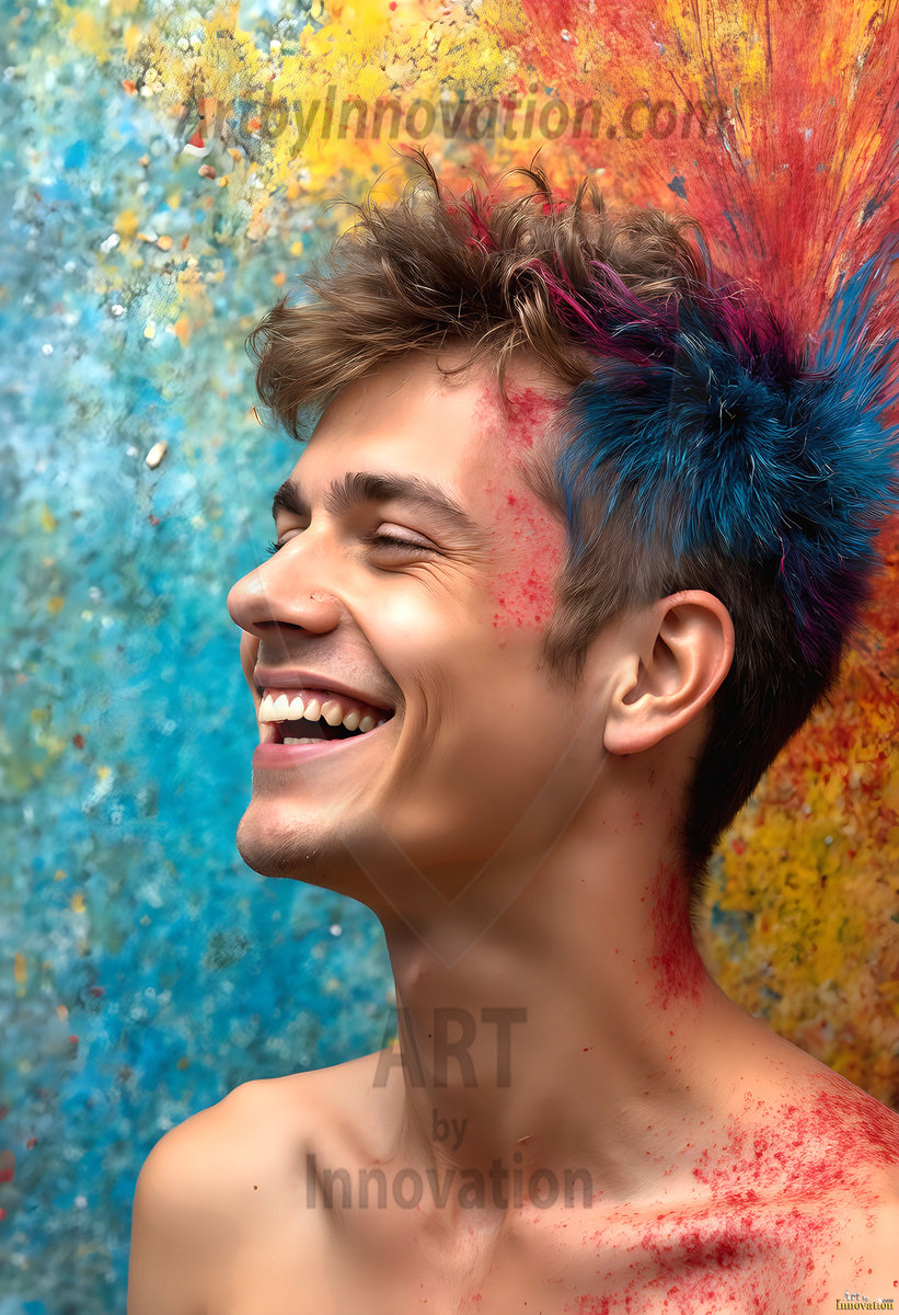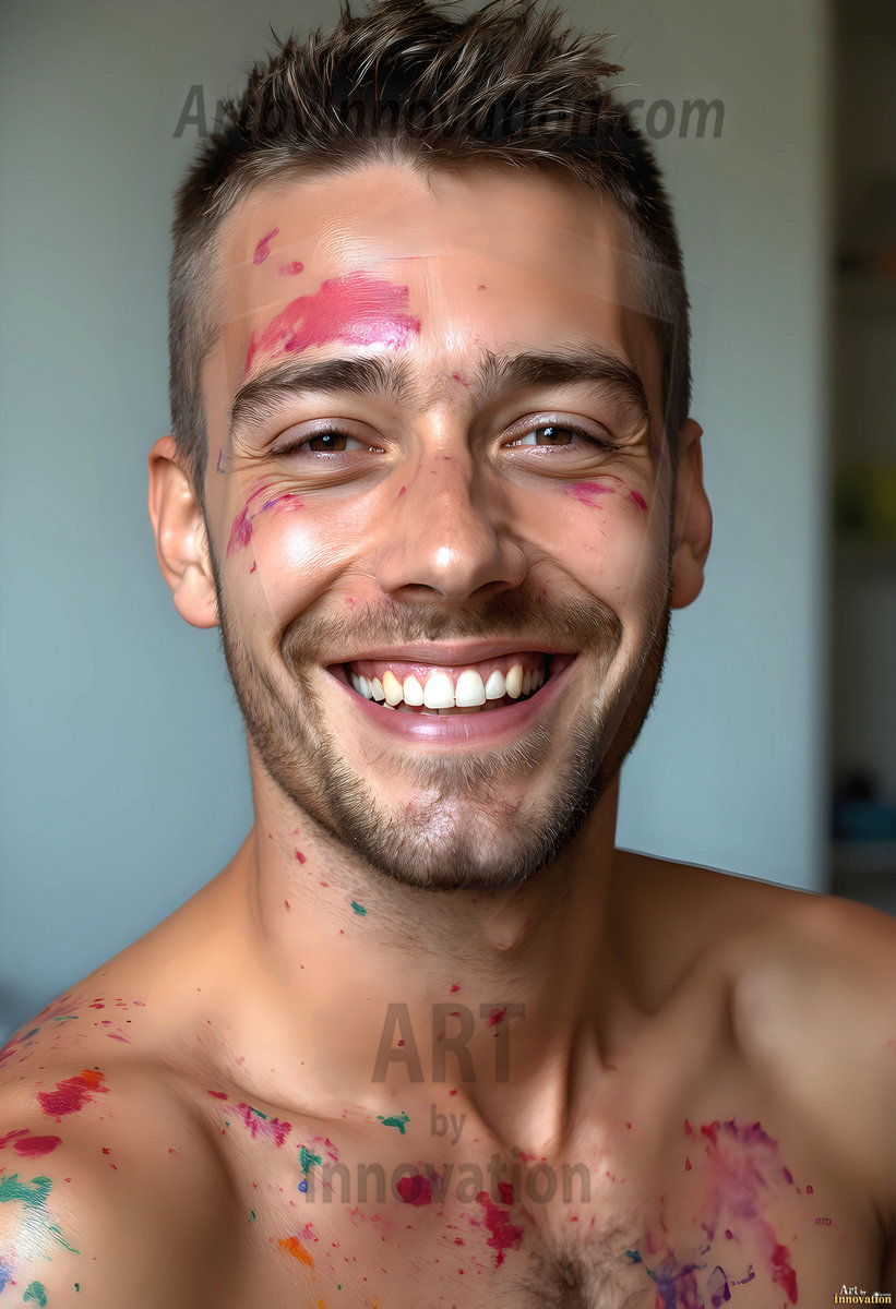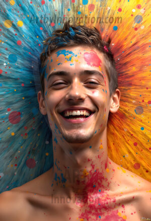 AI-generated abstract art — hot handsome men covered in colorful body paint explosions, full of joy and rainbow color.