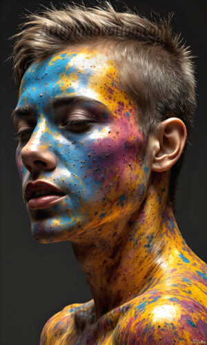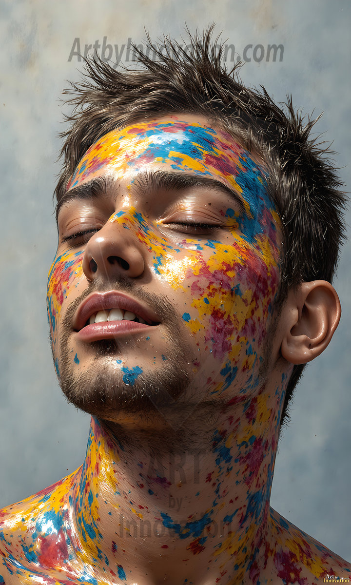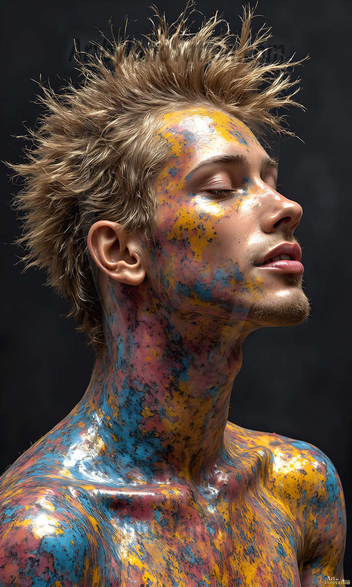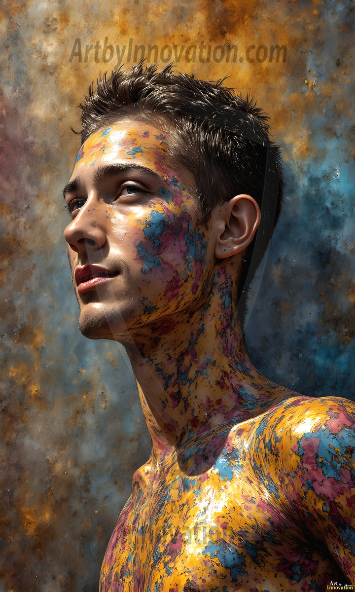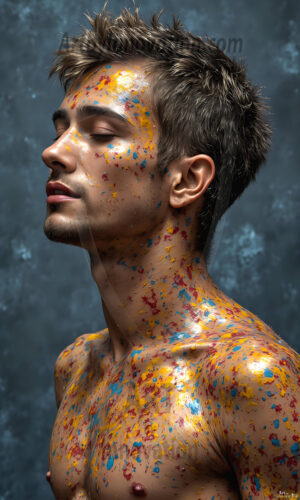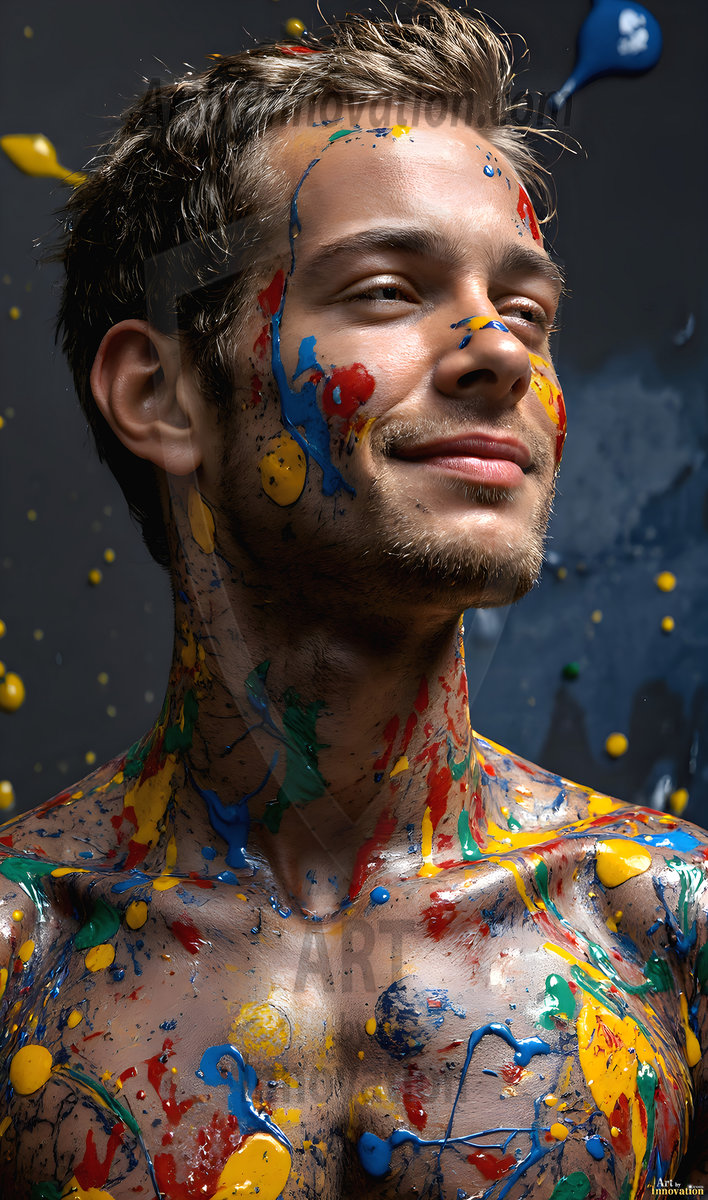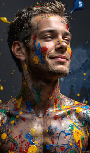 AI-generated abstract art — hot handsome men covered in colorful body paint explosions, full of joy and rainbow color.