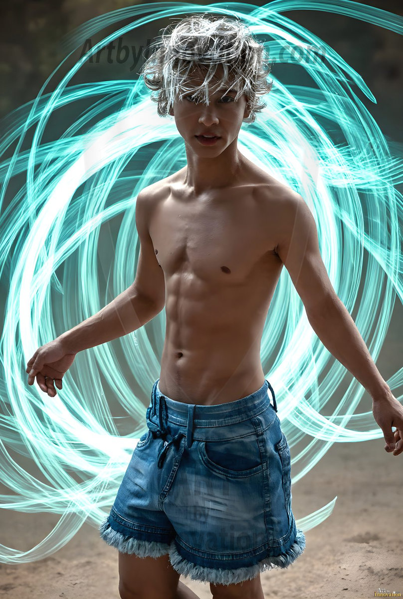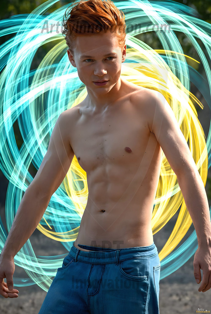 Where elegance and raw energy collide. This AI-generated abstract art collection features handsome, shirtless men dancing with radiant colorful light rays that wrap around their bodies in flowing, otherworldly patterns. The dynamic light trails — yellow, blue, purple, gold — emphasize their movements and add an ethereal fluidity, making each image feel like a moment suspended in time. Part dance, part cosmic phenomenon, entirely mesmerizing. Created using Flux.1, ComfyUI, and Stable Diffusion by © Jeff Dupler | Art by Innovation | https://www.artbyinnovation.com