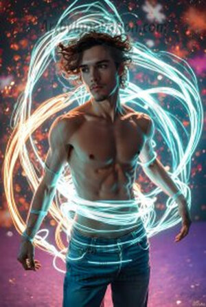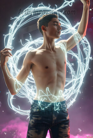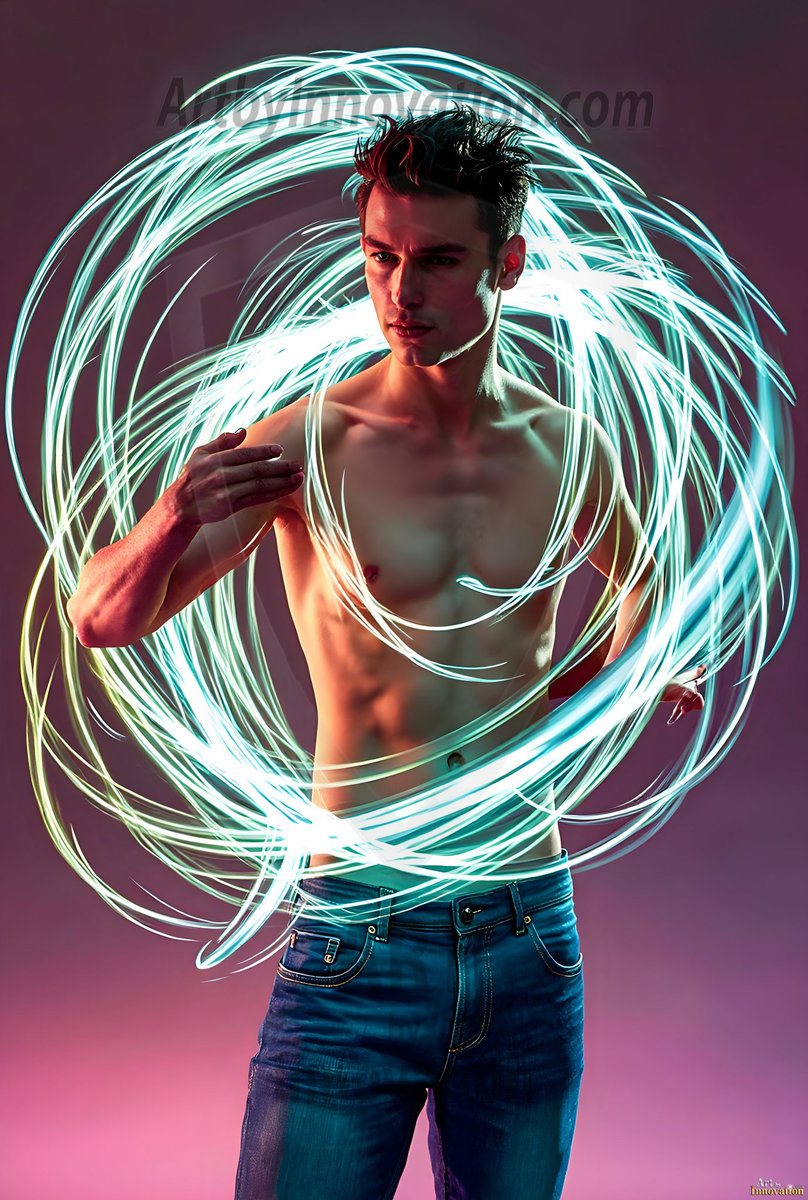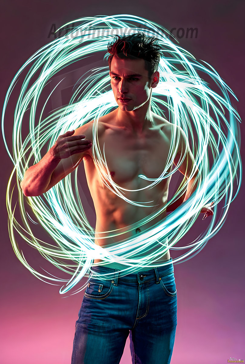 Where elegance and raw energy collide. This AI-generated abstract art collection features handsome, shirtless men dancing with radiant colorful light rays that wrap around their bodies in flowing, otherworldly patterns. The dynamic light trails — yellow, blue, purple, gold — emphasize their movements and add an ethereal fluidity, making each image feel like a moment suspended in time. Part dance, part cosmic phenomenon, entirely mesmerizing. Created using Flux.1, ComfyUI, and Stable Diffusion by © Jeff Dupler | Art by Innovation | https://www.artbyinnovation.com