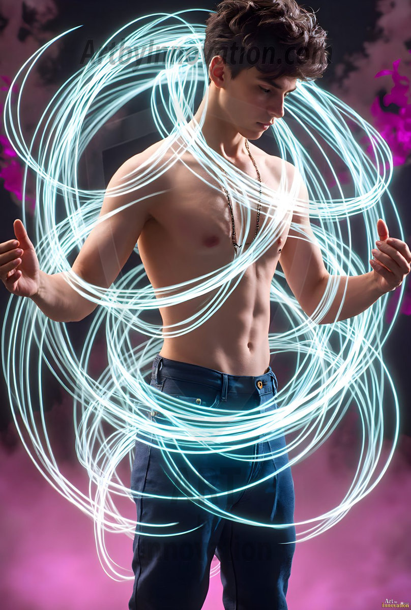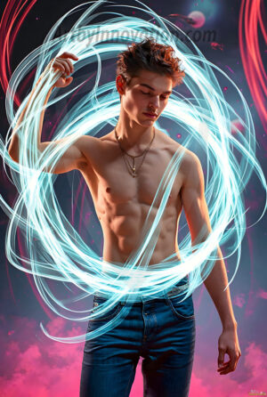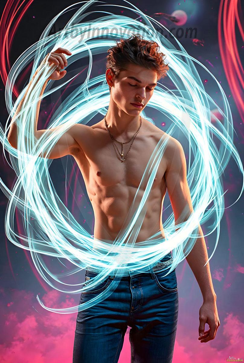 Where elegance and raw energy collide. This AI-generated abstract art collection features handsome, shirtless men dancing with radiant colorful light rays that wrap around their bodies in flowing, otherworldly patterns. The dynamic light trails — yellow, blue, purple, gold — emphasize their movements and add an ethereal fluidity, making each image feel like a moment suspended in time. Part dance, part cosmic phenomenon, entirely mesmerizing. Created using Flux.1, ComfyUI, and Stable Diffusion by © Jeff Dupler | Art by Innovation | https://www.artbyinnovation.com