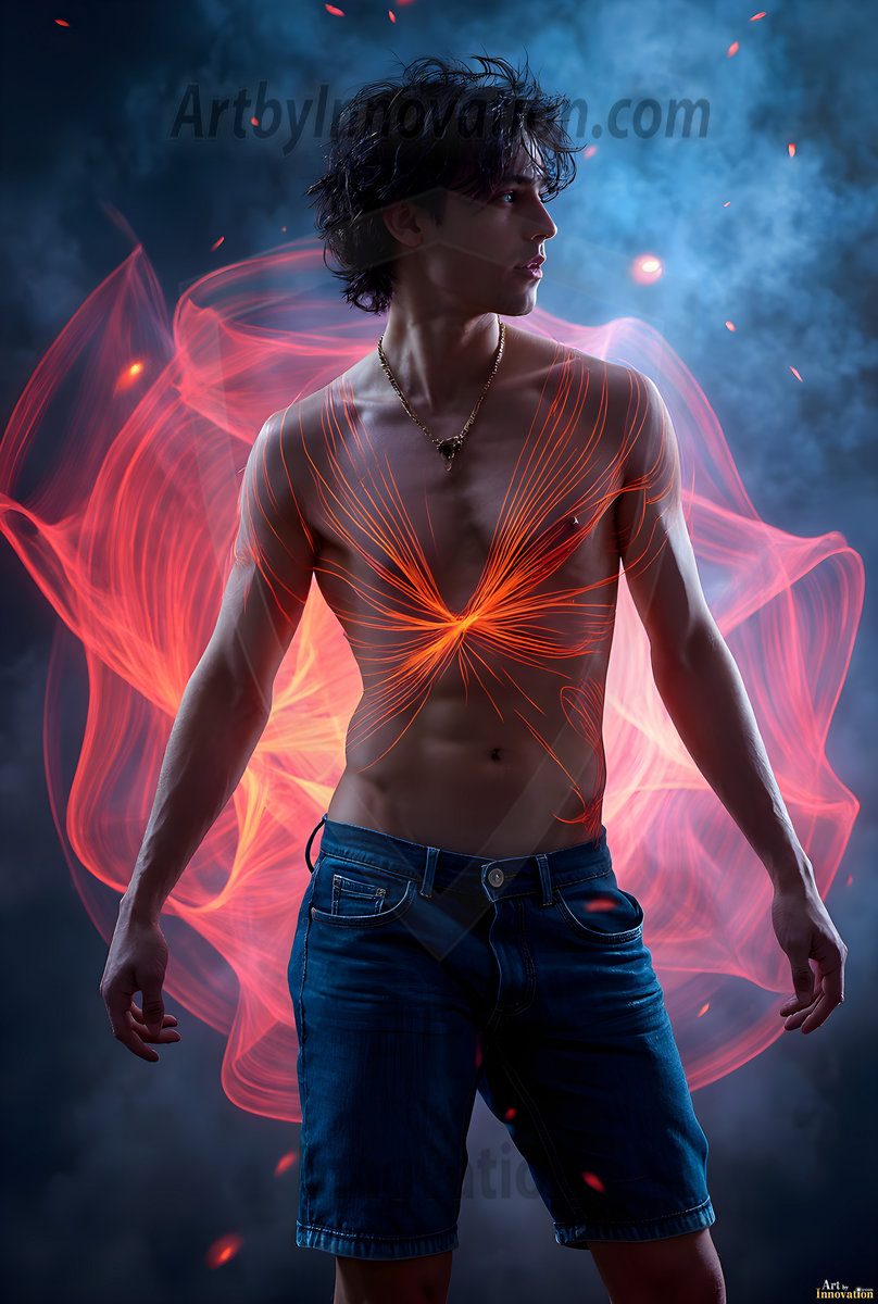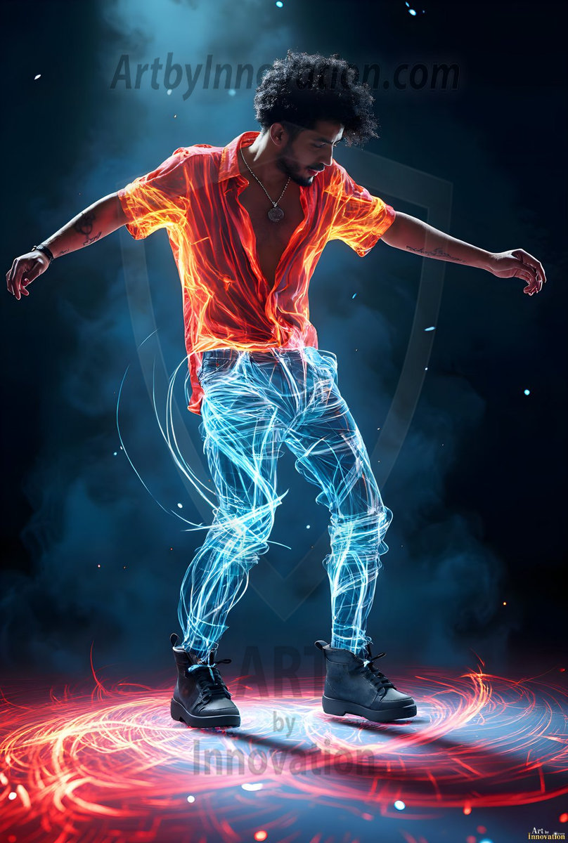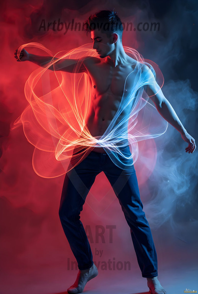 Where elegance and raw energy collide. This AI-generated abstract art collection features handsome, shirtless men dancing with radiant colorful light rays that wrap around their bodies in flowing, otherworldly patterns. The dynamic light trails — yellow, blue, purple, gold — emphasize their movements and add an ethereal fluidity, making each image feel like a moment suspended in time. Part dance, part cosmic phenomenon, entirely mesmerizing. Created using Flux.1, ComfyUI, and Stable Diffusion by © Jeff Dupler | Art by Innovation | https://www.artbyinnovation.com