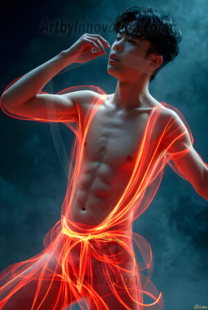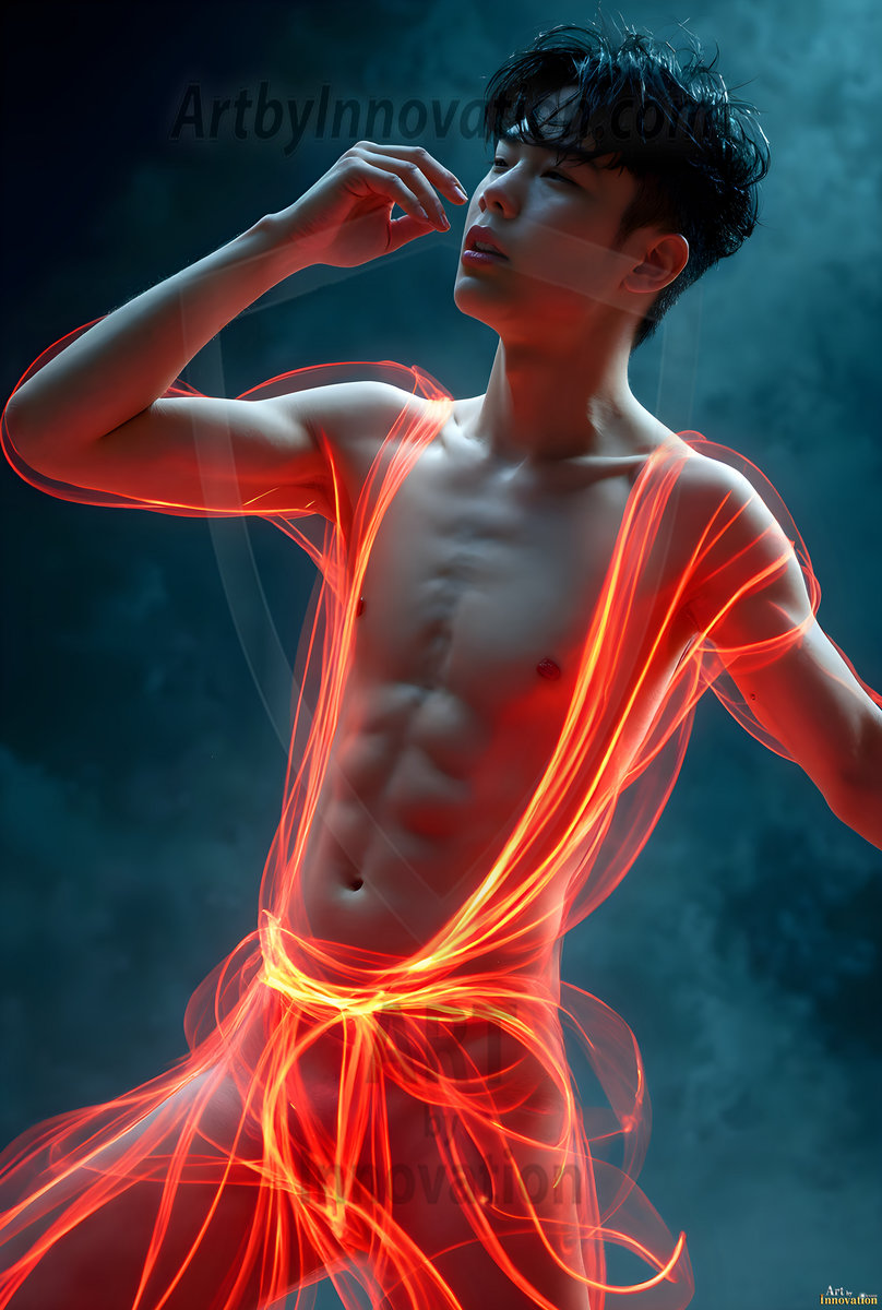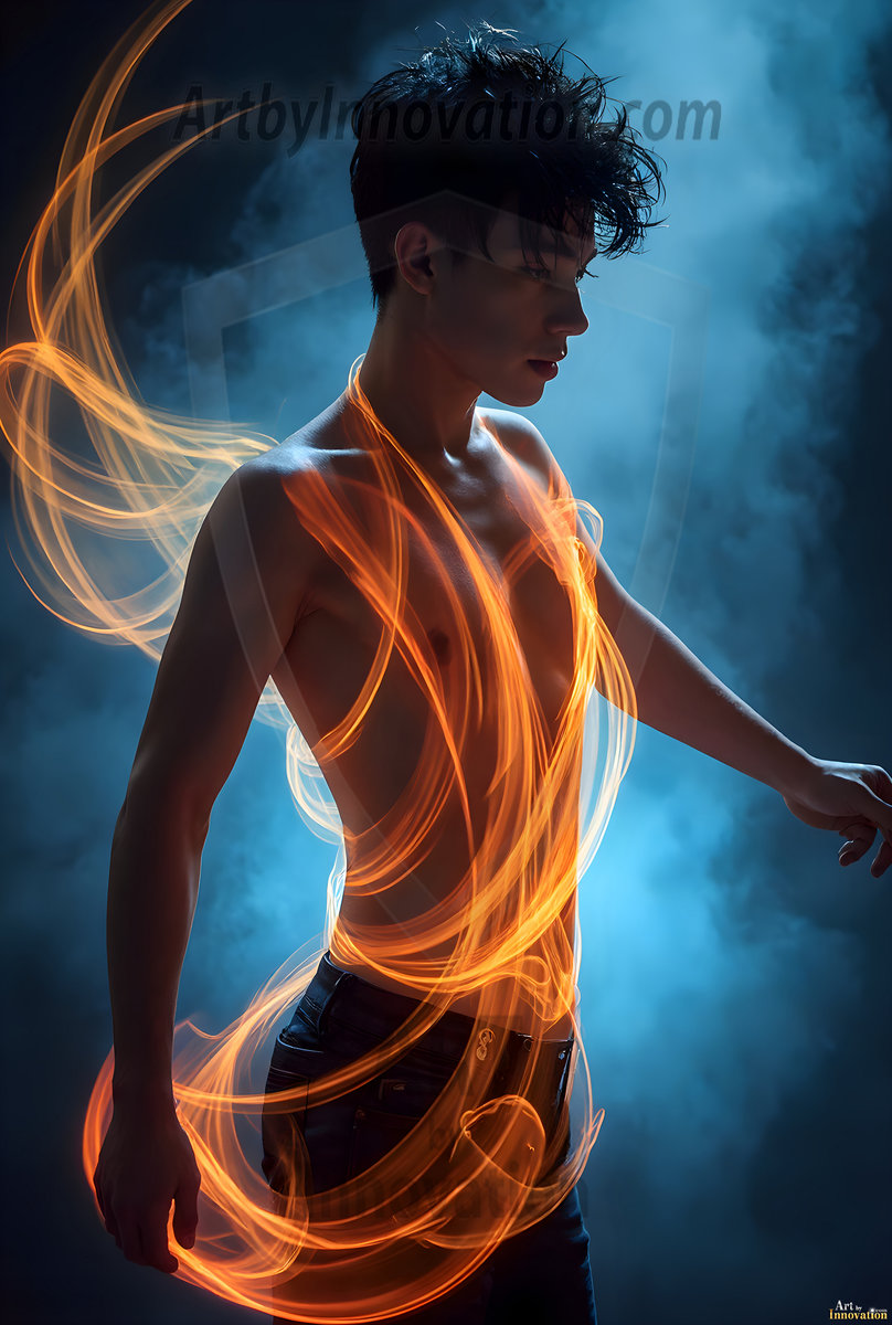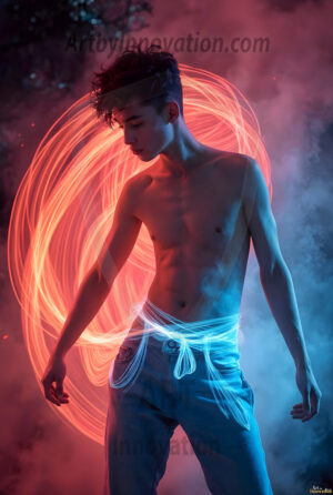 Where elegance and raw energy collide. This AI-generated abstract art collection features handsome, shirtless men dancing with radiant colorful light rays that wrap around their bodies in flowing, otherworldly patterns. The dynamic light trails — yellow, blue, purple, gold — emphasize their movements and add an ethereal fluidity, making each image feel like a moment suspended in time. Part dance, part cosmic phenomenon, entirely mesmerizing. Created using Flux.1, ComfyUI, and Stable Diffusion by © Jeff Dupler | Art by Innovation | https://www.artbyinnovation.com