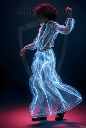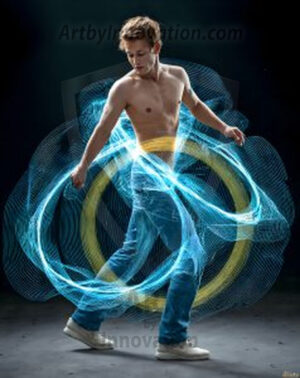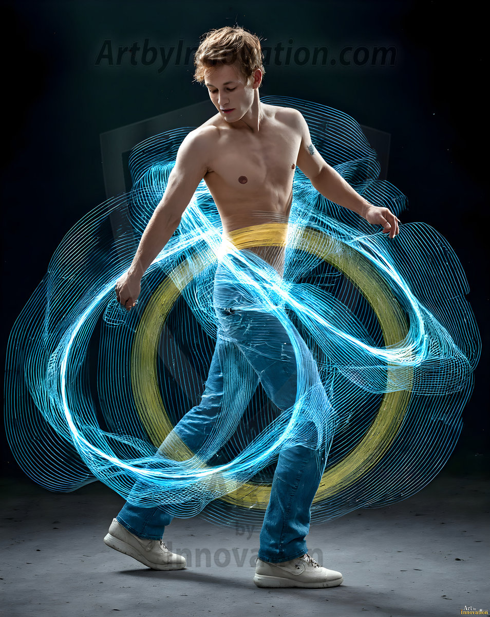 Where elegance and raw energy collide. This AI-generated abstract art collection features handsome, shirtless men dancing with radiant colorful light rays that wrap around their bodies in flowing, otherworldly patterns. The dynamic light trails — yellow, blue, purple, gold — emphasize their movements and add an ethereal fluidity, making each image feel like a moment suspended in time. Part dance, part cosmic phenomenon, entirely mesmerizing. Created using Flux.1, ComfyUI, and Stable Diffusion by © Jeff Dupler | Art by Innovation | https://www.artbyinnovation.com