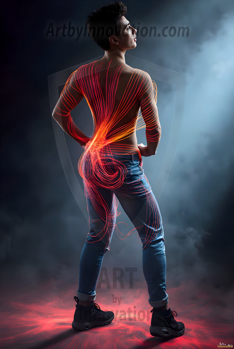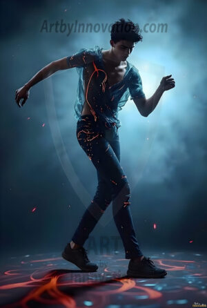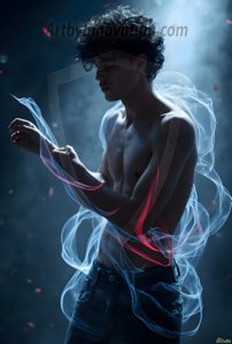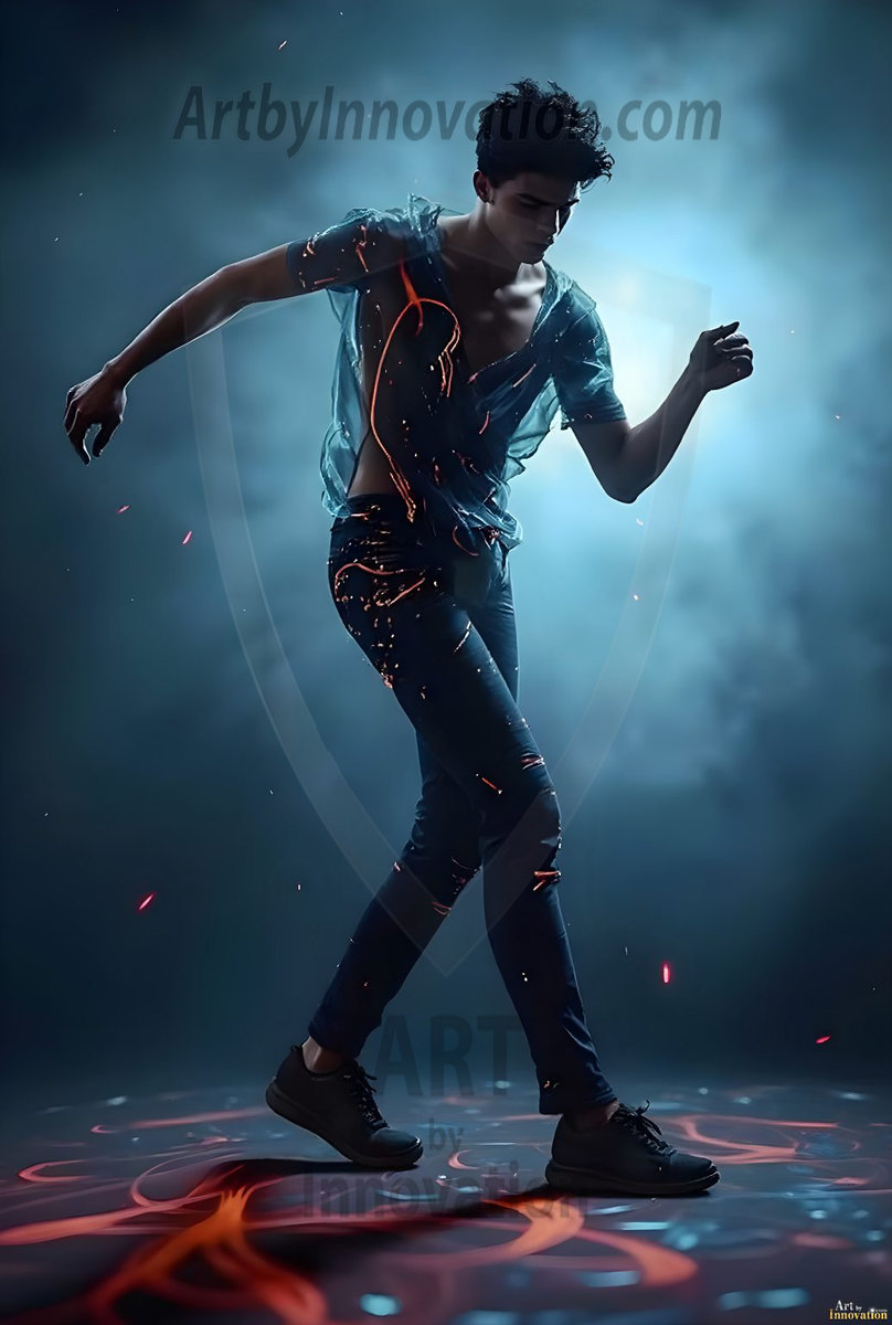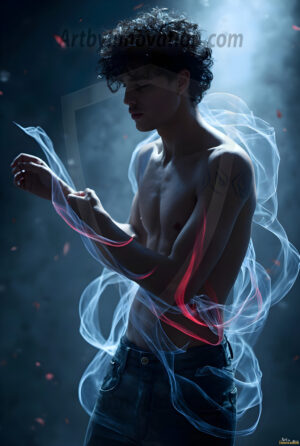 Where elegance and raw energy collide. This AI-generated abstract art collection features handsome, shirtless men dancing with radiant colorful light rays that wrap around their bodies in flowing, otherworldly patterns. The dynamic light trails — yellow, blue, purple, gold — emphasize their movements and add an ethereal fluidity, making each image feel like a moment suspended in time. Part dance, part cosmic phenomenon, entirely mesmerizing. Created using Flux.1, ComfyUI, and Stable Diffusion by © Jeff Dupler | Art by Innovation | https://www.artbyinnovation.com