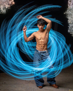 Where elegance and raw energy collide. This AI-generated abstract art collection features handsome, shirtless men dancing with radiant colorful light rays that wrap around their bodies in flowing, otherworldly patterns. The dynamic light trails — yellow, blue, purple, gold — emphasize their movements and add an ethereal fluidity, making each image feel like a moment suspended in time. Part dance, part cosmic phenomenon, entirely mesmerizing. Created using Flux.1, ComfyUI, and Stable Diffusion by © Jeff Dupler | Art by Innovation | https://www.artbyinnovation.com