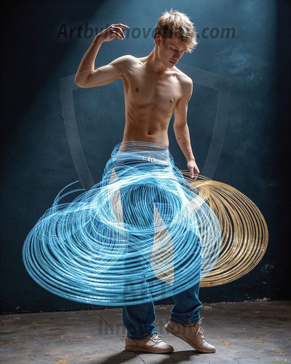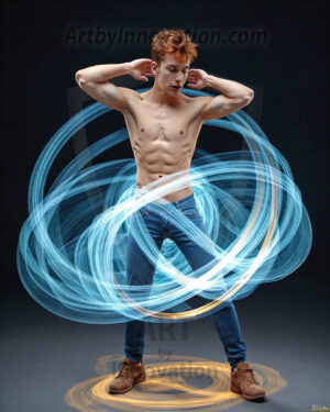 Where elegance and raw energy collide. This AI-generated abstract art collection features handsome, shirtless men dancing with radiant colorful light rays that wrap around their bodies in flowing, otherworldly patterns. The dynamic light trails — yellow, blue, purple, gold — emphasize their movements and add an ethereal fluidity, making each image feel like a moment suspended in time. Part dance, part cosmic phenomenon, entirely mesmerizing. Created using Flux.1, ComfyUI, and Stable Diffusion by © Jeff Dupler | Art by Innovation | https://www.artbyinnovation.com