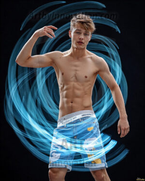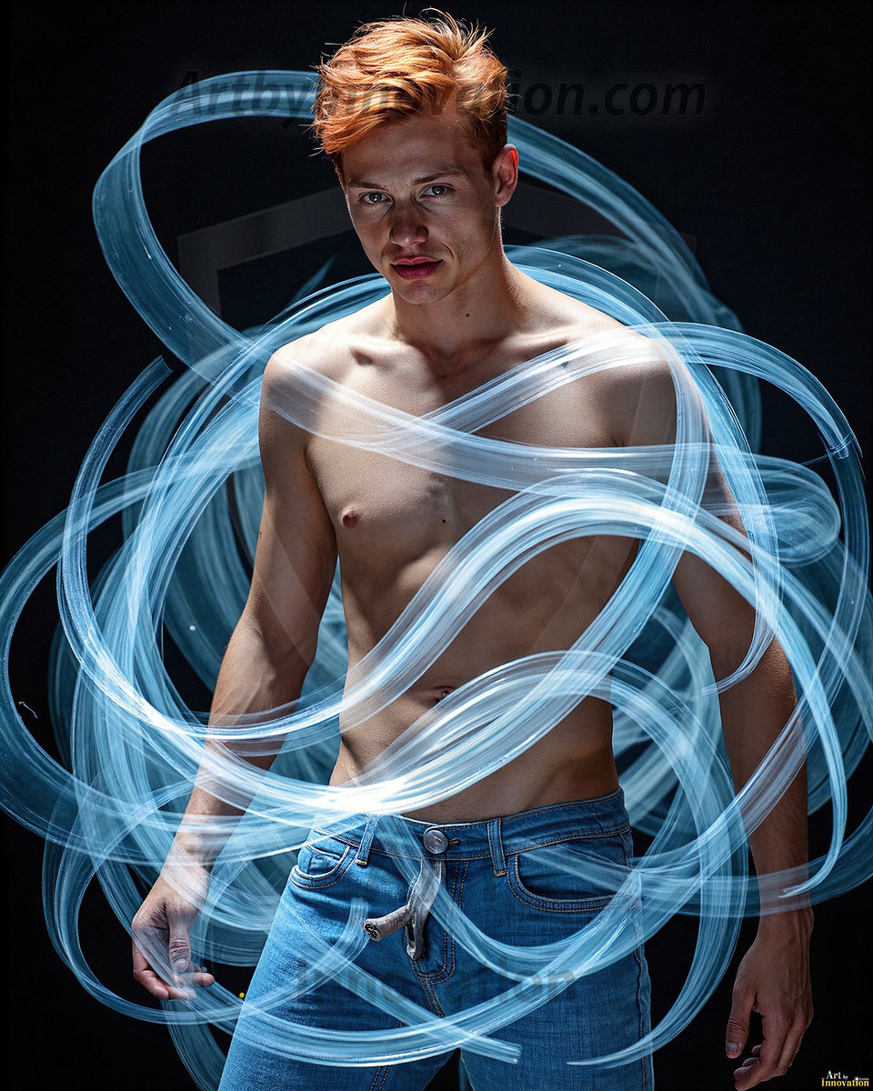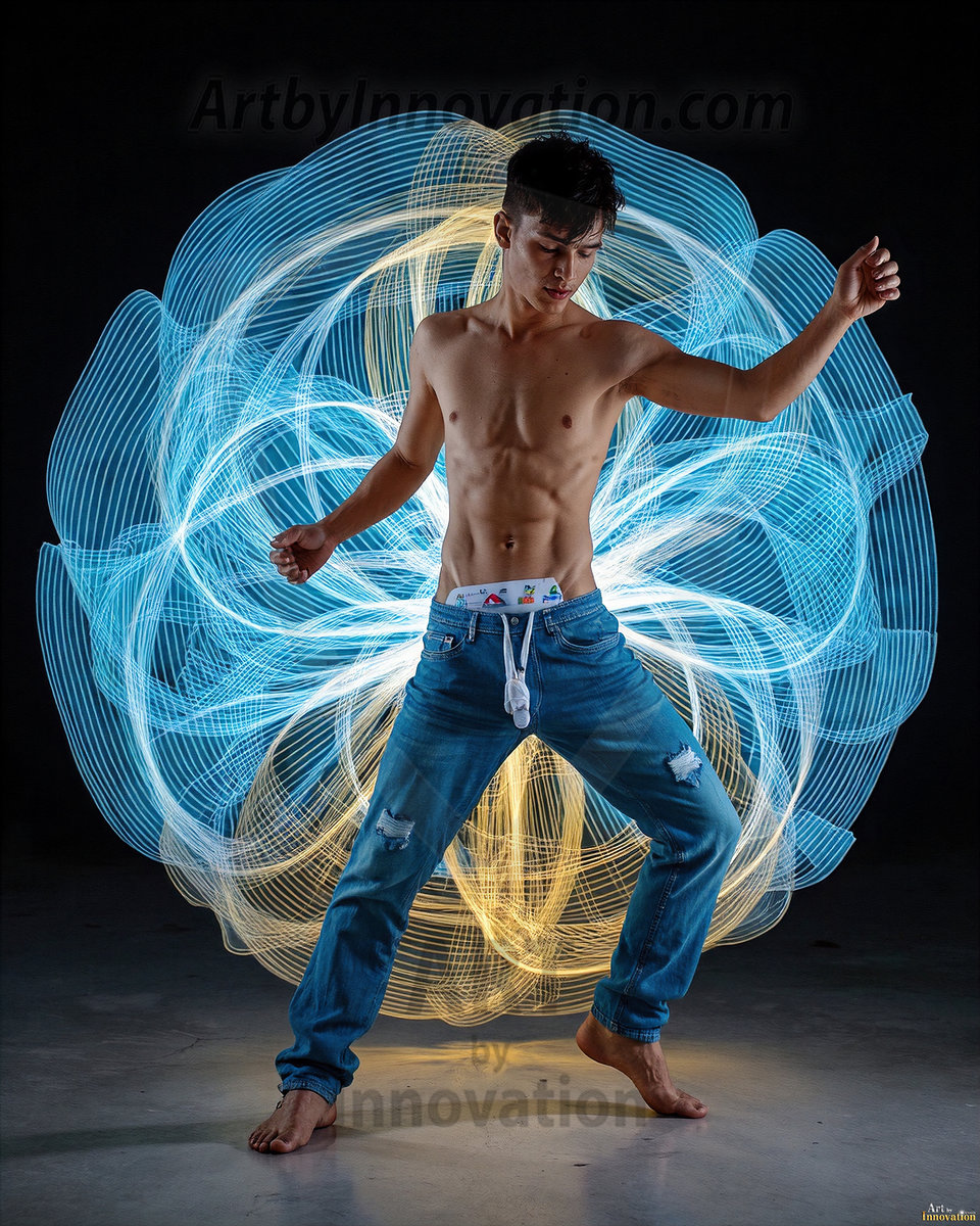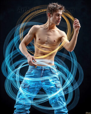 Where elegance and raw energy collide. This AI-generated abstract art collection features handsome, shirtless men dancing with radiant colorful light rays that wrap around their bodies in flowing, otherworldly patterns. The dynamic light trails — yellow, blue, purple, gold — emphasize their movements and add an ethereal fluidity, making each image feel like a moment suspended in time. Part dance, part cosmic phenomenon, entirely mesmerizing. Created using Flux.1, ComfyUI, and Stable Diffusion by © Jeff Dupler | Art by Innovation | https://www.artbyinnovation.com
