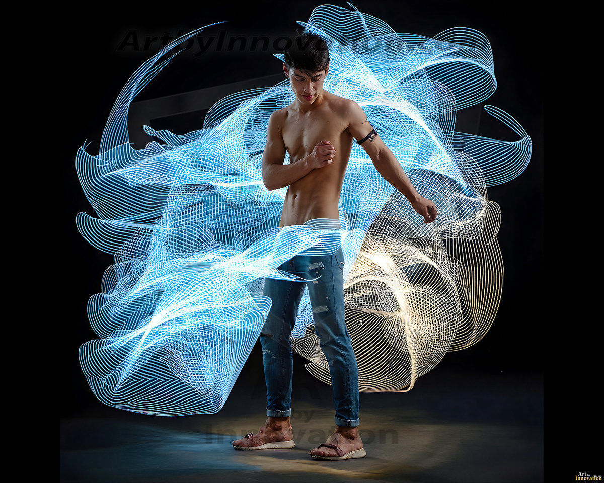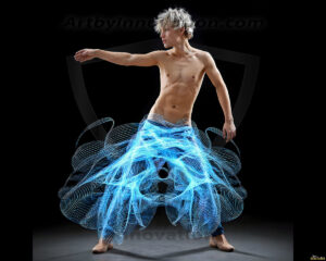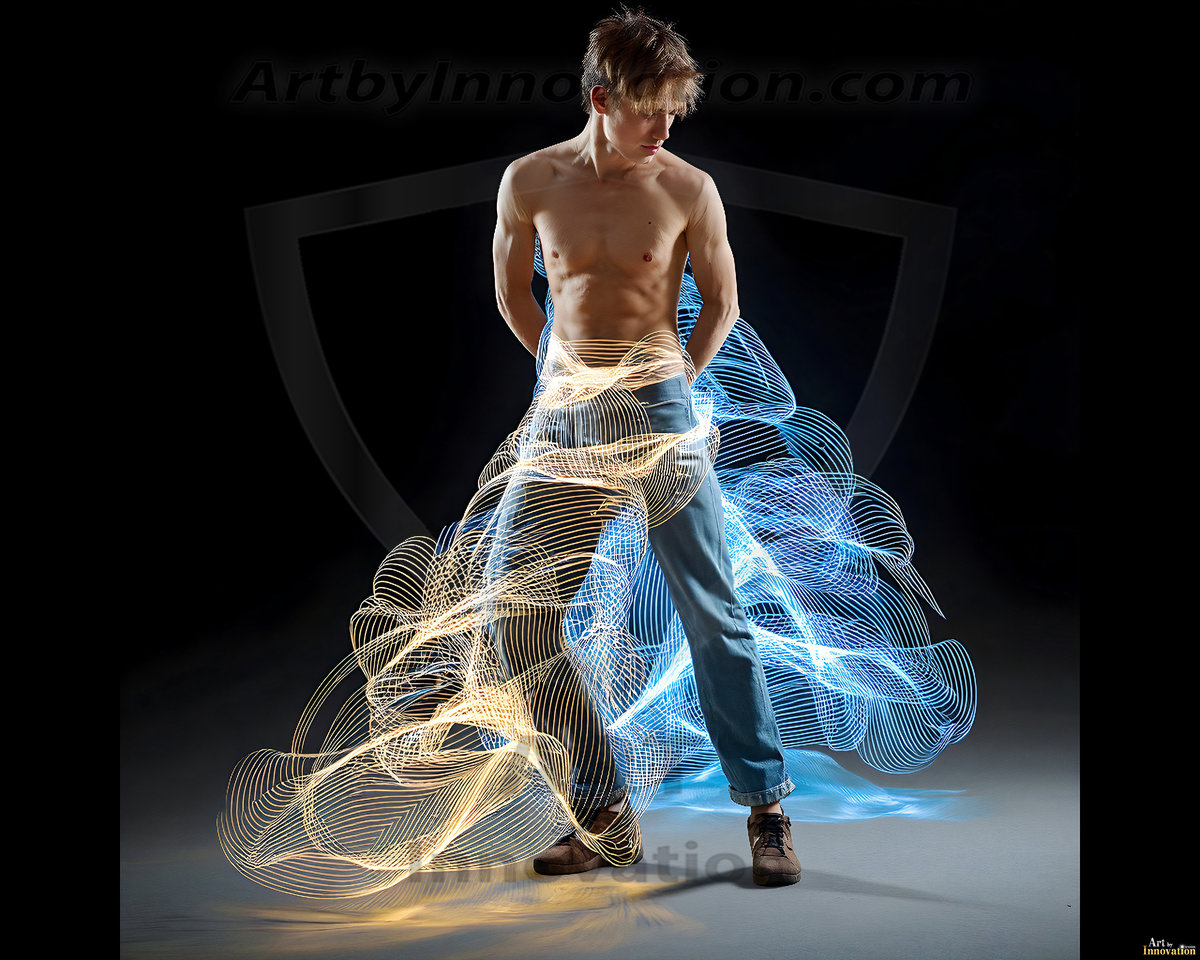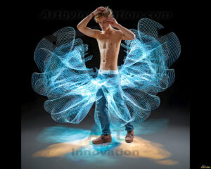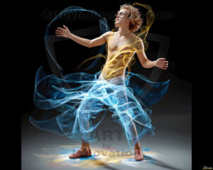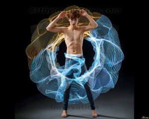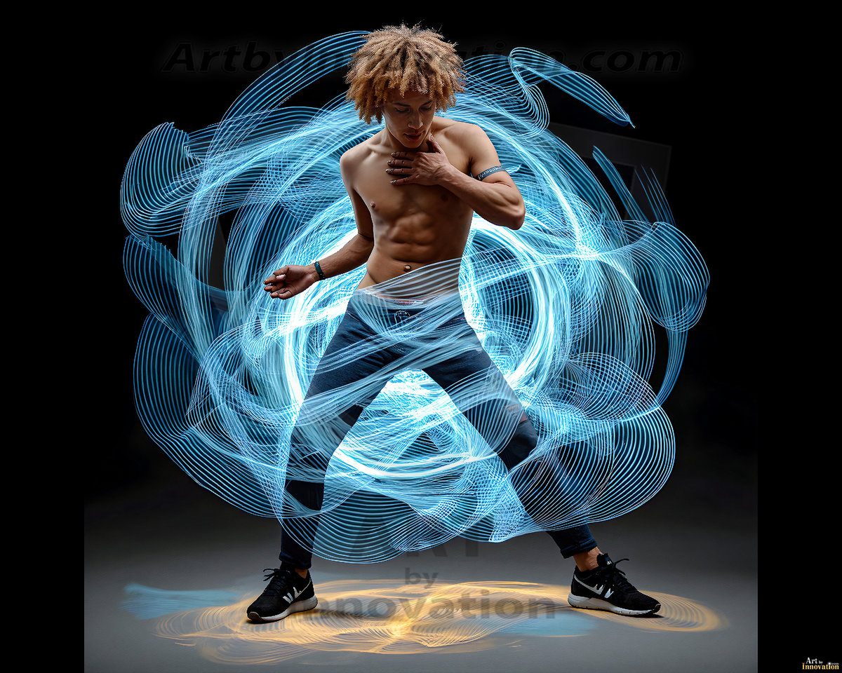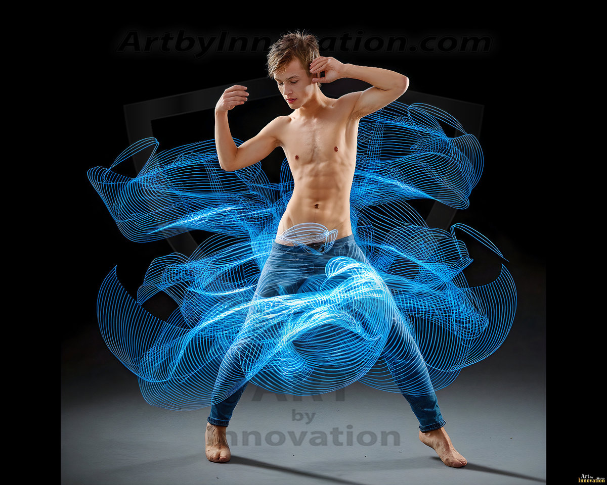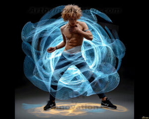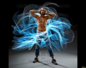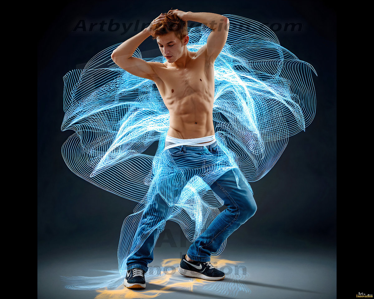 Where elegance and raw energy collide. This AI-generated abstract art collection features handsome, shirtless men dancing with radiant colorful light rays that wrap around their bodies in flowing, otherworldly patterns. The dynamic light trails — yellow, blue, purple, gold — emphasize their movements and add an ethereal fluidity, making each image feel like a moment suspended in time. Part dance, part cosmic phenomenon, entirely mesmerizing. Created using Flux.1, ComfyUI, and Stable Diffusion by © Jeff Dupler | Art by Innovation | https://www.artbyinnovation.com