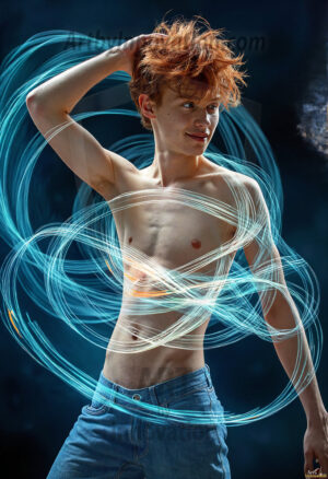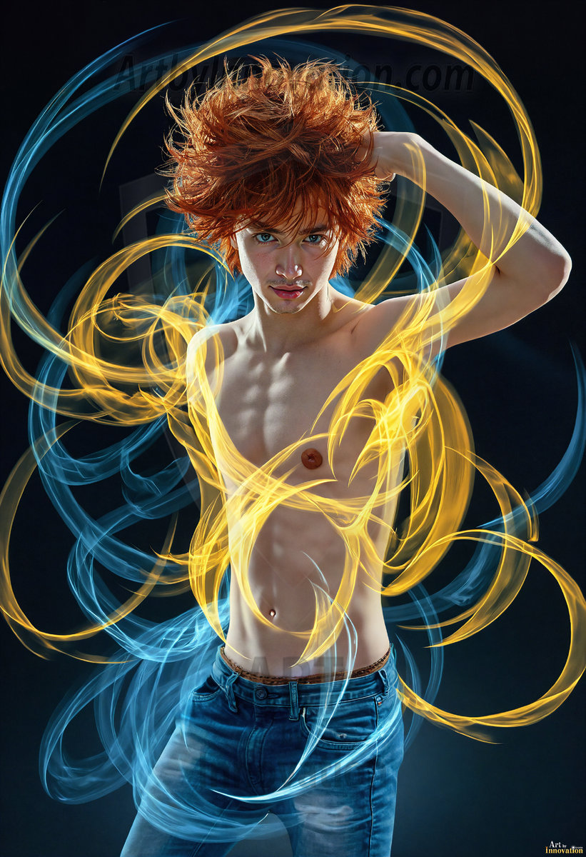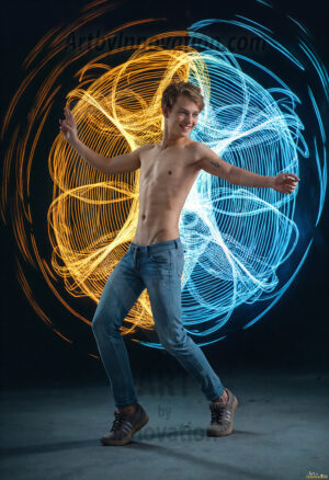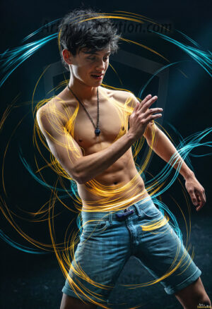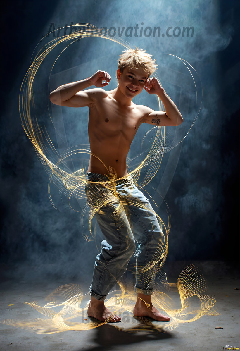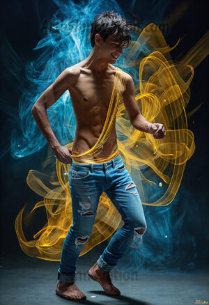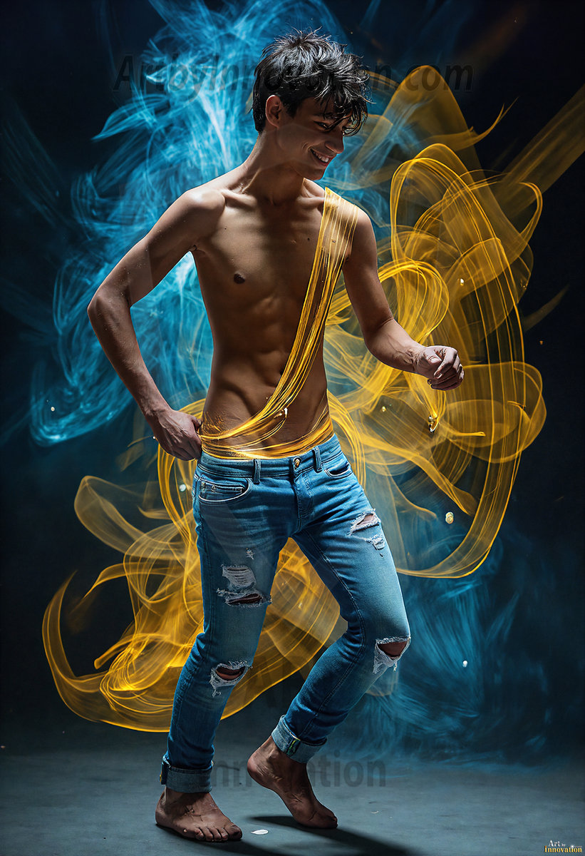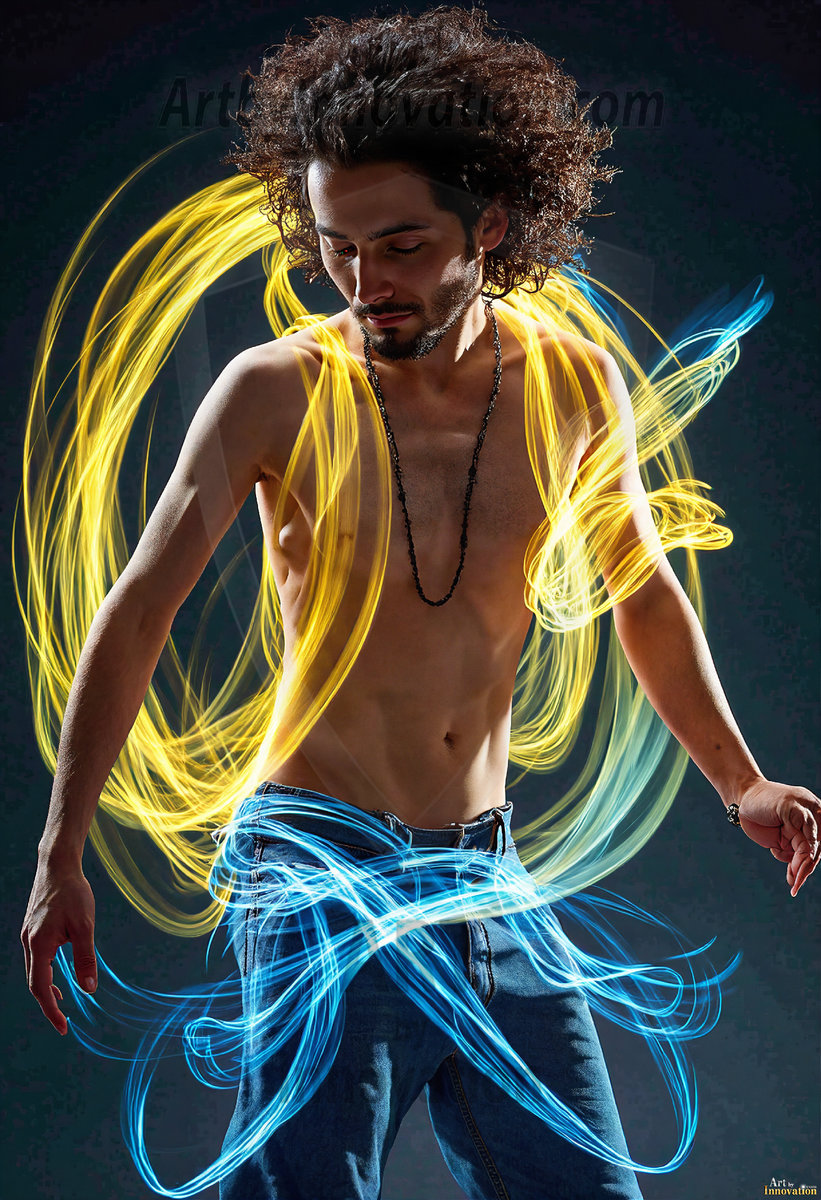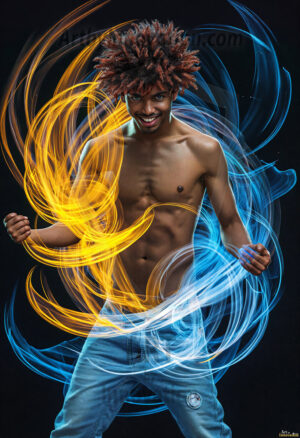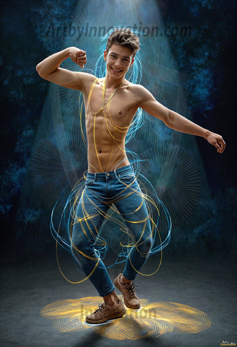 Where elegance and raw energy collide. This AI-generated abstract art collection features handsome, shirtless men dancing with radiant colorful light rays that wrap around their bodies in flowing, otherworldly patterns. The dynamic light trails — yellow, blue, purple, gold — emphasize their movements and add an ethereal fluidity, making each image feel like a moment suspended in time. Part dance, part cosmic phenomenon, entirely mesmerizing. Created using Flux.1, ComfyUI, and Stable Diffusion by © Jeff Dupler | Art by Innovation | https://www.artbyinnovation.com