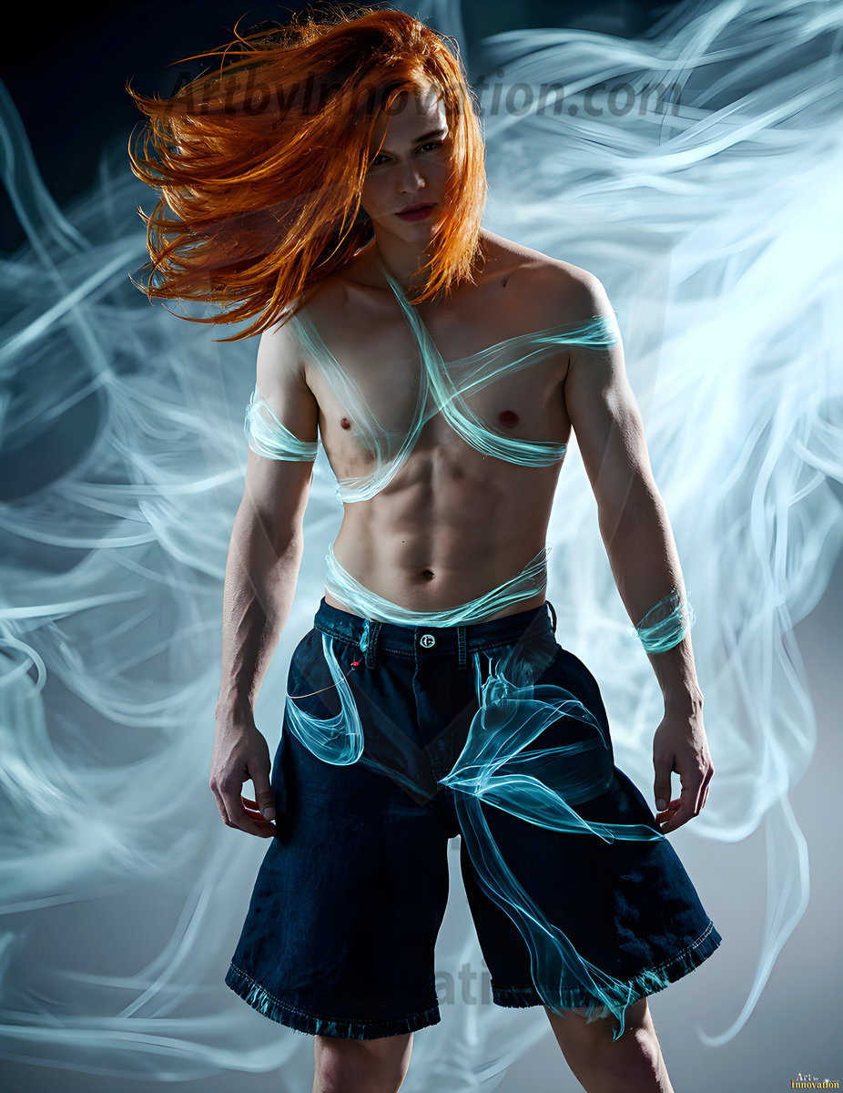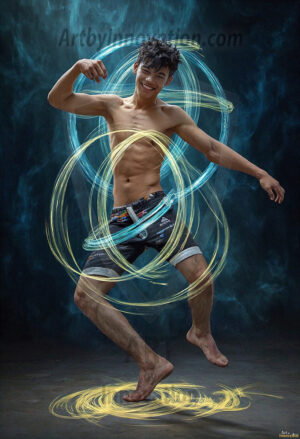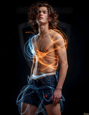 Where elegance and raw energy collide. This AI-generated abstract art collection features handsome, shirtless men dancing with radiant colorful light rays that wrap around their bodies in flowing, otherworldly patterns. The dynamic light trails — yellow, blue, purple, gold — emphasize their movements and add an ethereal fluidity, making each image feel like a moment suspended in time. Part dance, part cosmic phenomenon, entirely mesmerizing. Created using Flux.1, ComfyUI, and Stable Diffusion by © Jeff Dupler | Art by Innovation | https://www.artbyinnovation.com