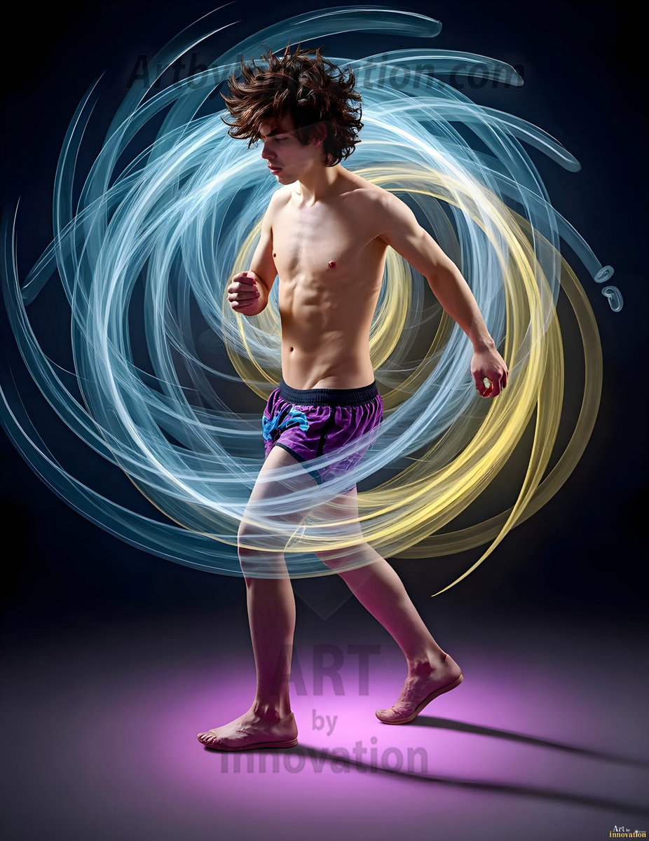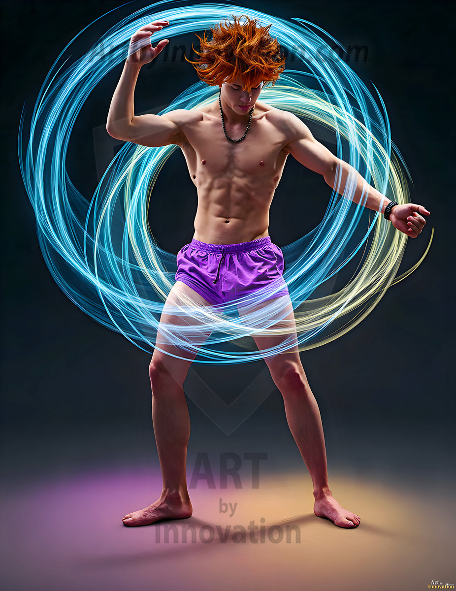 Where elegance and raw energy collide. This AI-generated abstract art collection features handsome, shirtless men dancing with radiant colorful light rays that wrap around their bodies in flowing, otherworldly patterns. The dynamic light trails — yellow, blue, purple, gold — emphasize their movements and add an ethereal fluidity, making each image feel like a moment suspended in time. Part dance, part cosmic phenomenon, entirely mesmerizing. Created using Flux.1, ComfyUI, and Stable Diffusion by © Jeff Dupler | Art by Innovation | https://www.artbyinnovation.com