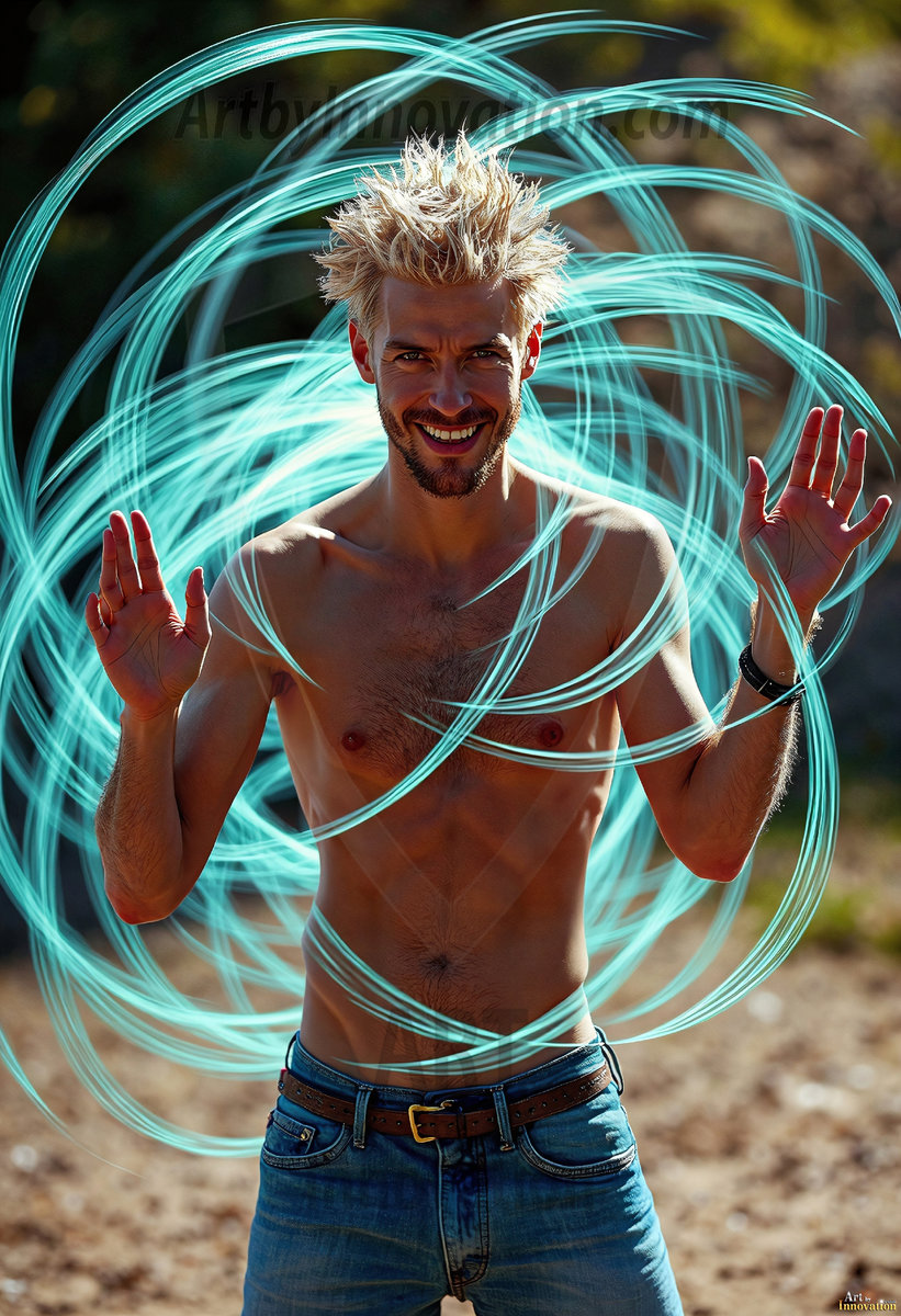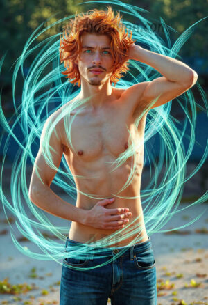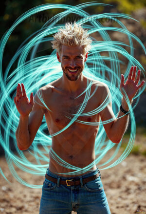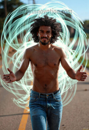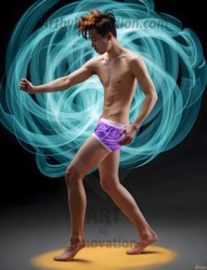Where elegance and raw energy collide. This AI-generated abstract art collection features handsome, shirtless men dancing with radiant colorful light rays that wrap around their bodies in flowing, otherworldly patterns. The dynamic light trails — yellow, blue, purple, gold — emphasize their movements and add an ethereal fluidity, making each image feel like a moment suspended in time. Part dance, part cosmic phenomenon, entirely mesmerizing. Created using Flux.1, ComfyUI, and Stable Diffusion by © Jeff Dupler | Art by Innovation | https://www.artbyinnovation.com
