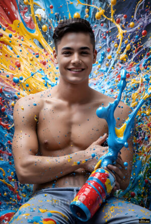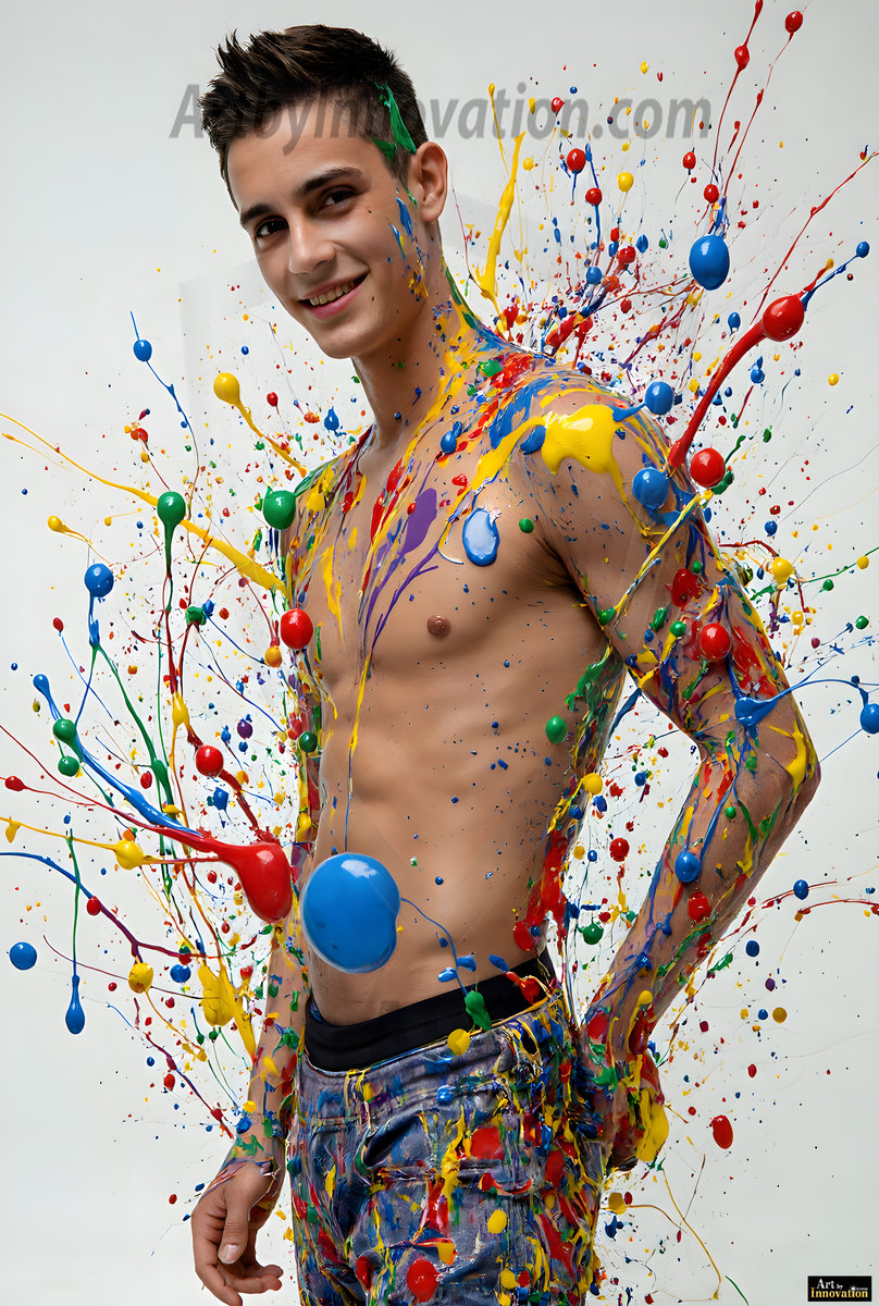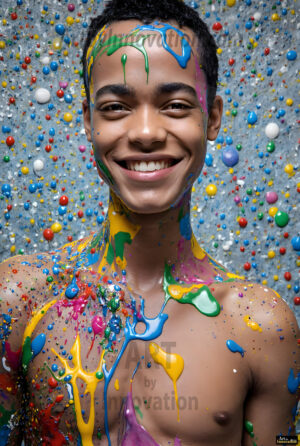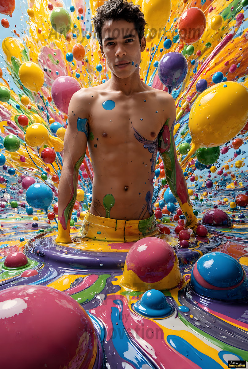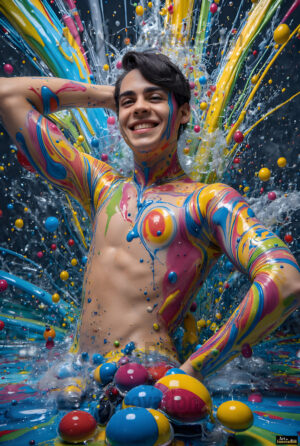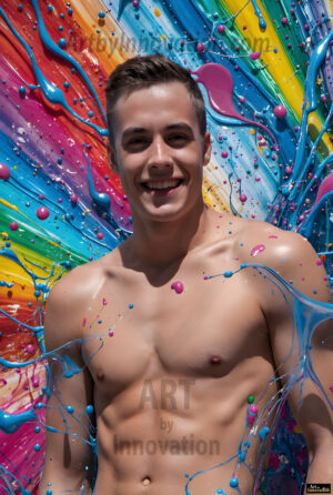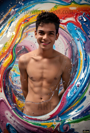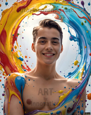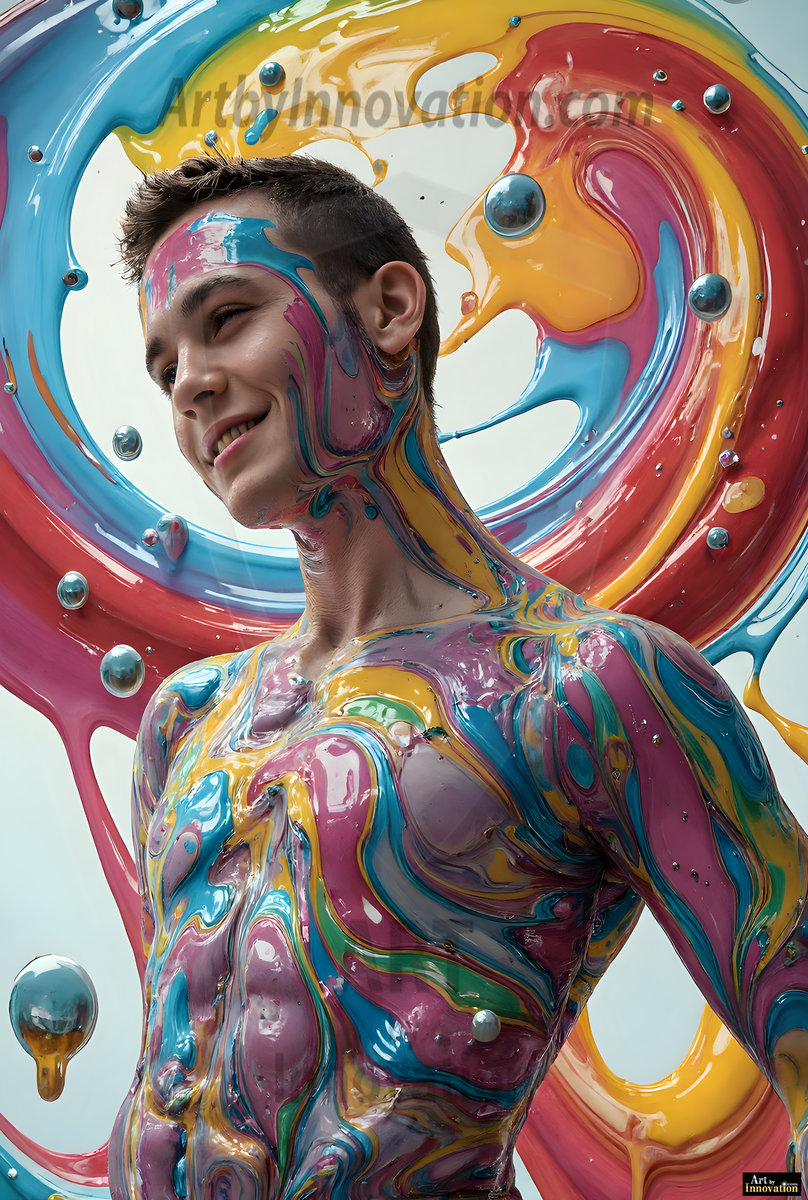 Fluid, dynamic, and breathtaking — this AI-generated abstract art collection captures handsome men in a cosmic dance with colorful liquid and light. Powerful swirls of vibrant, iridescent fluid erupt and cascade around them, forming swirling vortexes of rainbow color that respond to their every movement. Part fantasy, part surrealism, and entirely extraordinary. Created using Flux.1, ComfyUI, and Stable Diffusion by © Jeff Dupler | Art by Innovation | https://www.artbyinnovation.com