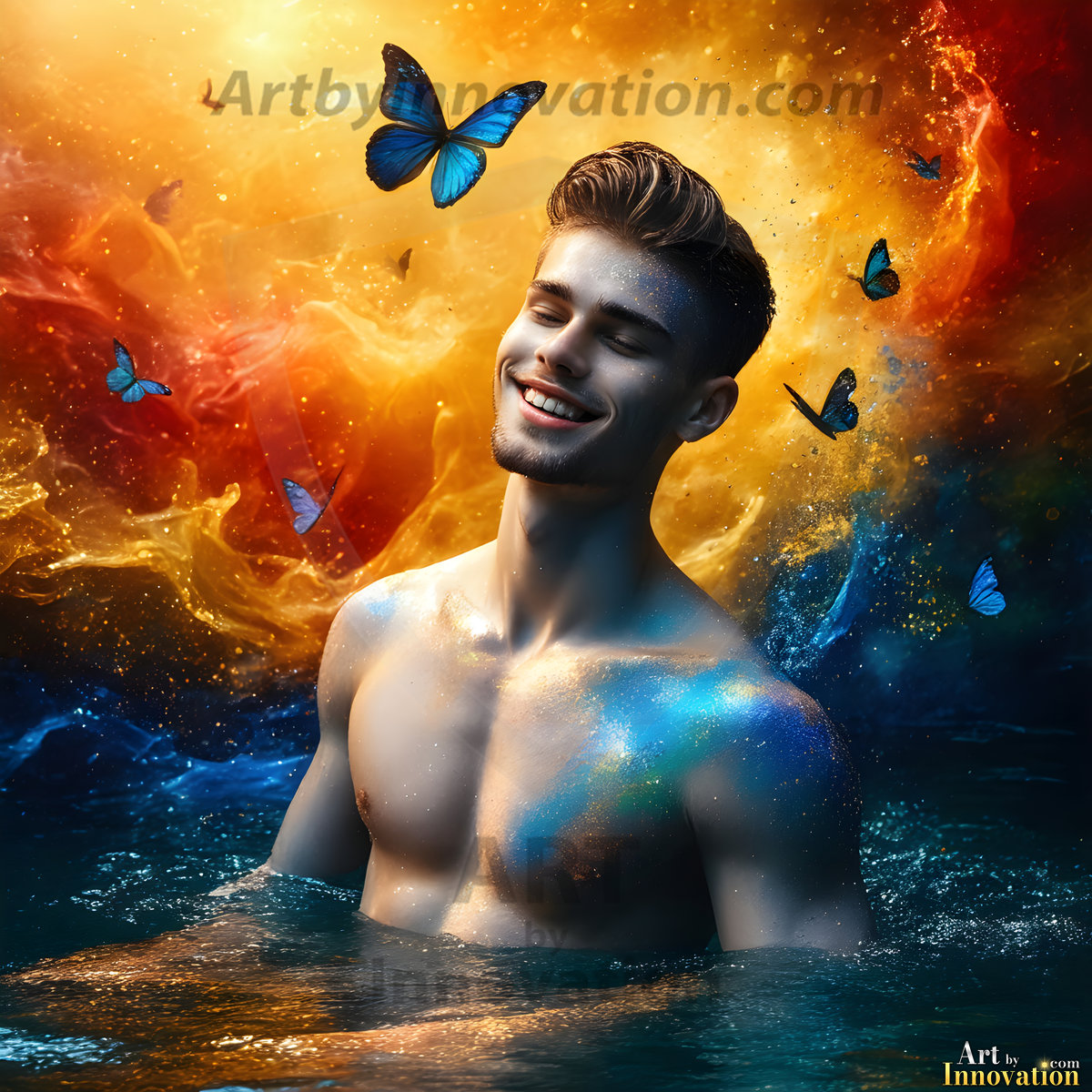 Beauty meets color in this stunning AI-generated abstract art collection. Handsome, shirtless men are enveloped from behind by vibrant, swirling translucent mists of color — inspired by the full spectrum of the rainbow, and the joyful palette of Pride. Each image combines photorealistic skin texture with surreal abstract color dynamics, creating a visual experience that is both deeply human and otherworldly. Created using Flux.1, ComfyUI, and Stable Diffusion by © Jeff Dupler | Art by Innovation | https://www.artbyinnovation.com