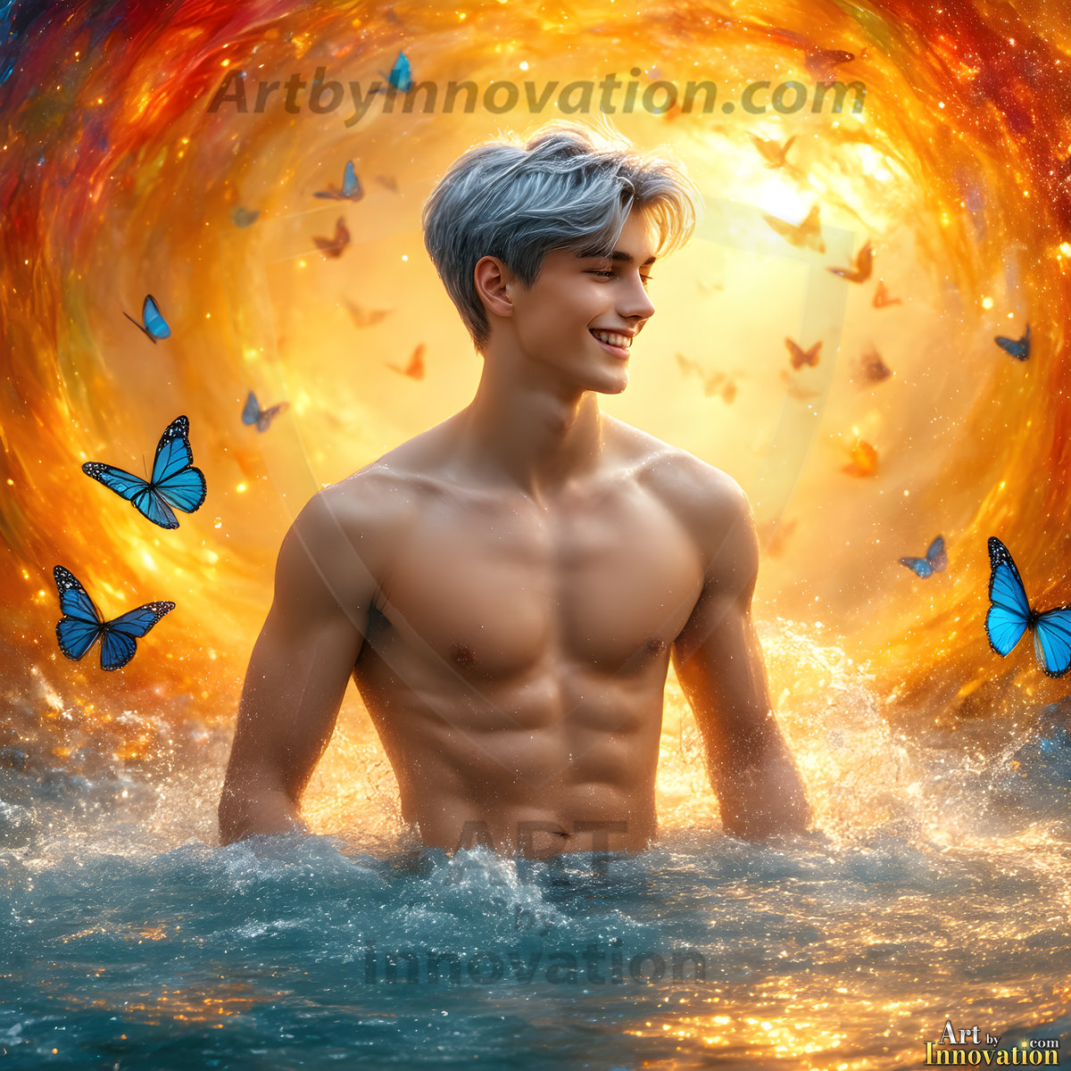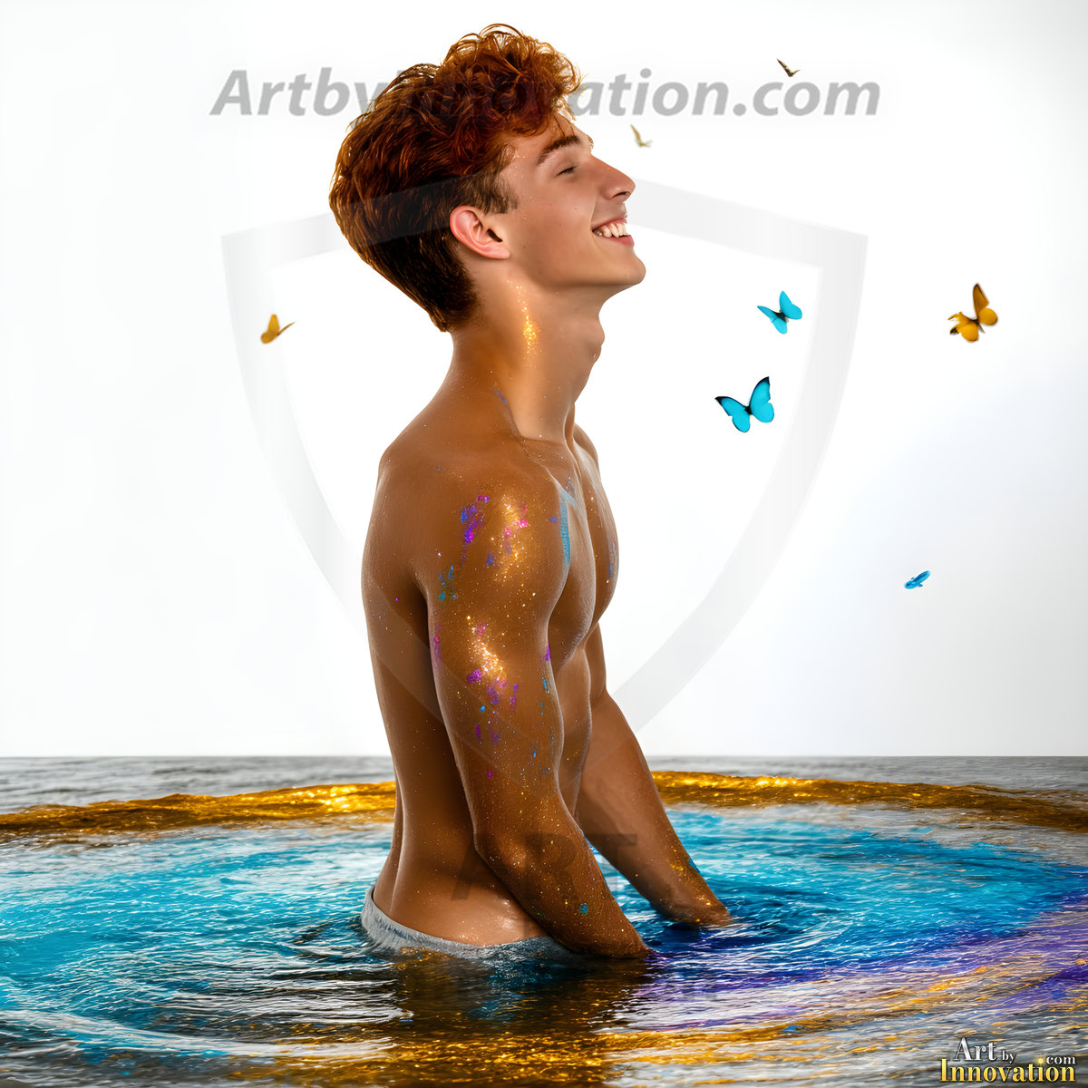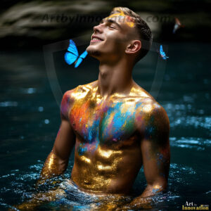Beauty meets color in this stunning AI-generated abstract art collection. Handsome, shirtless men are enveloped from behind by vibrant, swirling translucent mists of color — inspired by the full spectrum of the rainbow, and the joyful palette of Pride. Each image combines photorealistic skin texture with surreal abstract color dynamics, creating a visual experience that is both deeply human and otherworldly. Created using Flux.1, ComfyUI, and Stable Diffusion by © Jeff Dupler | Art by Innovation | https://www.artbyinnovation.com