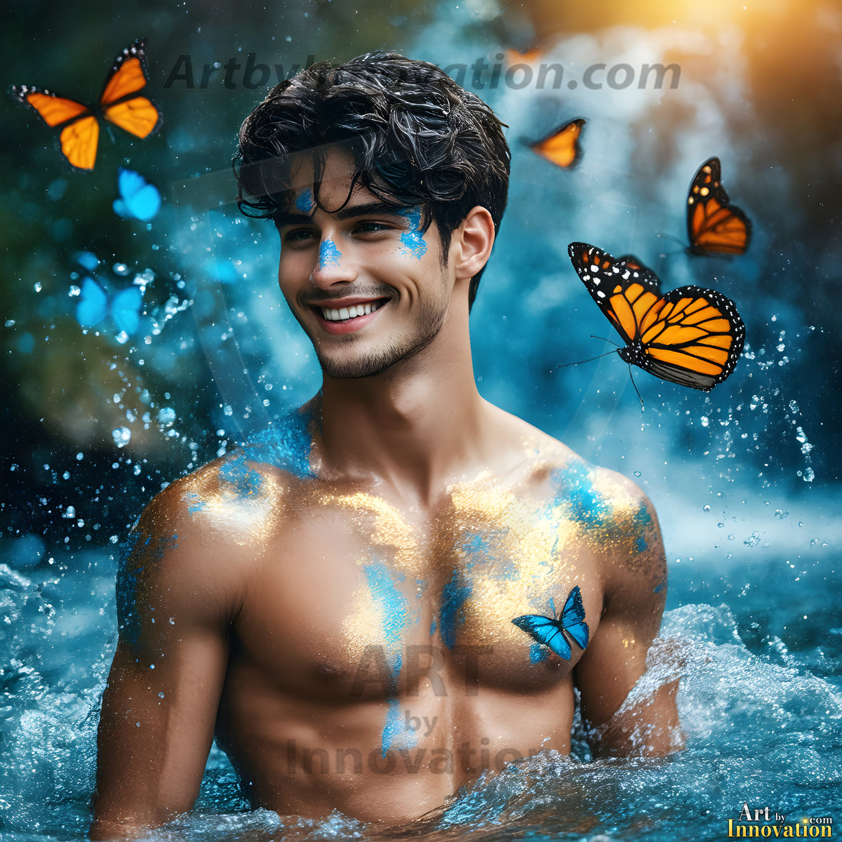 ByjeffThe Beautiful & Handsome Men Art Collection, is a collection of AI generated images of sexy, shirtless, glamorous, handsome guys. In these AI-generated male art HD photos, include guys of all ages just doing random activities, like hiking, camping, and dancing. Generated to be as realistic as possible, with todays technology.