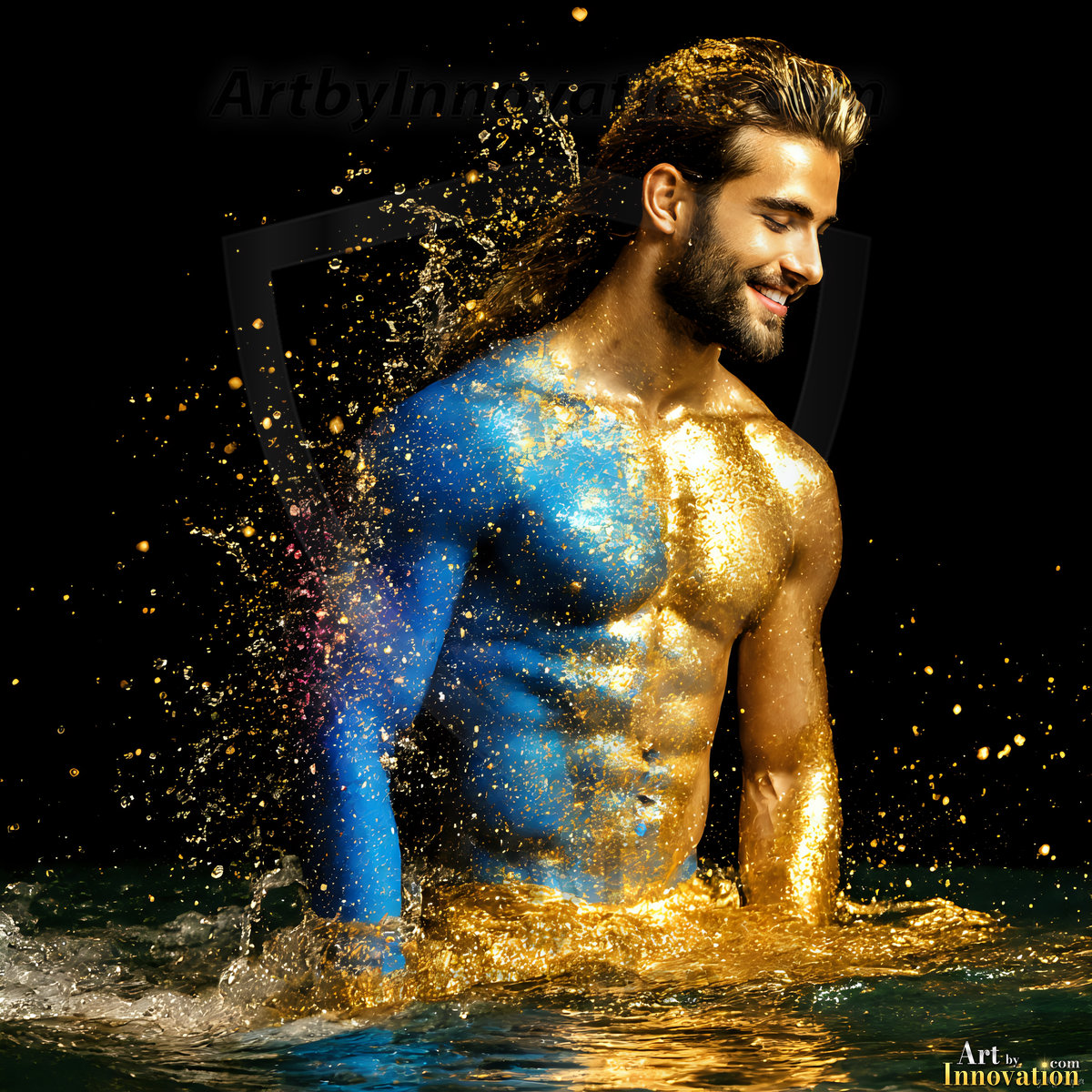 Beauty meets color in this stunning AI-generated abstract art collection. Handsome, shirtless men are enveloped from behind by vibrant, swirling translucent mists of color — inspired by the full spectrum of the rainbow, and the joyful palette of Pride. Each image combines photorealistic skin texture with surreal abstract color dynamics, creating a visual experience that is both deeply human and otherworldly. Created using Flux.1, ComfyUI, and Stable Diffusion by © Jeff Dupler | Art by Innovation | https://www.artbyinnovation.com
