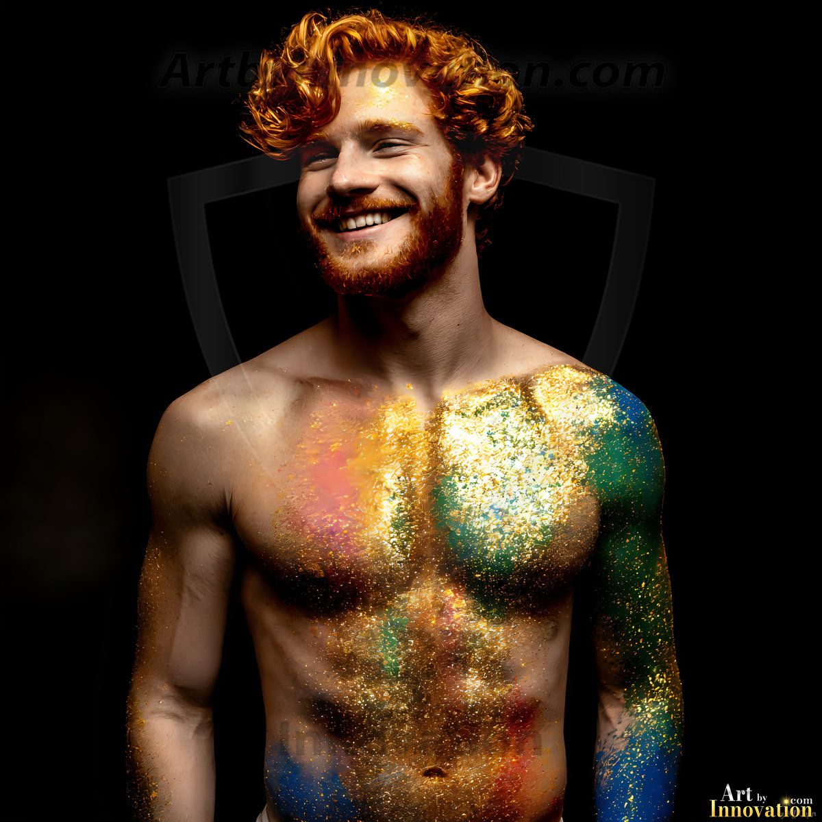 ByjeffAI-generated abstract art — hot handsome men covered in colorful body paint explosions, full of joy and rainbow color.