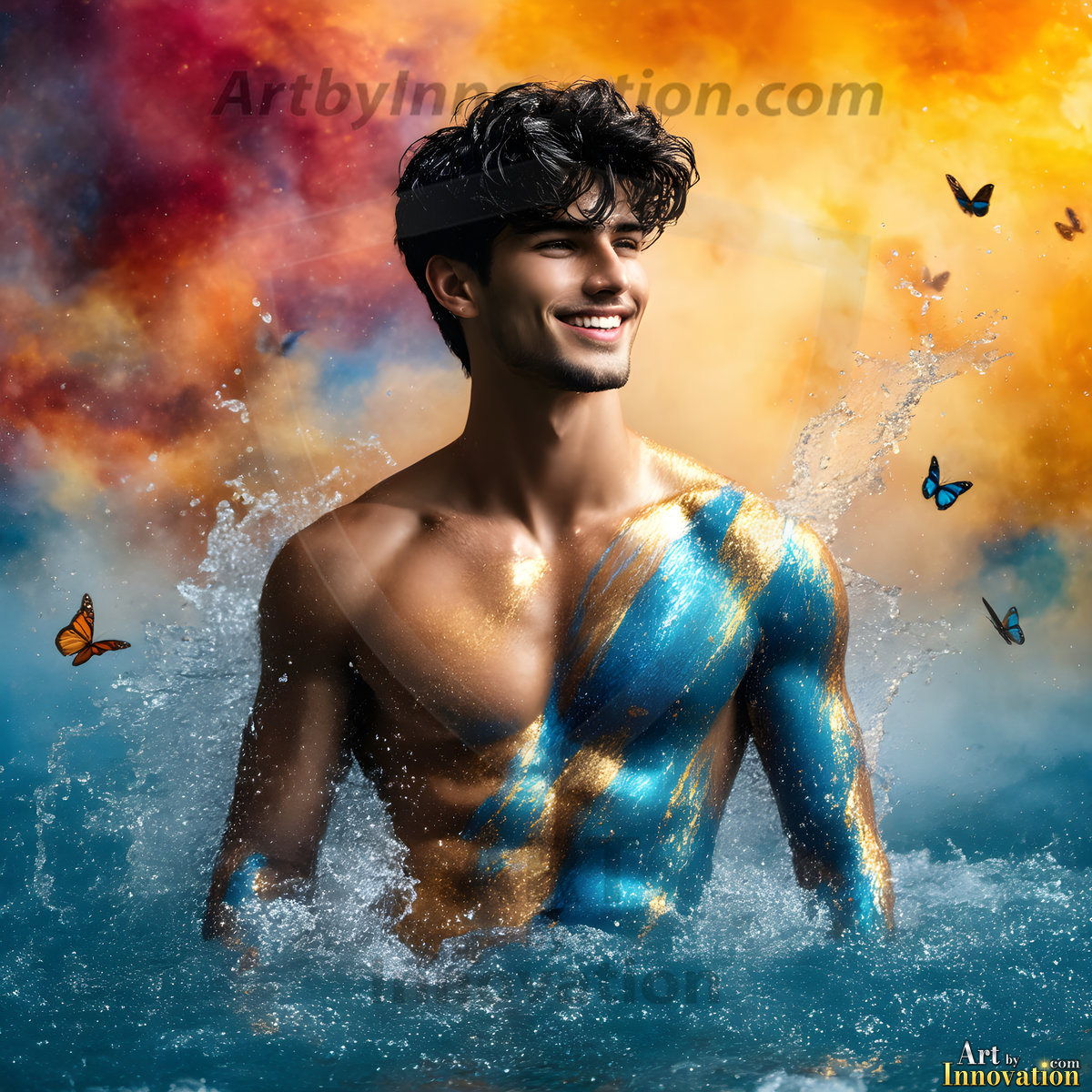 Beauty meets color in this stunning AI-generated abstract art collection. Handsome, shirtless men are enveloped from behind by vibrant, swirling translucent mists of color — inspired by the full spectrum of the rainbow, and the joyful palette of Pride. Each image combines photorealistic skin texture with surreal abstract color dynamics, creating a visual experience that is both deeply human and otherworldly. Created using Flux.1, ComfyUI, and Stable Diffusion by © Jeff Dupler | Art by Innovation | https://www.artbyinnovation.com