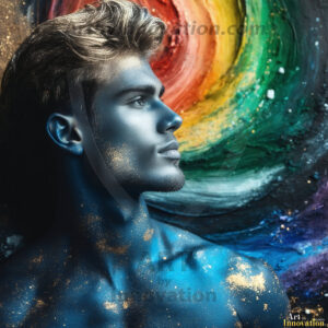 Beauty meets color in this stunning AI-generated abstract art collection. Handsome, shirtless men are enveloped from behind by vibrant, swirling translucent mists of color — inspired by the full spectrum of the rainbow, and the joyful palette of Pride. Each image combines photorealistic skin texture with surreal abstract color dynamics, creating a visual experience that is both deeply human and otherworldly. Created using Flux.1, ComfyUI, and Stable Diffusion by © Jeff Dupler | Art by Innovation | https://www.artbyinnovation.com