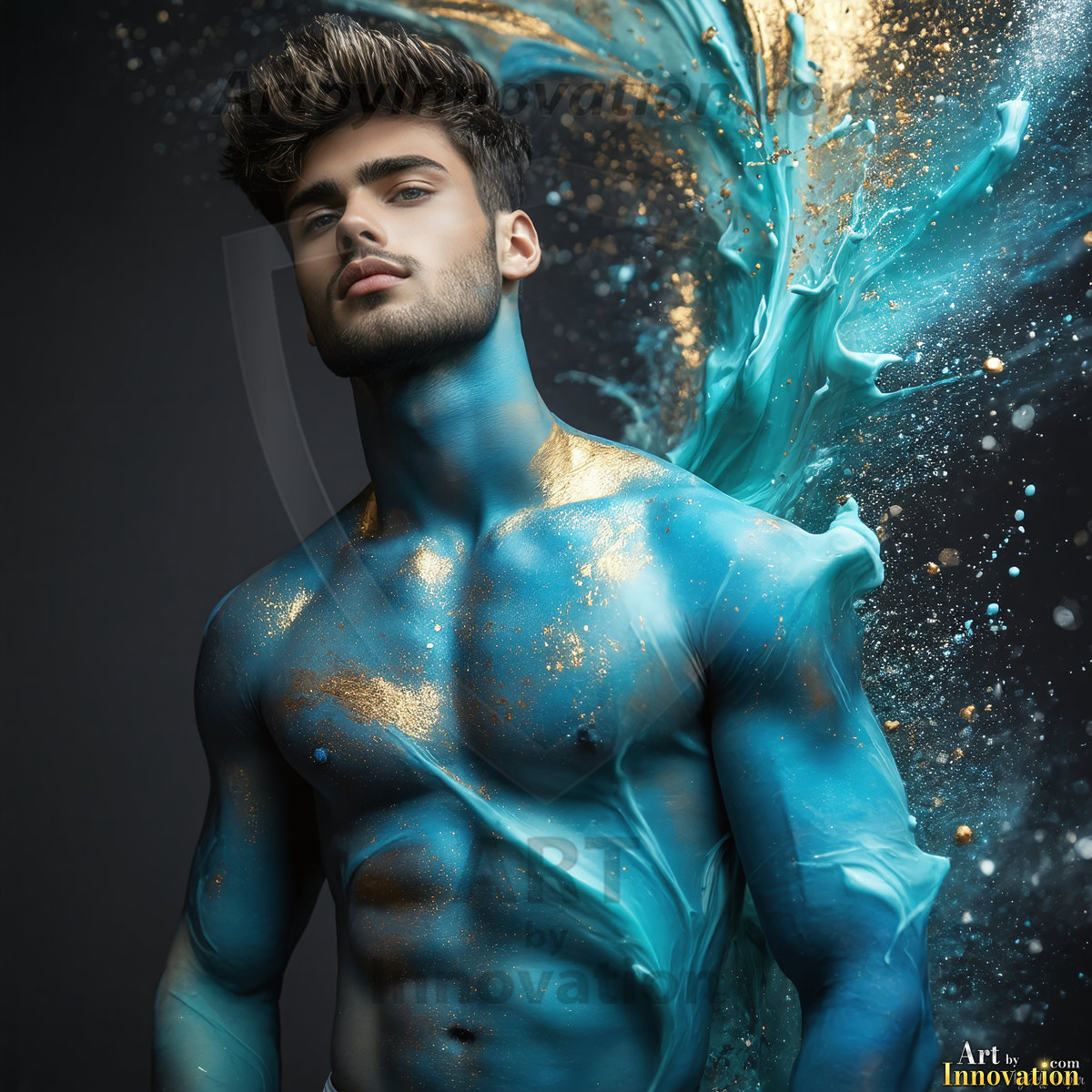 ByjeffAI-generated abstract art — hot handsome men covered in colorful body paint explosions, full of joy and rainbow color.