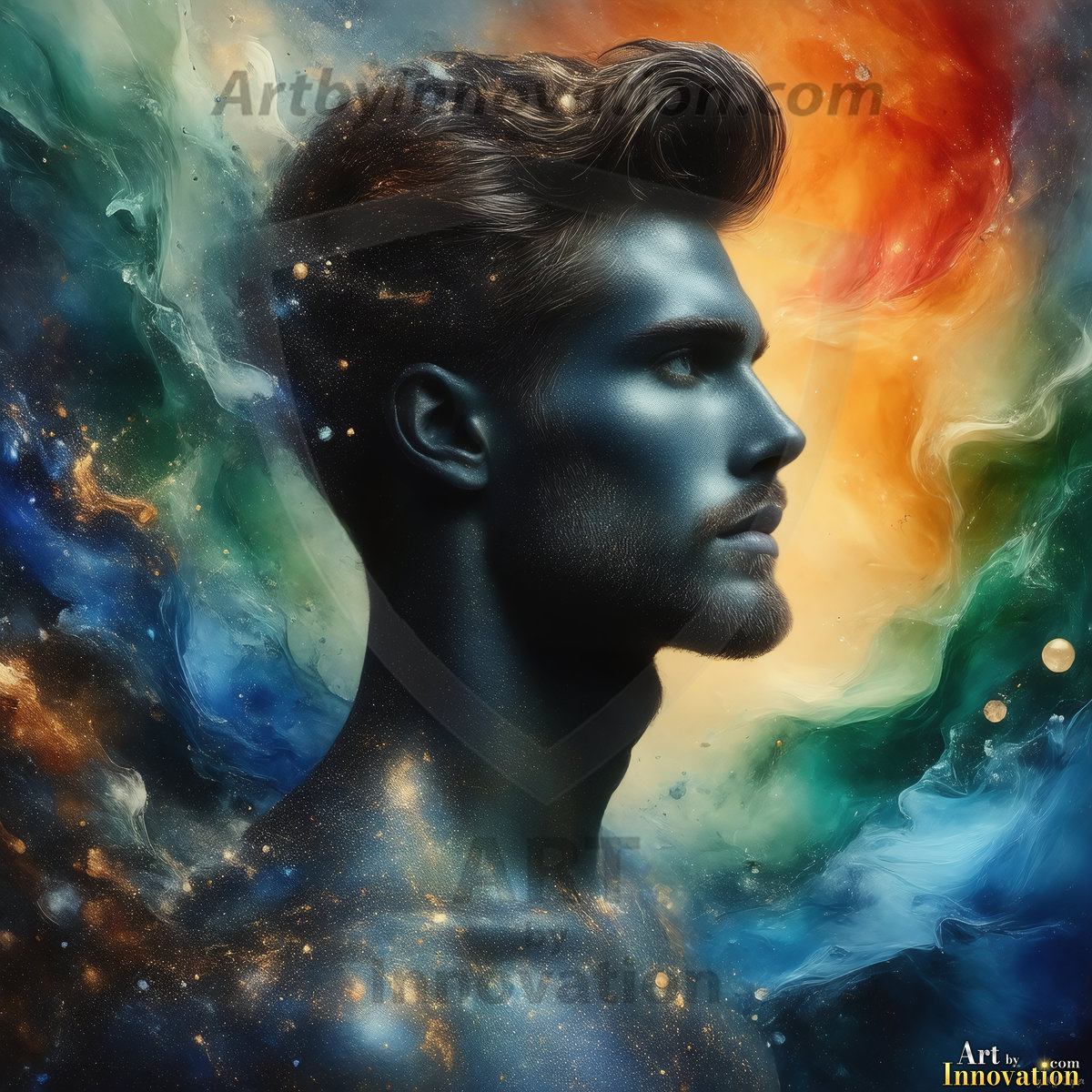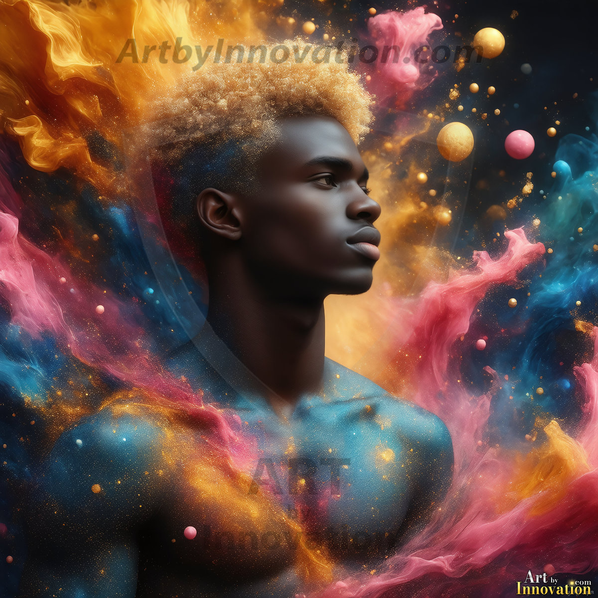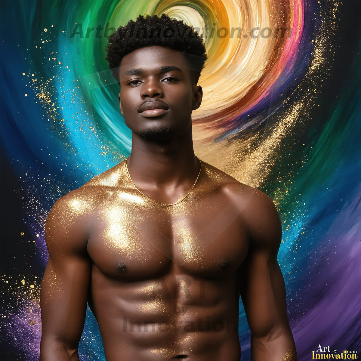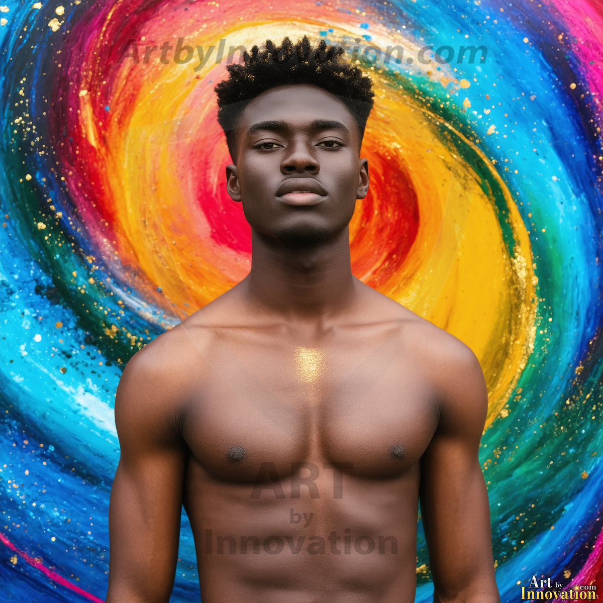 Beauty meets color in this stunning AI-generated abstract art collection. Handsome, shirtless men are enveloped from behind by vibrant, swirling translucent mists of color — inspired by the full spectrum of the rainbow, and the joyful palette of Pride. Each image combines photorealistic skin texture with surreal abstract color dynamics, creating a visual experience that is both deeply human and otherworldly. Created using Flux.1, ComfyUI, and Stable Diffusion by © Jeff Dupler | Art by Innovation | https://www.artbyinnovation.com