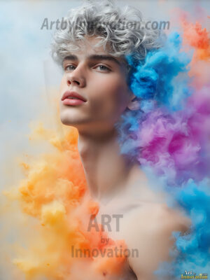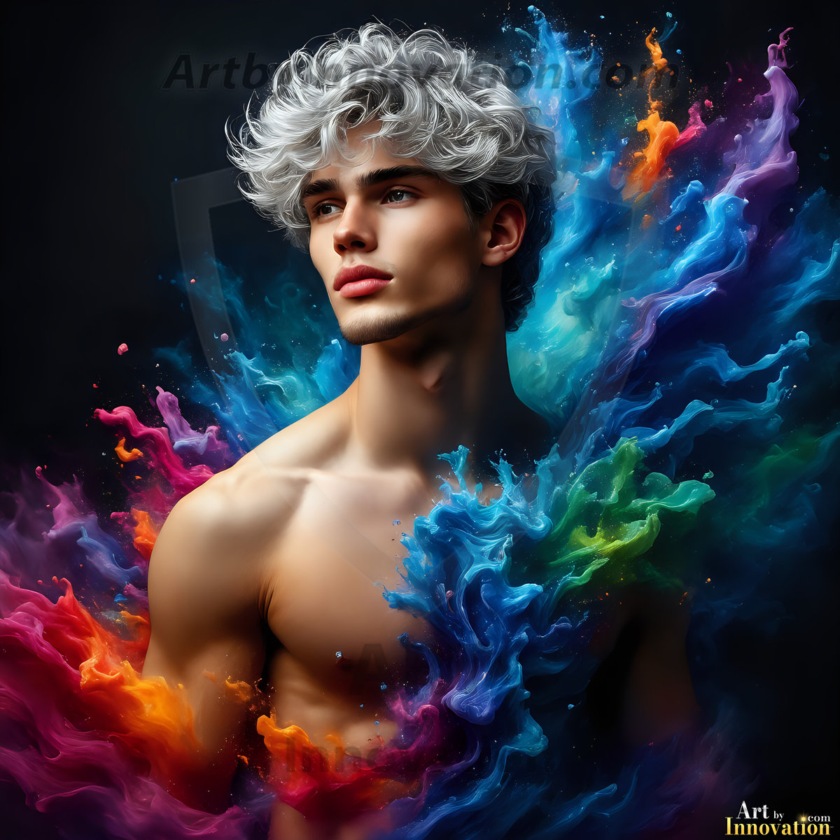 Beauty meets color in this stunning AI-generated abstract art collection. Handsome, shirtless men are enveloped from behind by vibrant, swirling translucent mists of color — inspired by the full spectrum of the rainbow, and the joyful palette of Pride. Each image combines photorealistic skin texture with surreal abstract color dynamics, creating a visual experience that is both deeply human and otherworldly. Created using Flux.1, ComfyUI, and Stable Diffusion by © Jeff Dupler | Art by Innovation | https://www.artbyinnovation.com