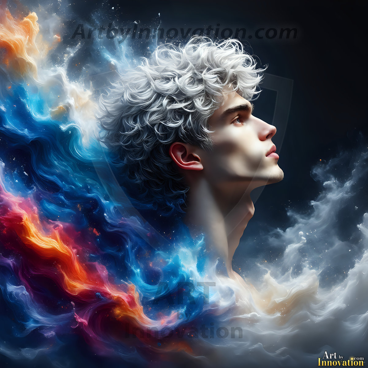 ByjeffAI-generated abstract art — beautiful handsome men enveloped by swirling vibrant rainbow color clouds and mists.