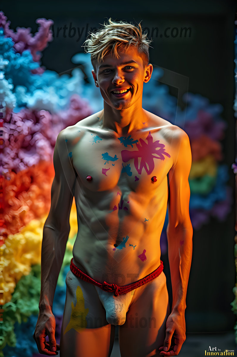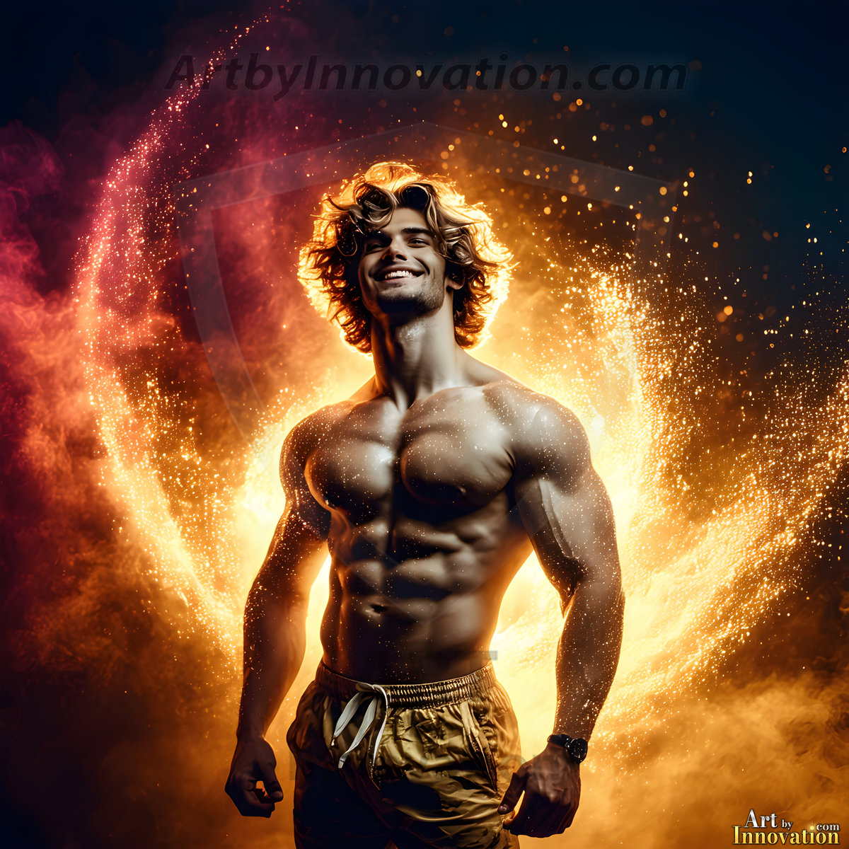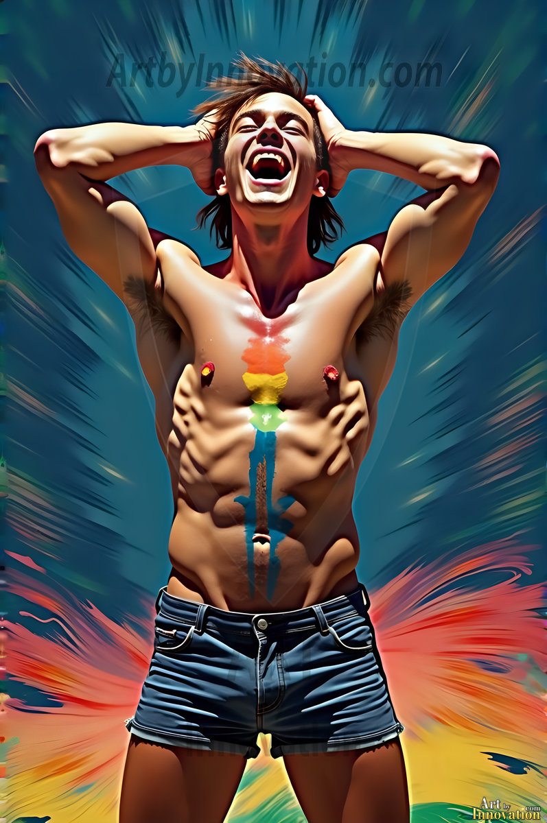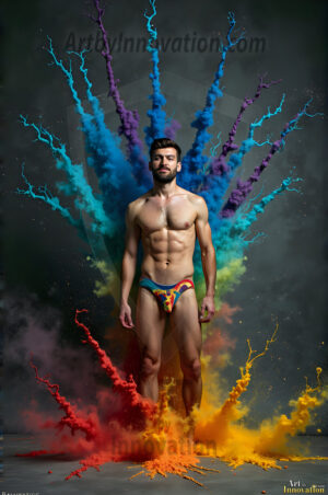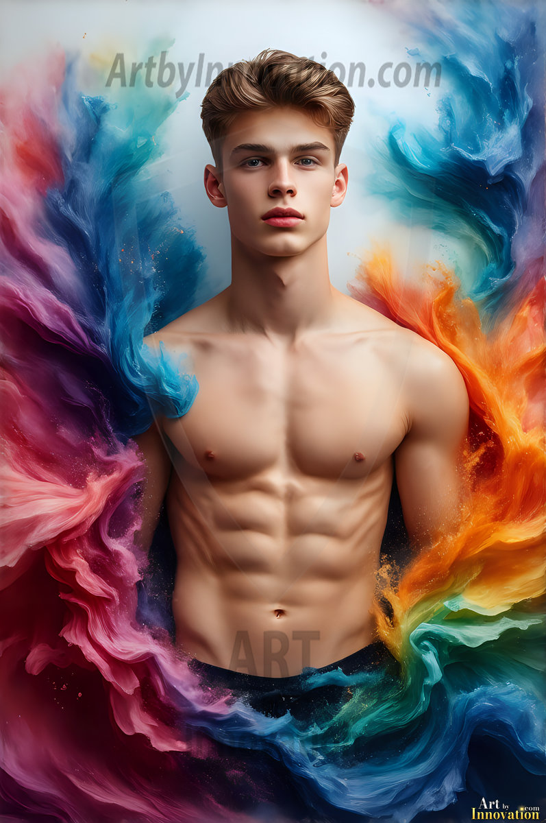 Beauty meets color in this stunning AI-generated abstract art collection. Handsome, shirtless men are enveloped from behind by vibrant, swirling translucent mists of color — inspired by the full spectrum of the rainbow, and the joyful palette of Pride. Each image combines photorealistic skin texture with surreal abstract color dynamics, creating a visual experience that is both deeply human and otherworldly. Created using Flux.1, ComfyUI, and Stable Diffusion by © Jeff Dupler | Art by Innovation | https://www.artbyinnovation.com
