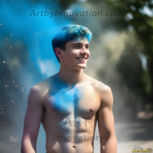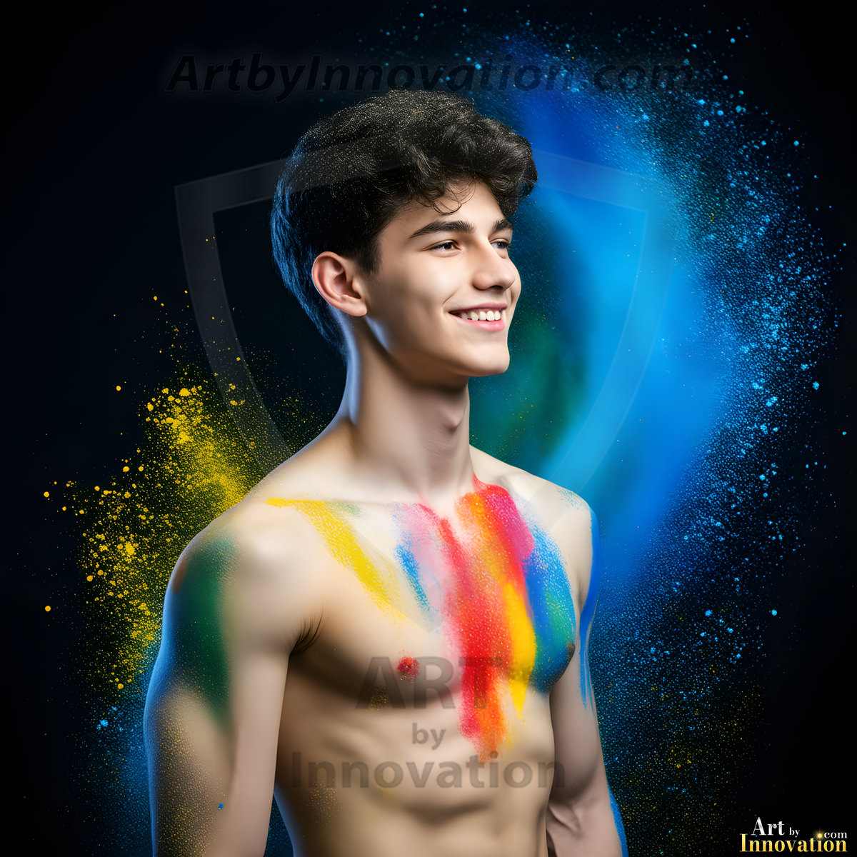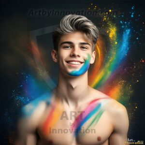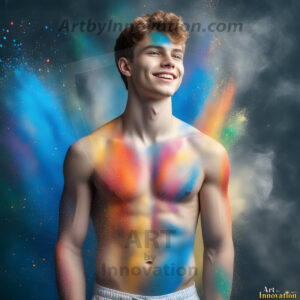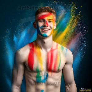 ByjeffAI-generated abstract art — hot handsome men covered in colorful body paint explosions, full of joy and rainbow color.