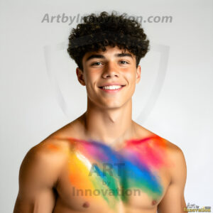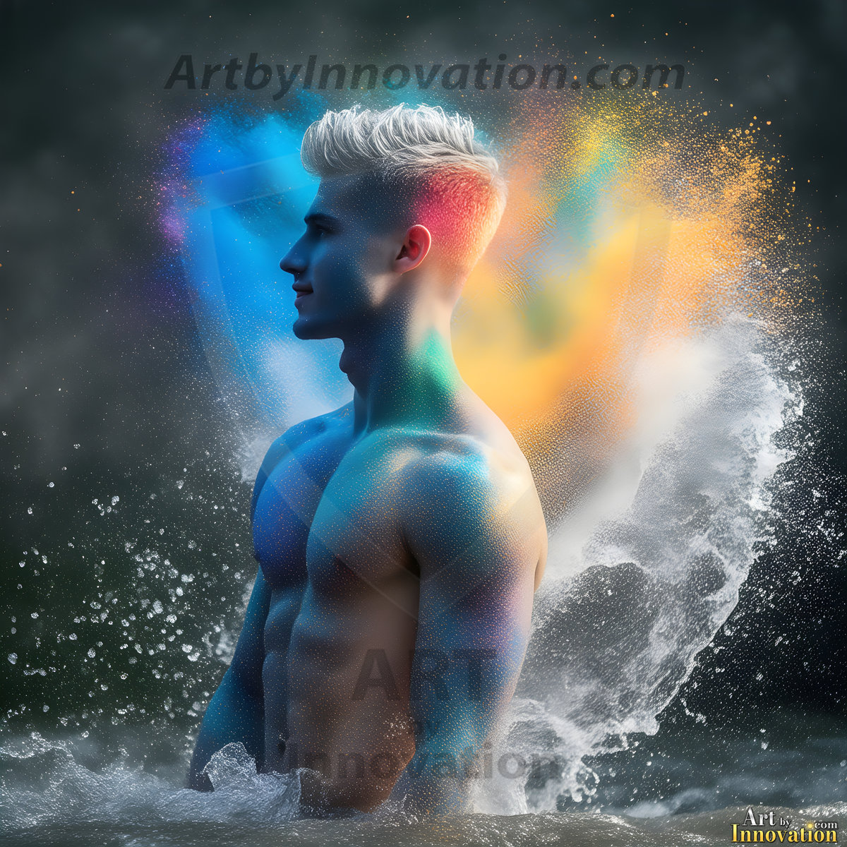 Beauty meets color in this stunning AI-generated abstract art collection. Handsome, shirtless men are enveloped from behind by vibrant, swirling translucent mists of color — inspired by the full spectrum of the rainbow, and the joyful palette of Pride. Each image combines photorealistic skin texture with surreal abstract color dynamics, creating a visual experience that is both deeply human and otherworldly. Created using Flux.1, ComfyUI, and Stable Diffusion by © Jeff Dupler | Art by Innovation | https://www.artbyinnovation.com