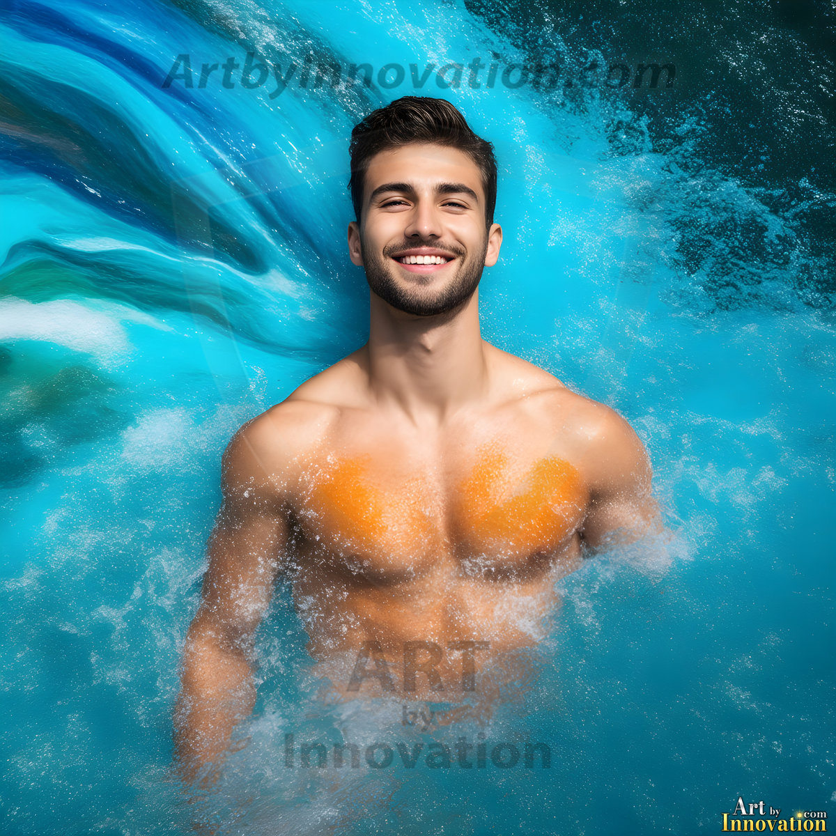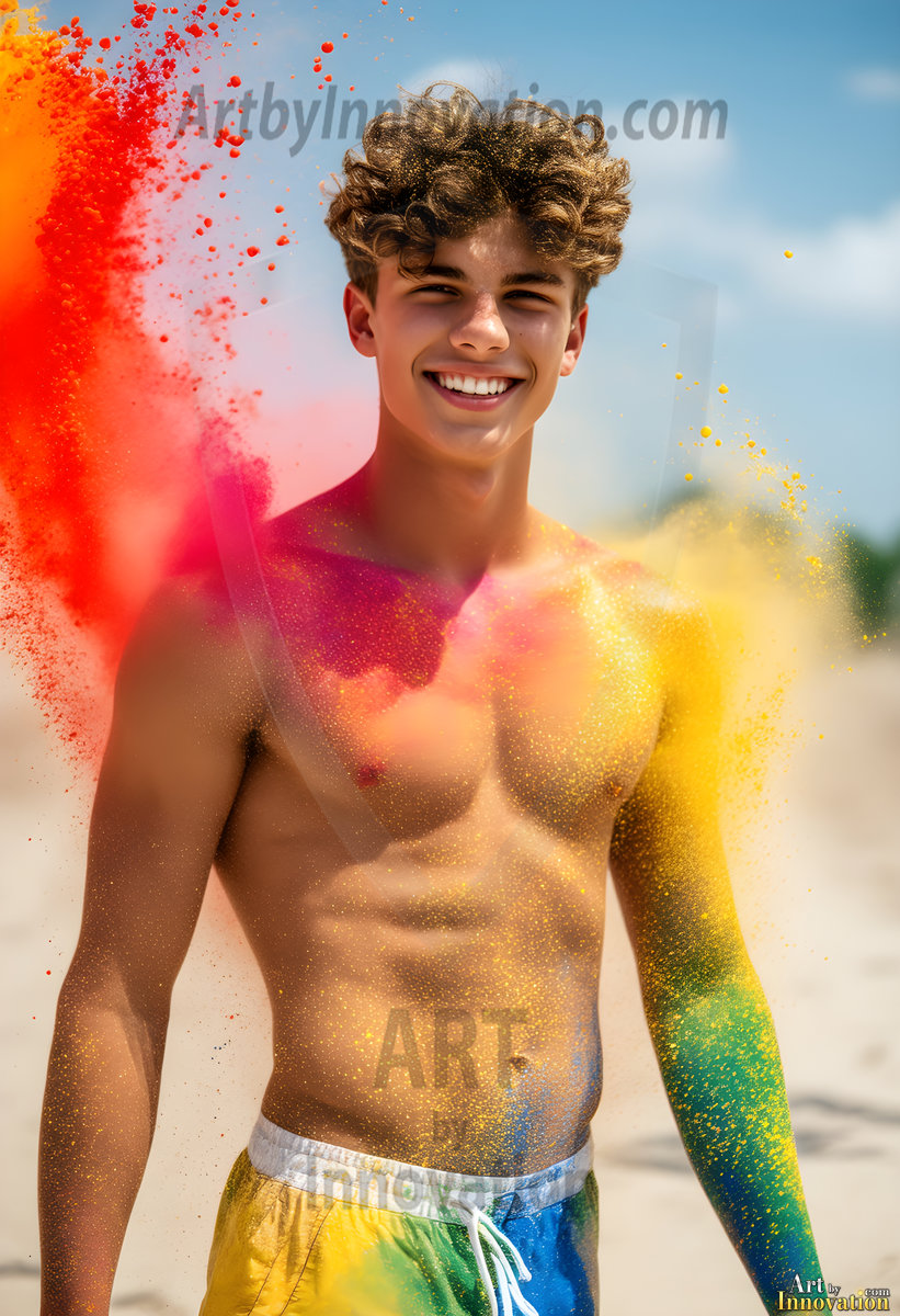 Beauty meets color in this stunning AI-generated abstract art collection. Handsome, shirtless men are enveloped from behind by vibrant, swirling translucent mists of color — inspired by the full spectrum of the rainbow, and the joyful palette of Pride. Each image combines photorealistic skin texture with surreal abstract color dynamics, creating a visual experience that is both deeply human and otherworldly. Created using Flux.1, ComfyUI, and Stable Diffusion by © Jeff Dupler | Art by Innovation | https://www.artbyinnovation.com