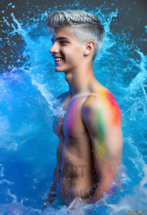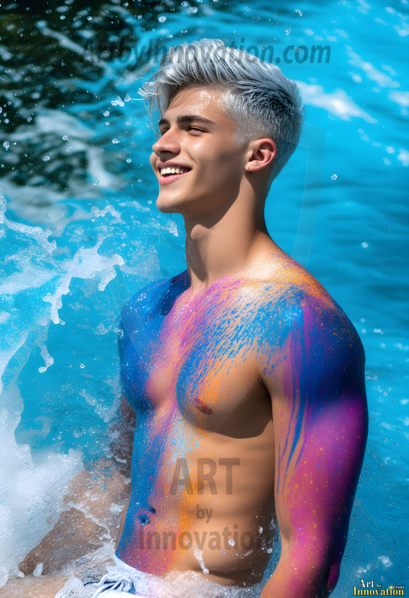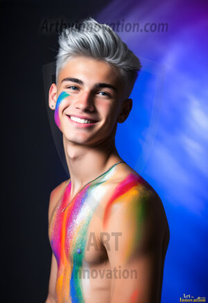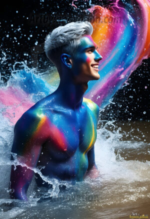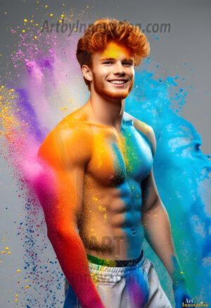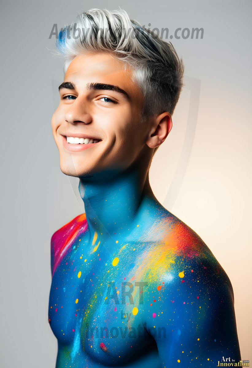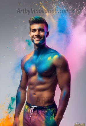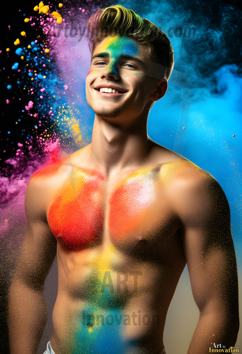 ByjeffAI-generated abstract art — hot handsome men covered in colorful body paint explosions, full of joy and rainbow color.